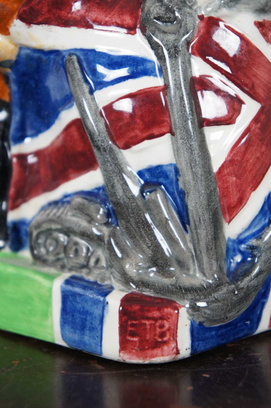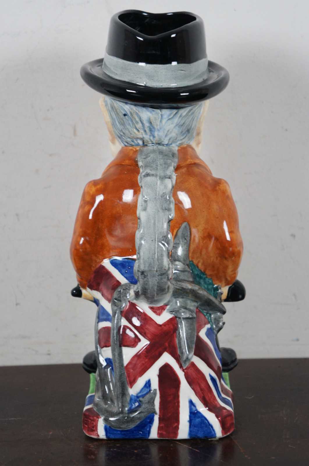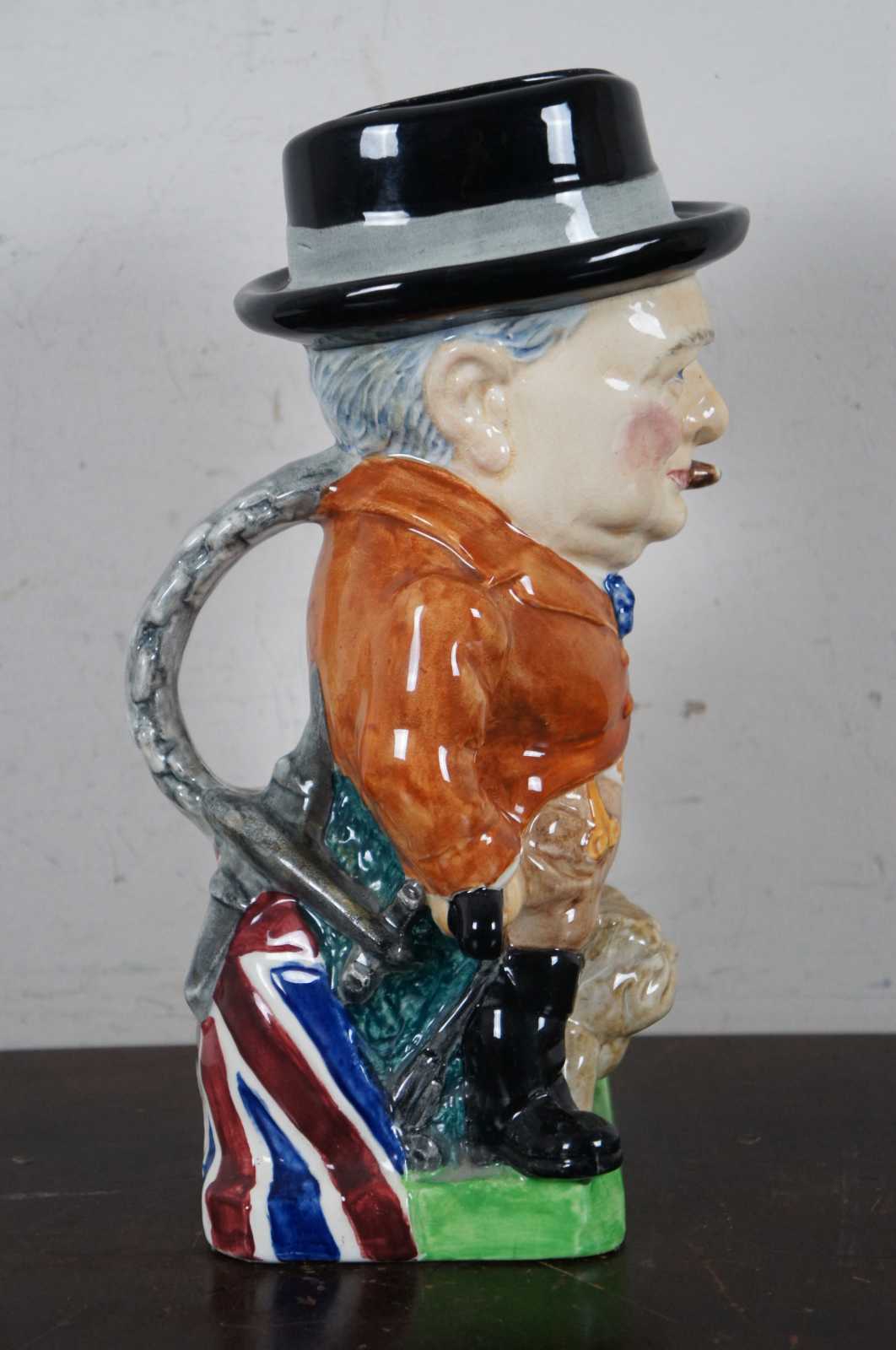 Antique 1940’s Burleigh Ware porcelain John Bull Winston Churchill Bulldogs toby character jug, mug or stein featuring Churchill standing with top hat and umbrella over a bulldog, backed by a UK flag, fighter jet, tank and ship’s anchor.