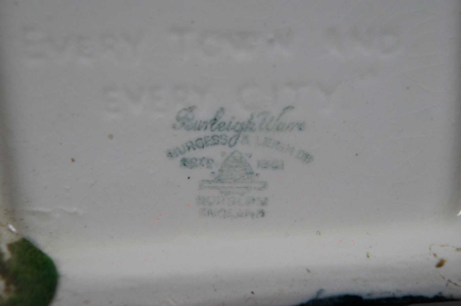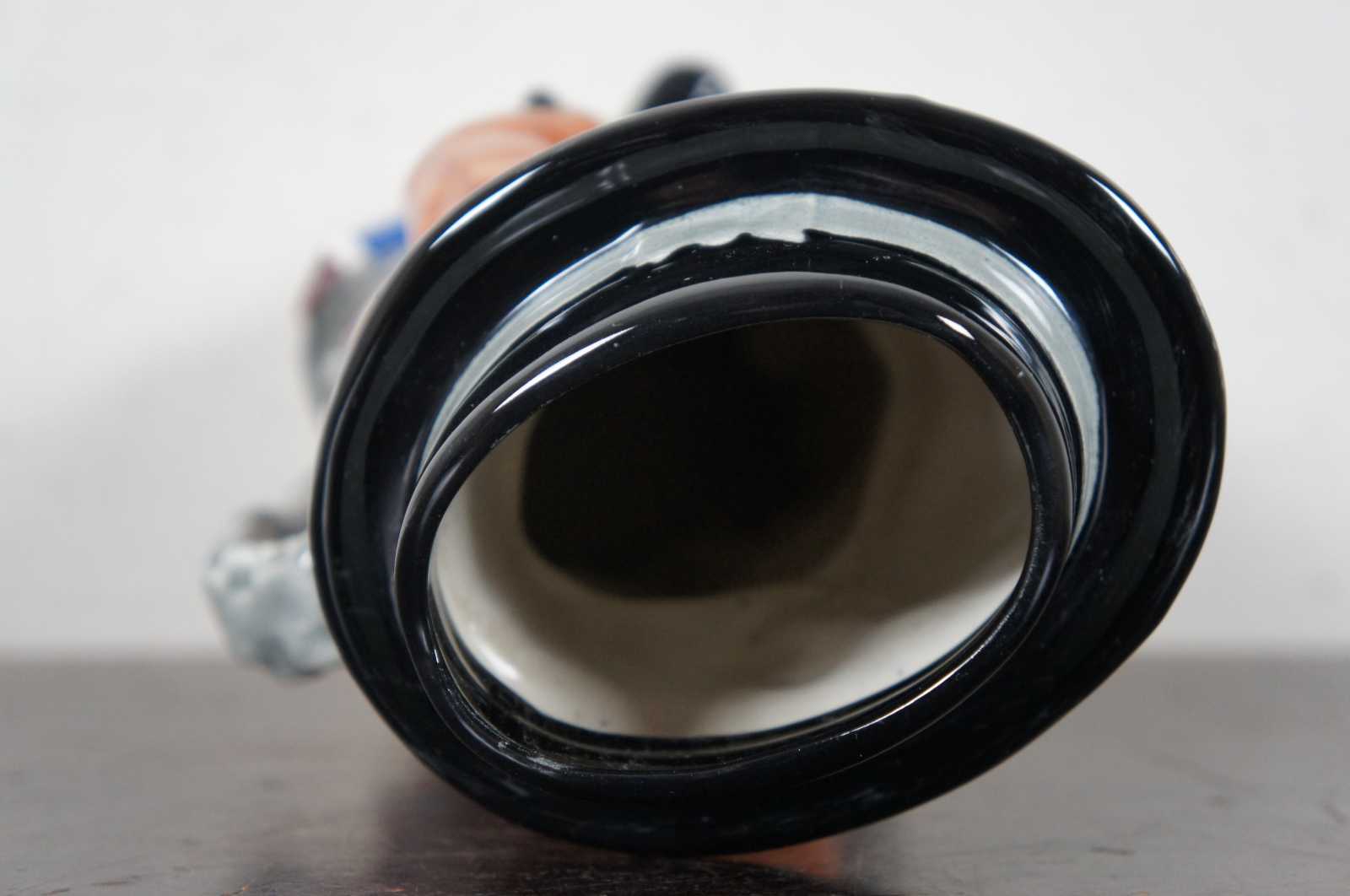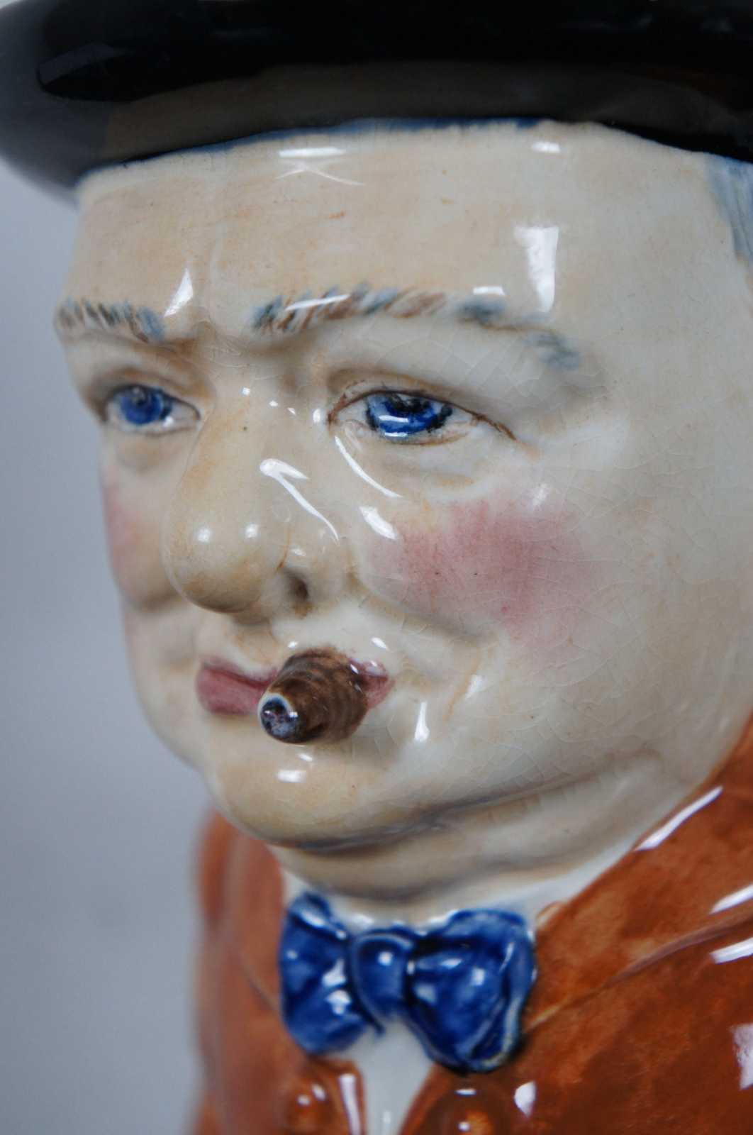 Antique 1940’s Burleigh Ware porcelain John Bull Winston Churchill Bulldogs toby character jug, mug or stein featuring Churchill standing with top hat and umbrella over a bulldog, backed by a UK flag, fighter jet, tank and ship’s anchor.