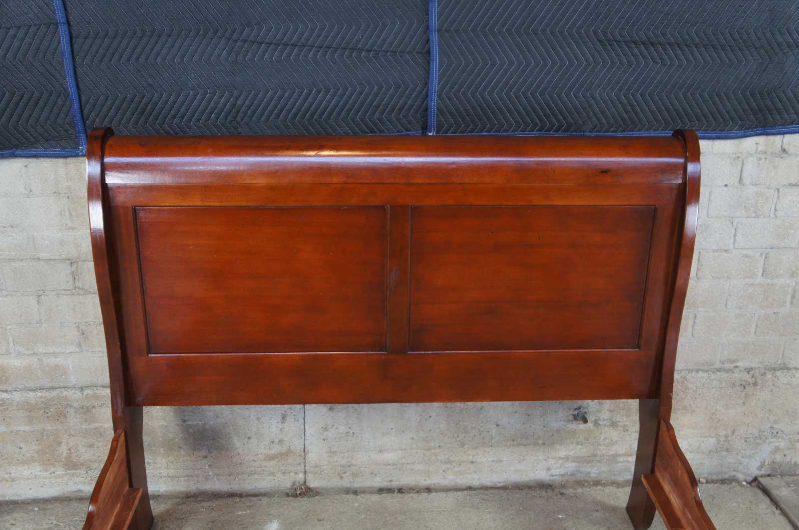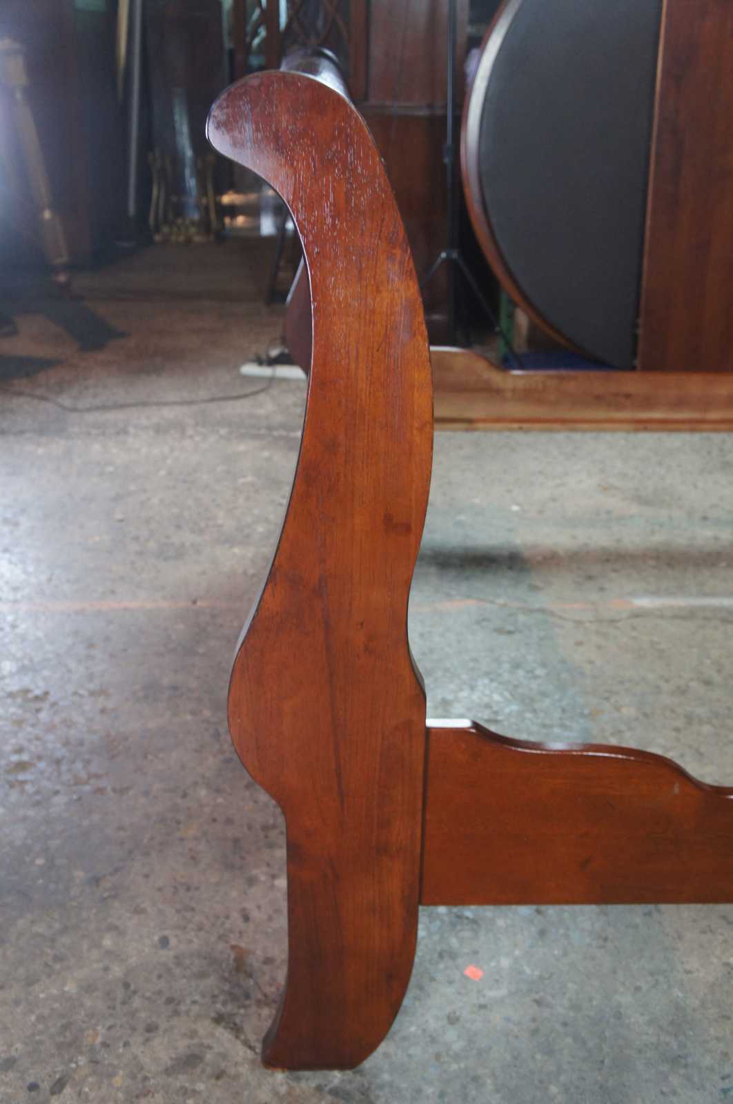 Vintage queen sized sleigh bed featuring paneled head and foot boards with serpentine shape and flared feet. Made of birch with a mahogany finish.