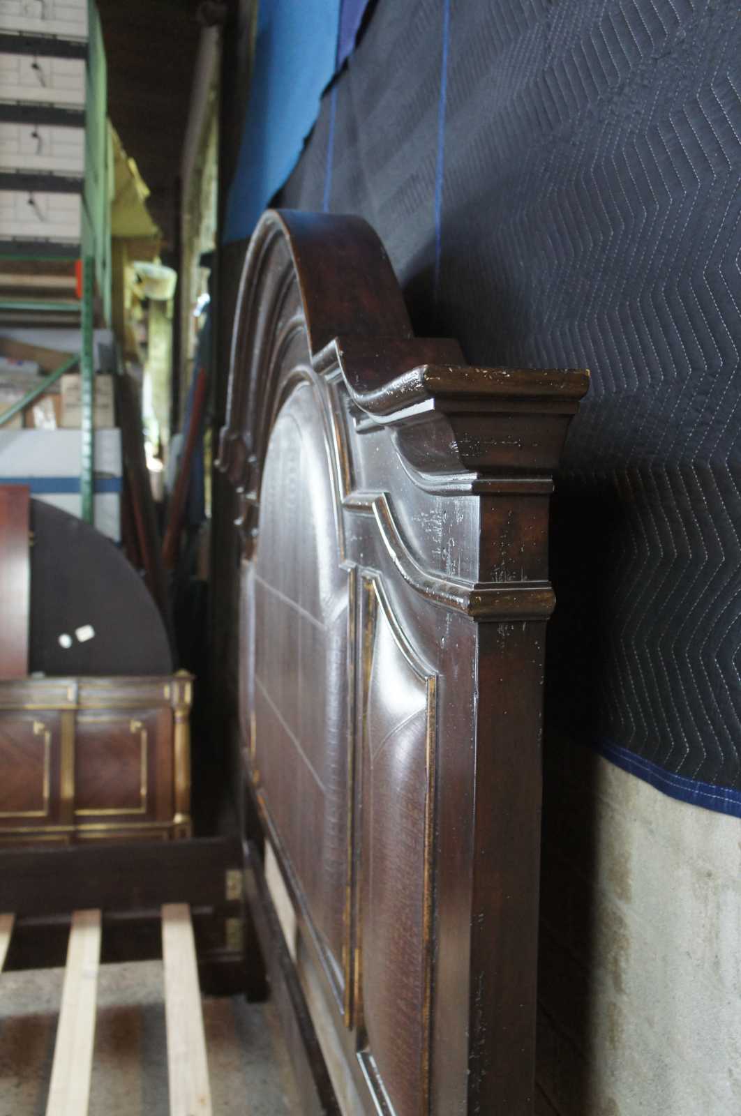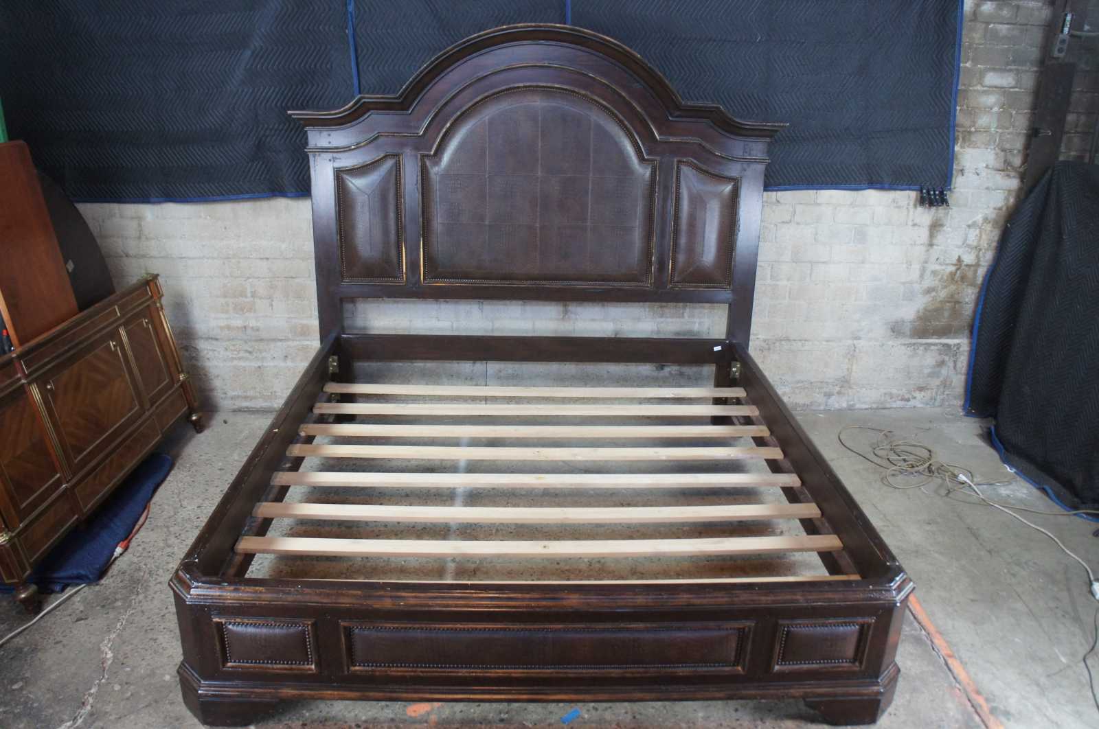 Vintage King size Marge Carson Georgia Bed in Antique Chestnut finish with high-grade Italian leather, detailed hand carvings with gold accent, domed crown molding, and oversized legs. Leather features engraved crocodile pattern surrounded with brass nailheads.