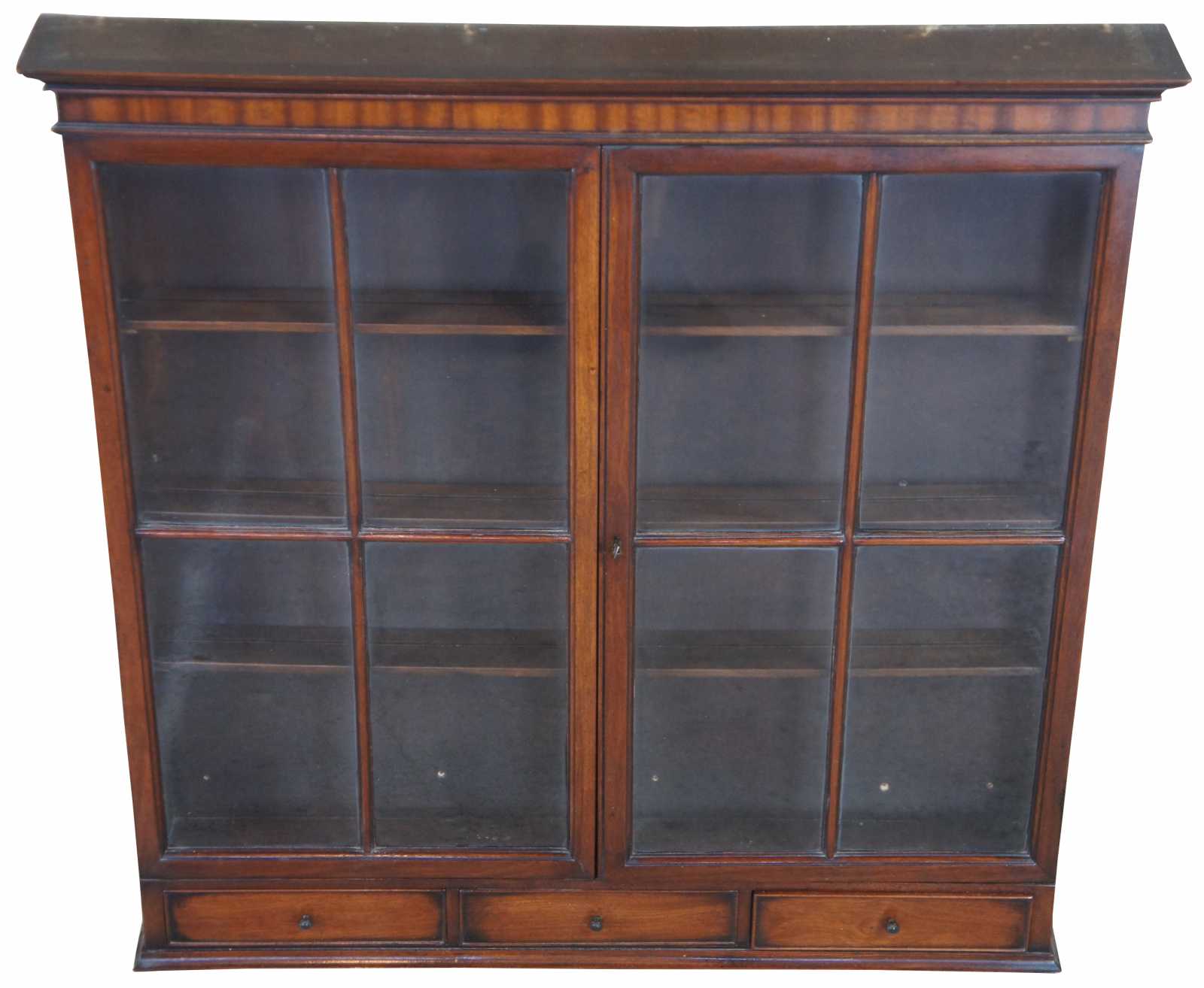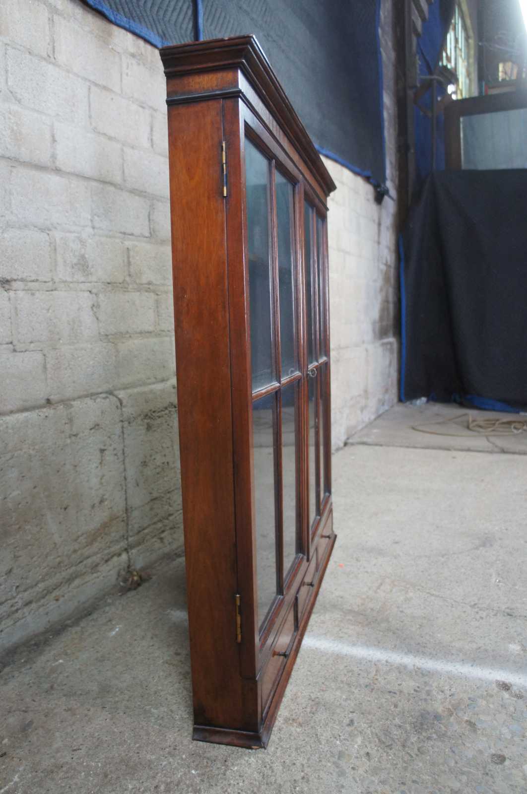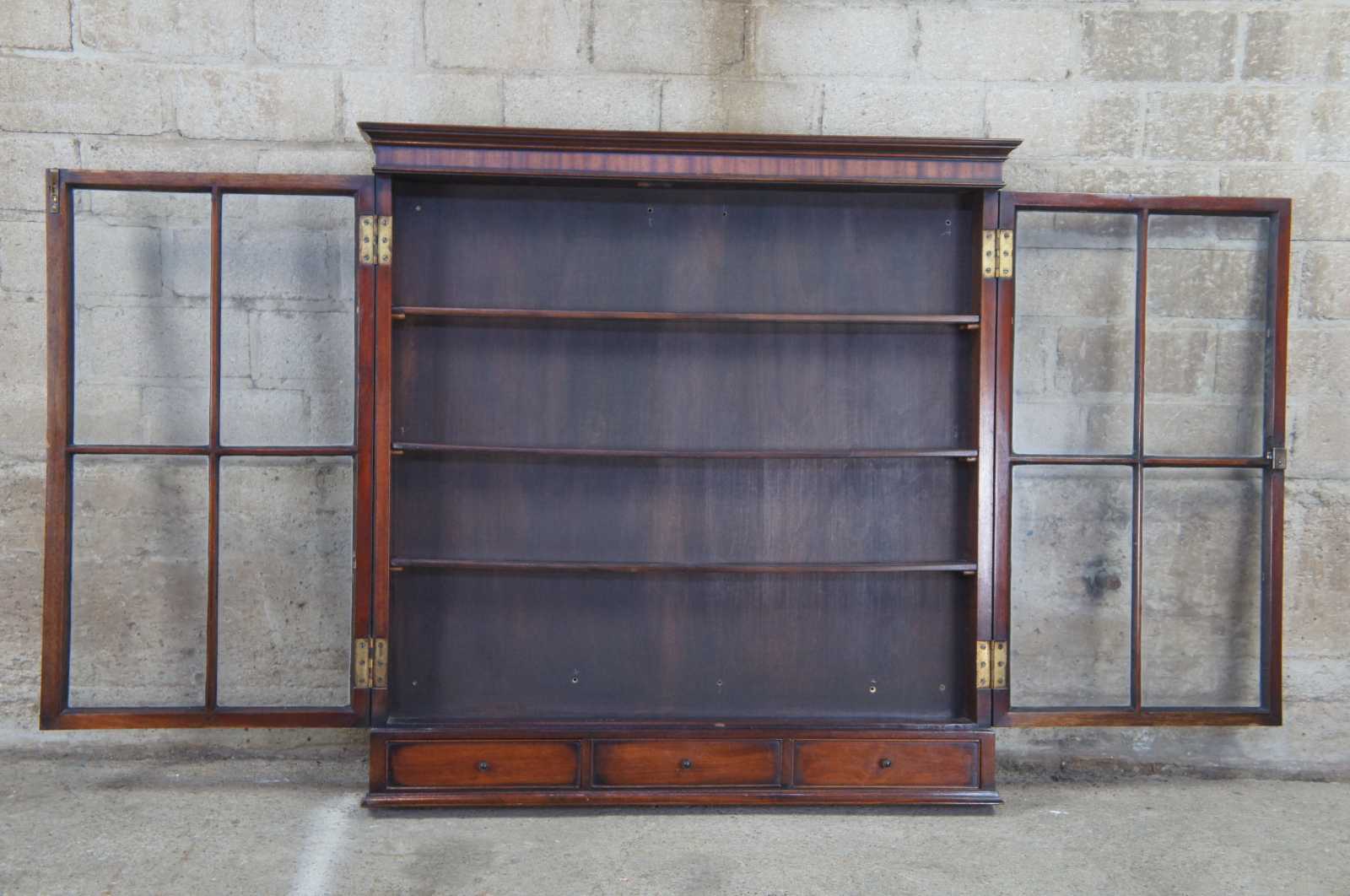 Petite wall curio or display cabinet in the manner of Georgian styling, Circa mid 20th century. Made of mahogany featuring three interior adjustable wood shelves, paned glass doors, and three lower drawers.