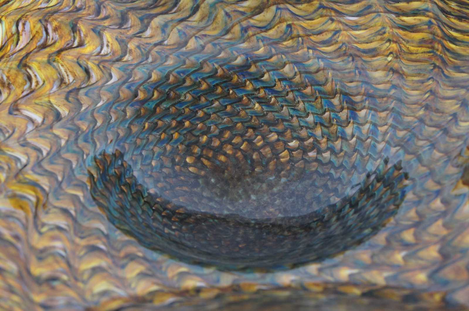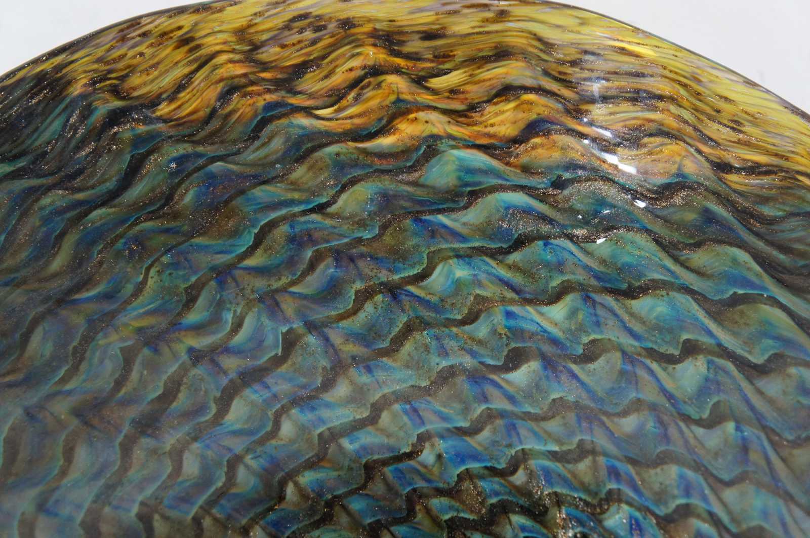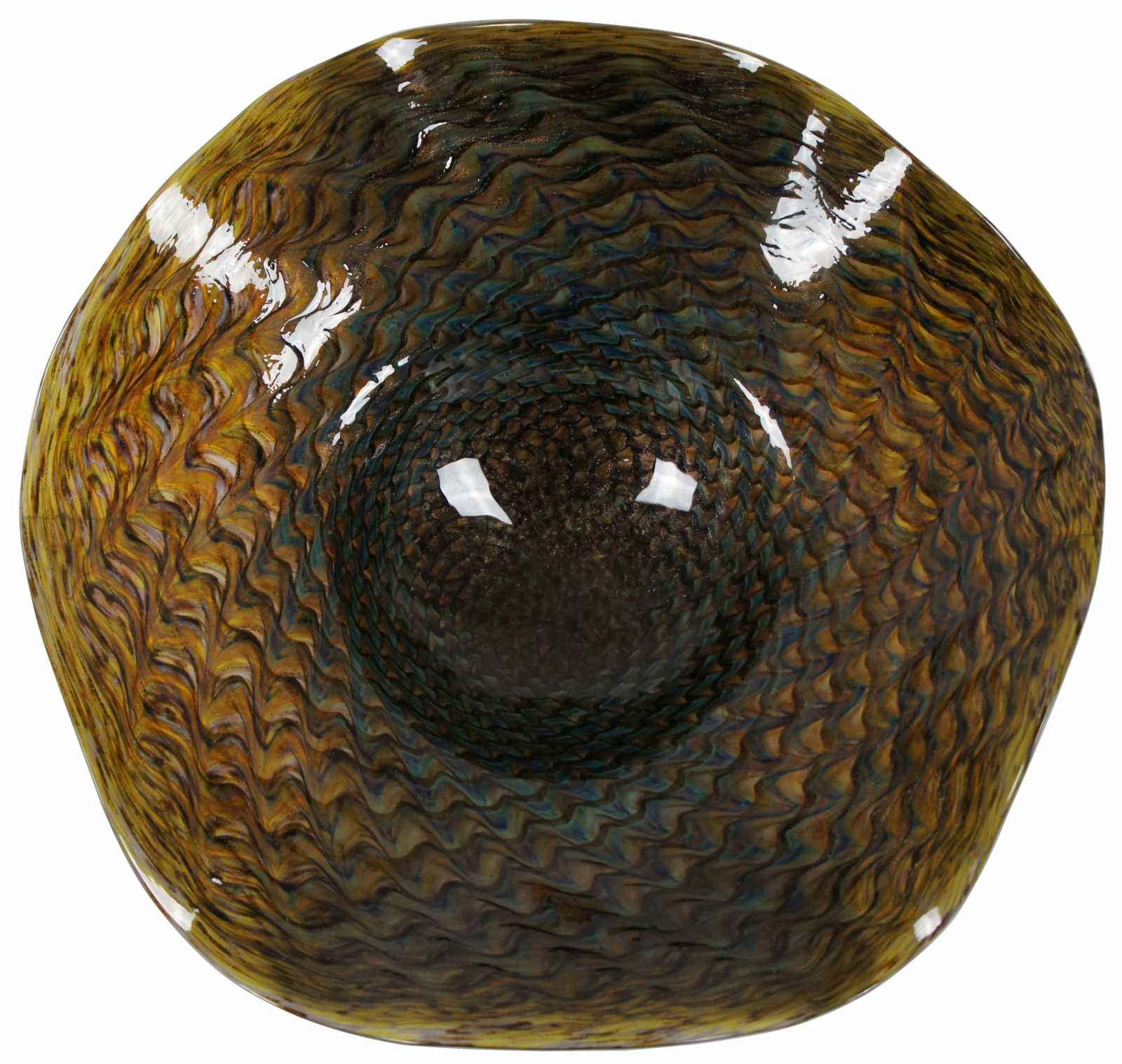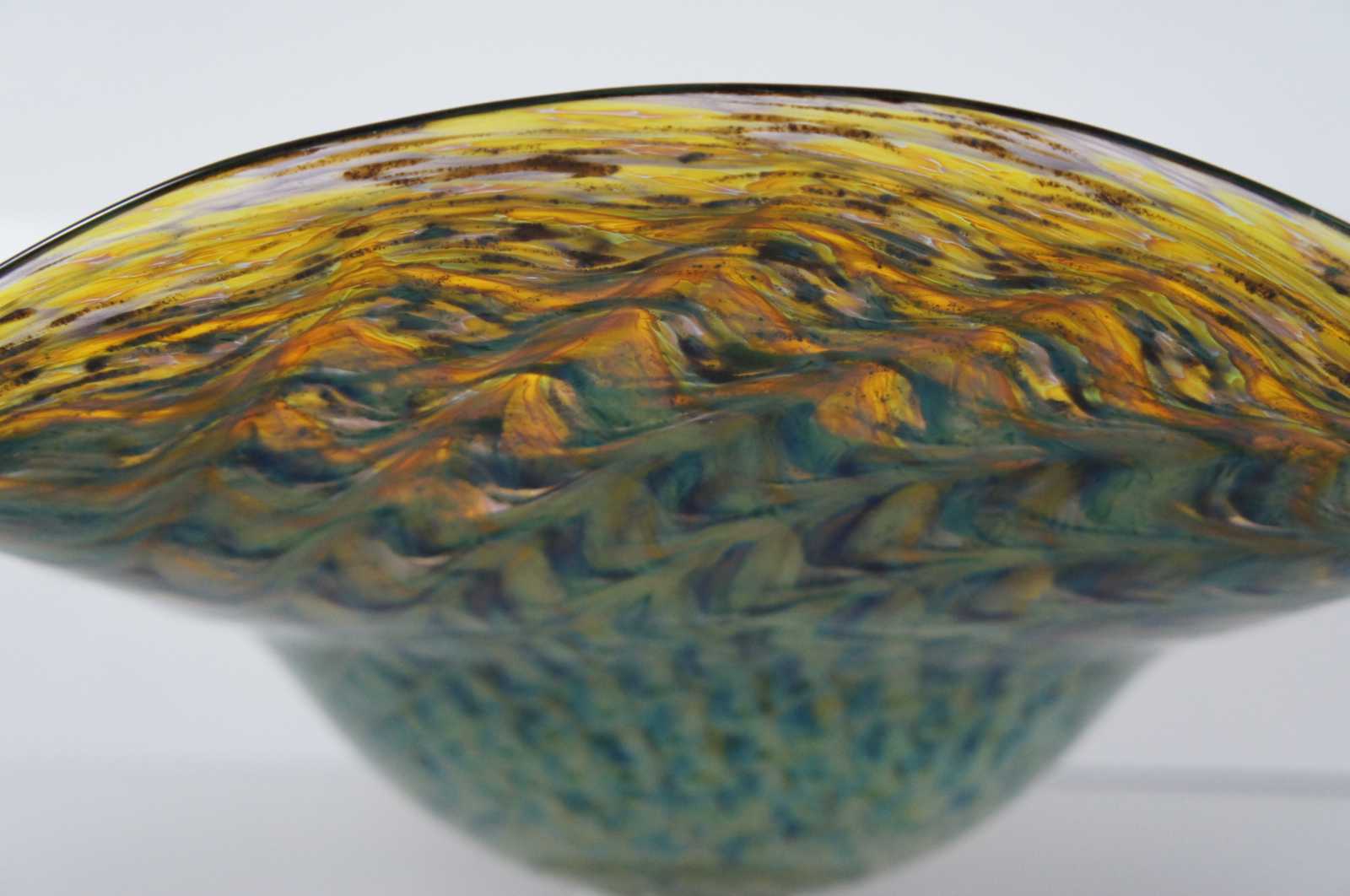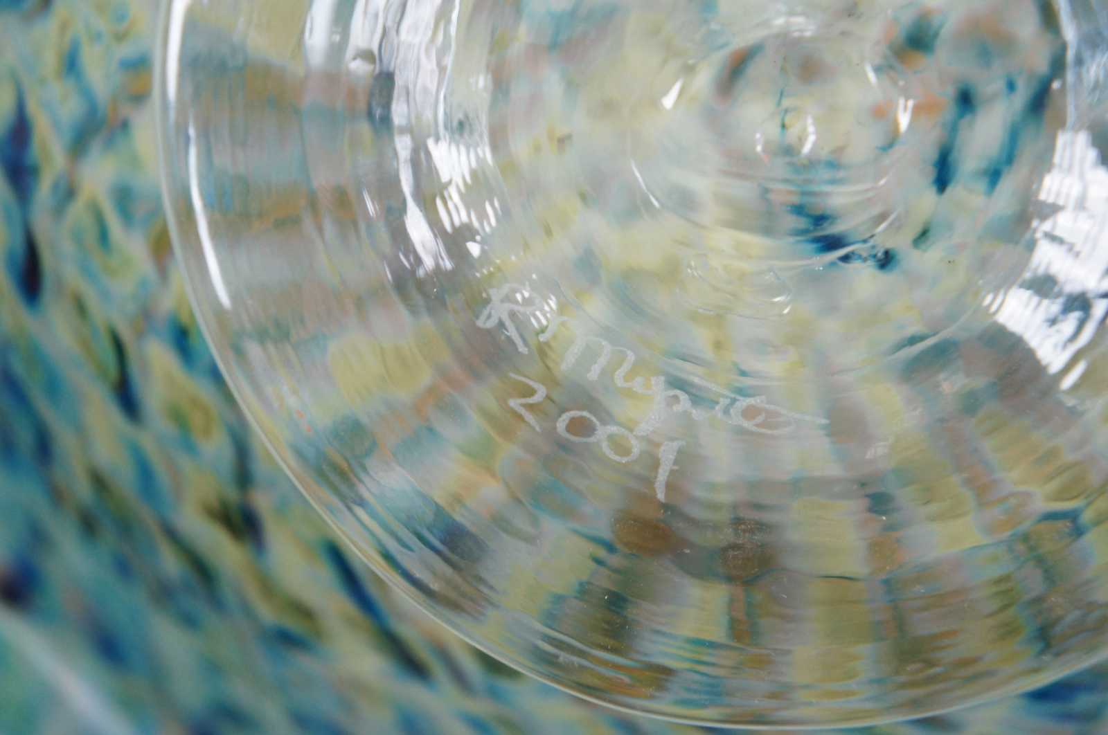2001 studio art glass large fluted free form footed bowl by Ron Mynatt featuring a colorful, almost iridescent swirling design of dark blue, green silver and topaz colors reminiscent of a peacock fan.