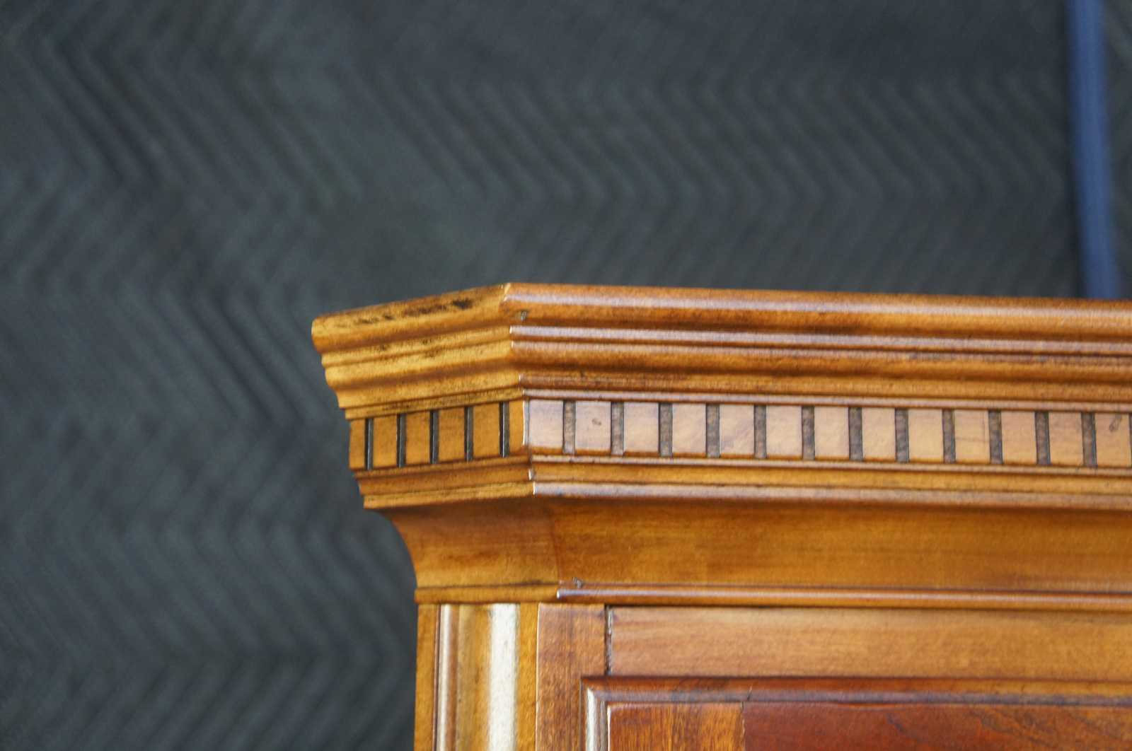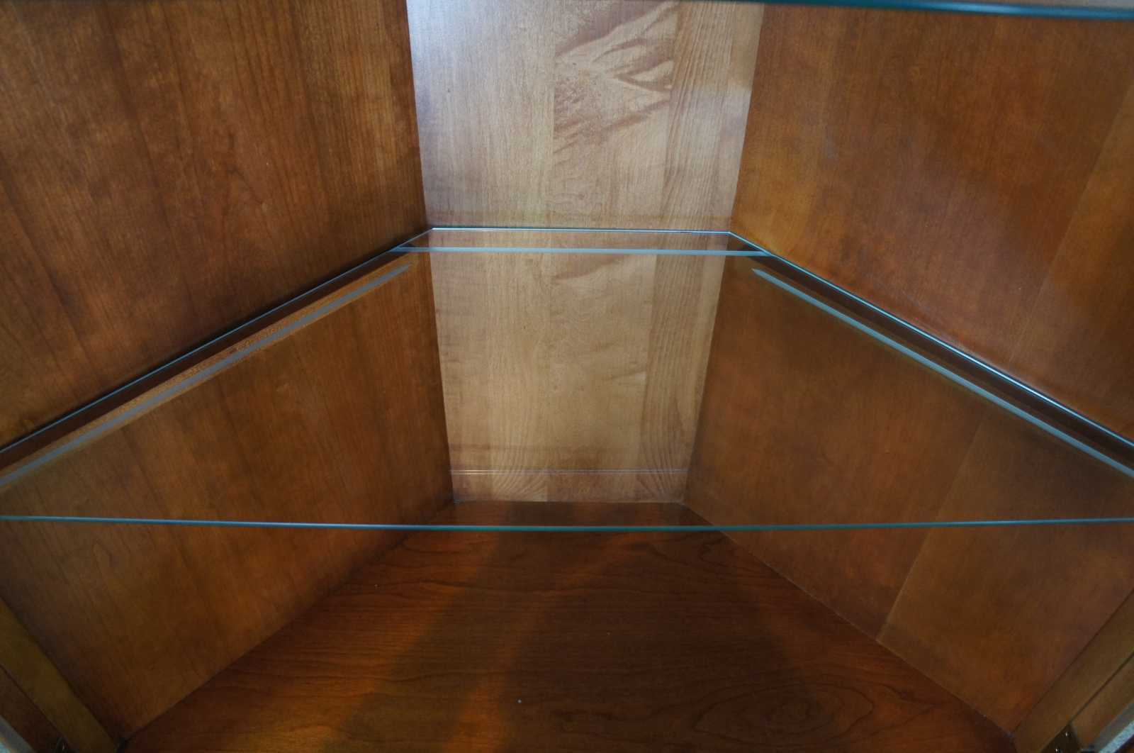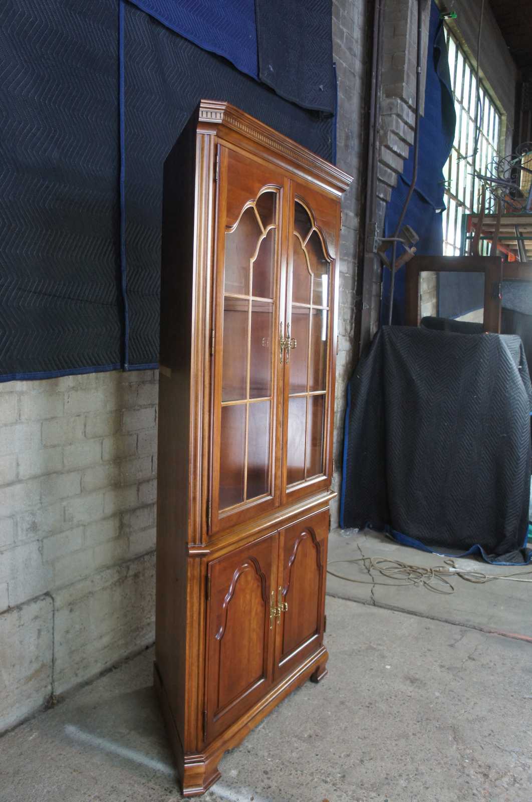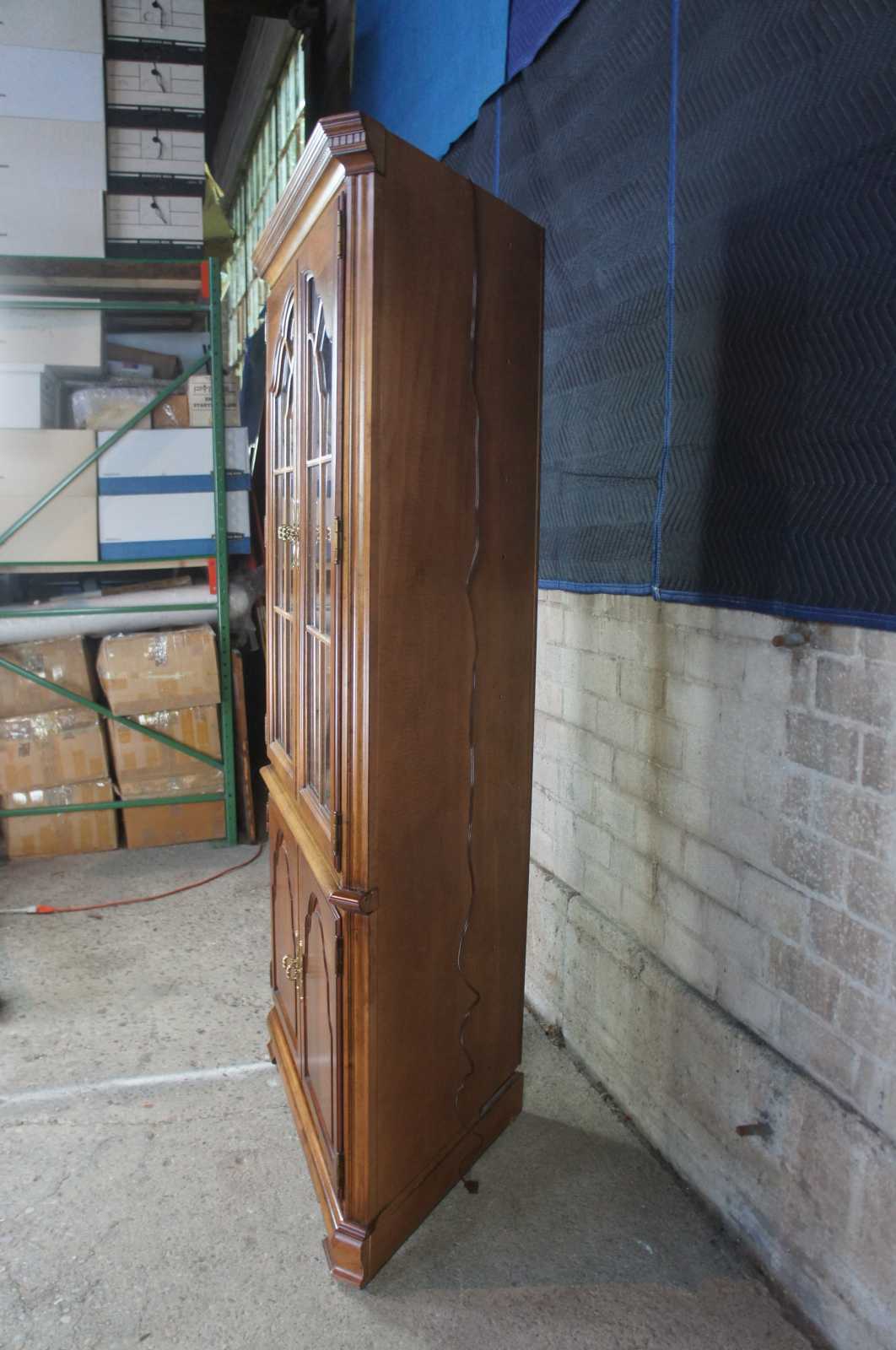 Stanley Furniture Chippendale or Queen Anne stlye corner cabinet. Made of cherry with paneled glass doors, interior glass shelves illuminated from above, and lower cabinet. Two Available.
