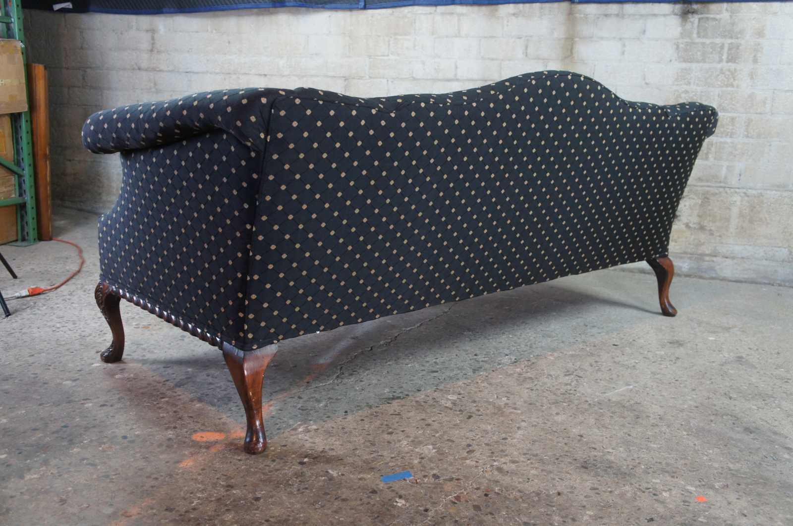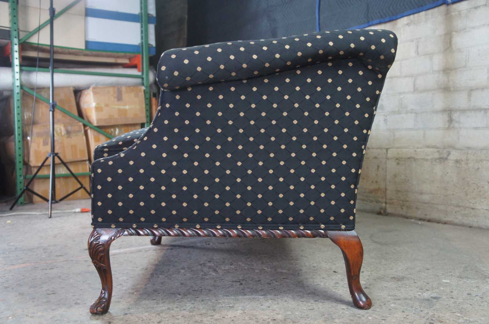Antique three seat camelback sofa or couch. Made of mahogany with carved accents, scrolled arms, and downfilled cushions. The Robert Allen Wavecrest fabric features a black embroidered florets connected by diamond pattern.