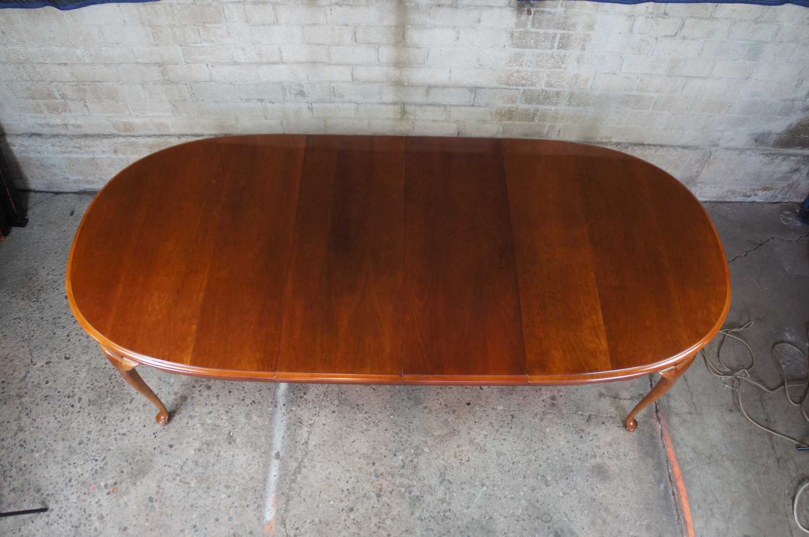 Vintage Stanley Furniture dining table. Made of solid cherry featuring an oval shape with two leaves and slipper feet.