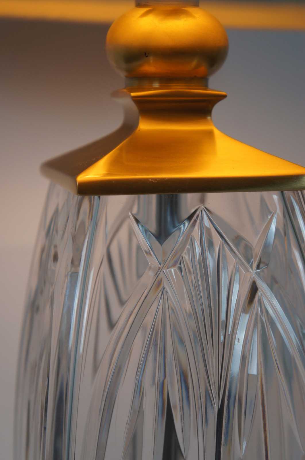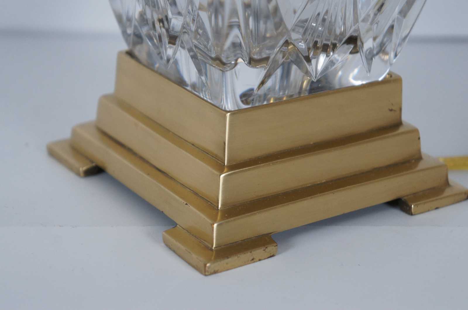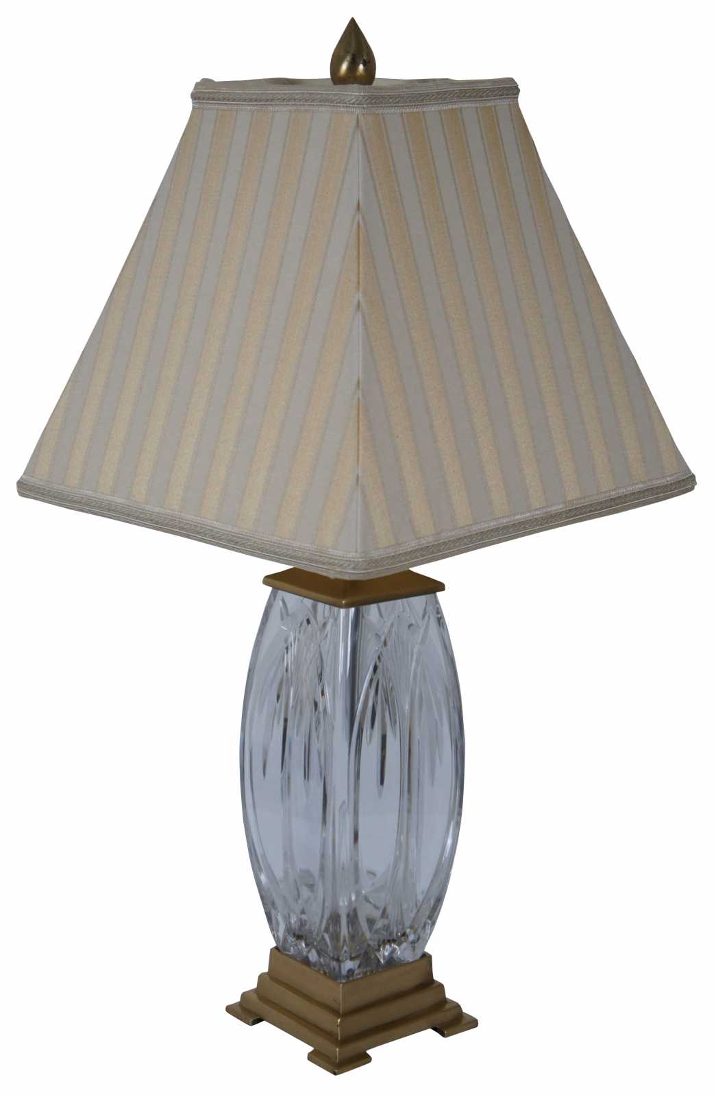 Waterford Finn cut crystal and Versailles brass table lamp with striped silk shade. 108-892-19-00
