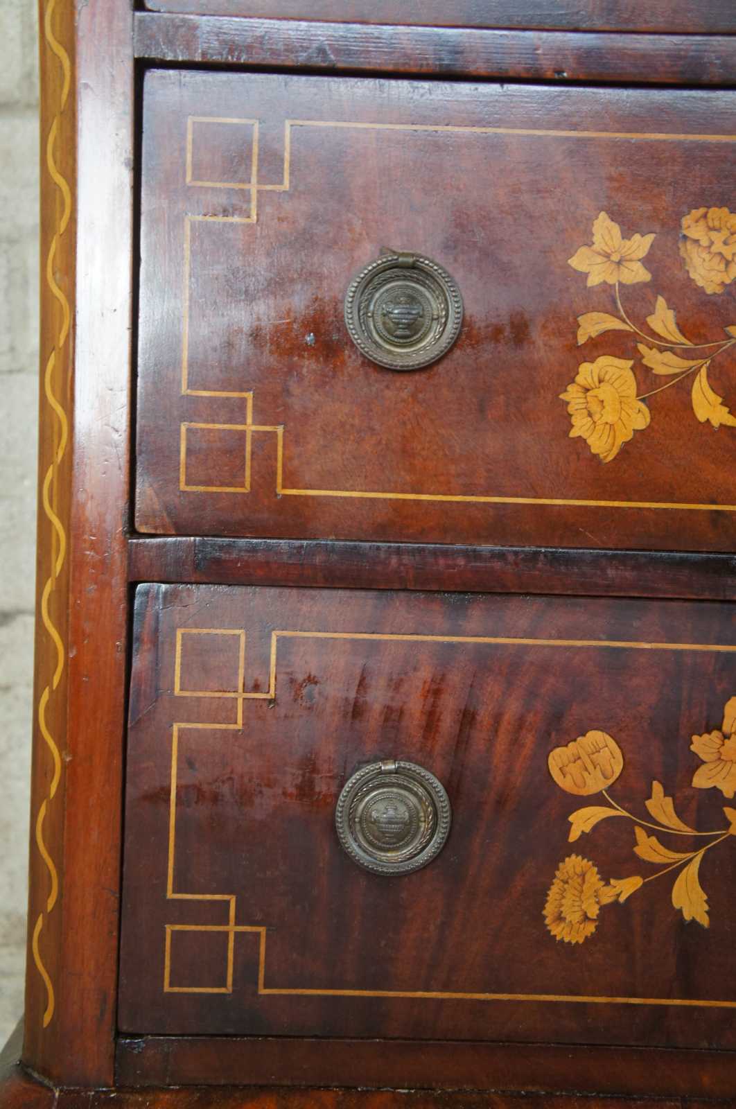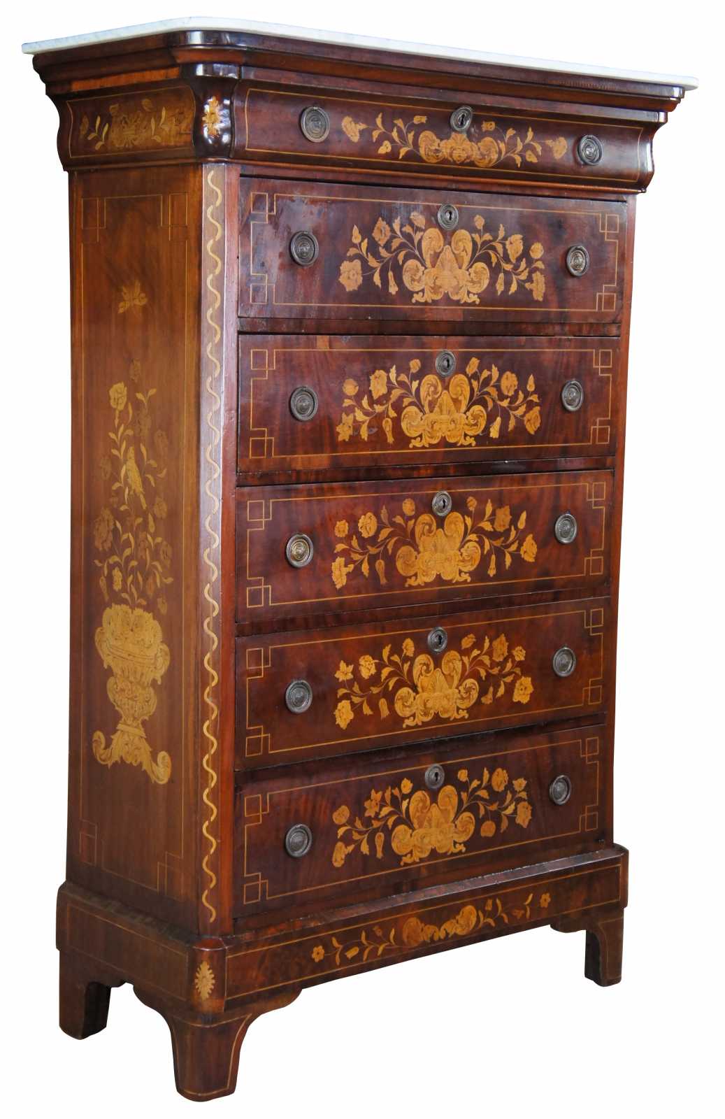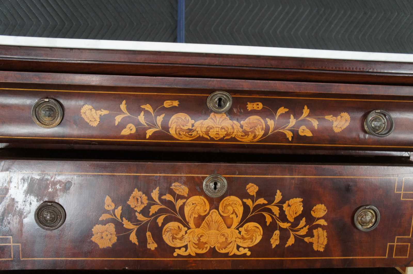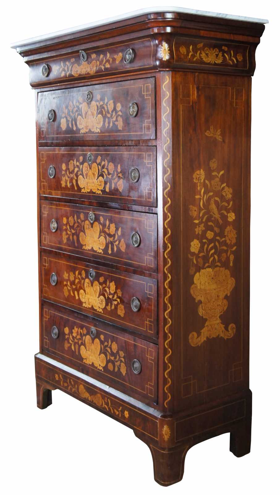 Antique Dutch Marquetry highoy chest of drawers, circa 1820s. Made of fruitwood veneers and mahogany with flame mahogany drawer fronts. Features highly detailed inlays of floral, ribboned and geometric accents. Brass drawer hardware and a white marble top. Examine closely to see the captivating bird and butterfly jardiniere motif along each side.