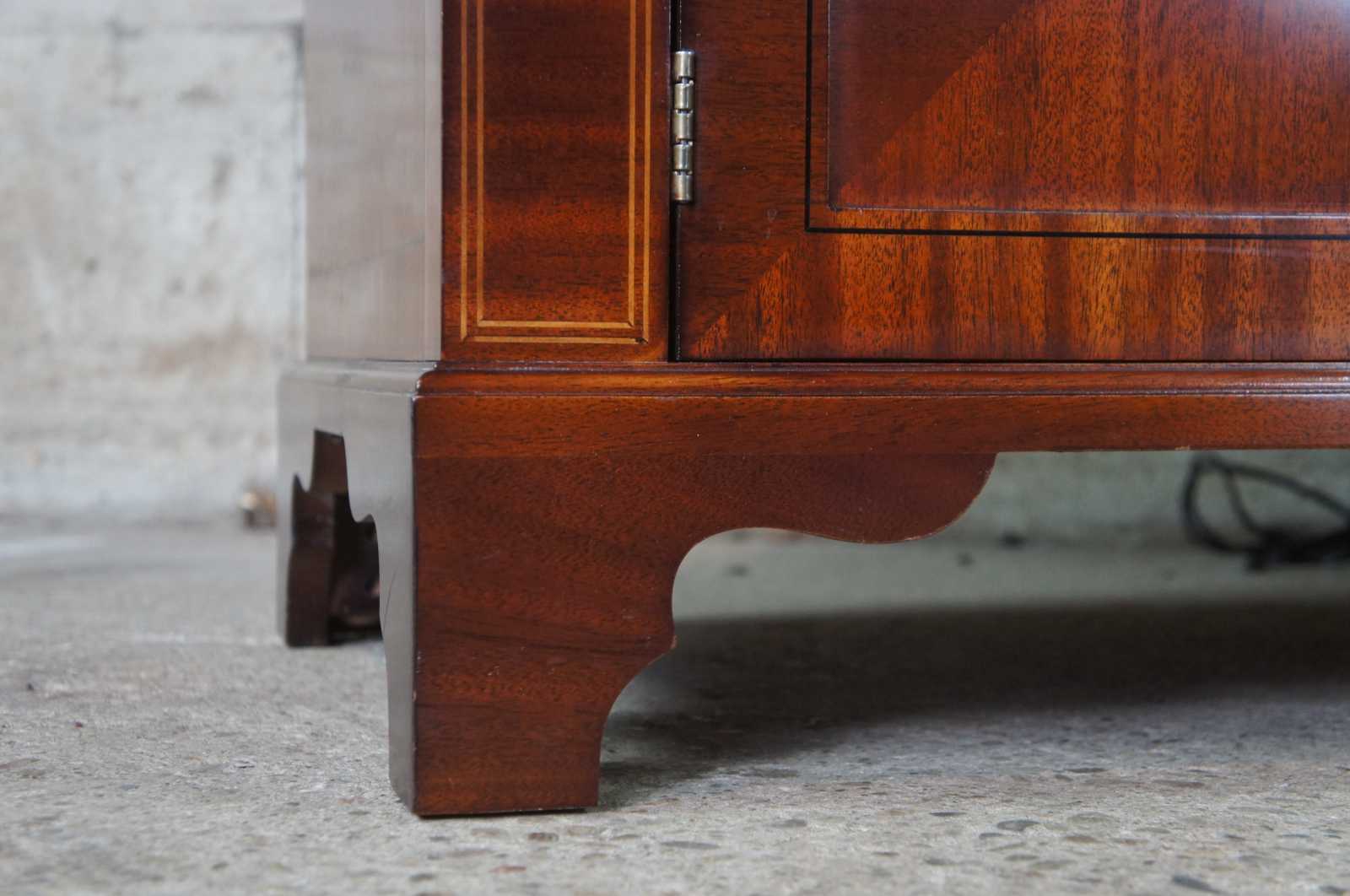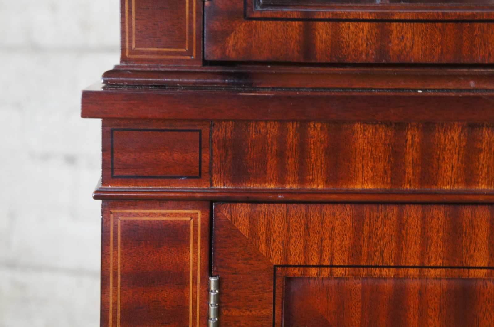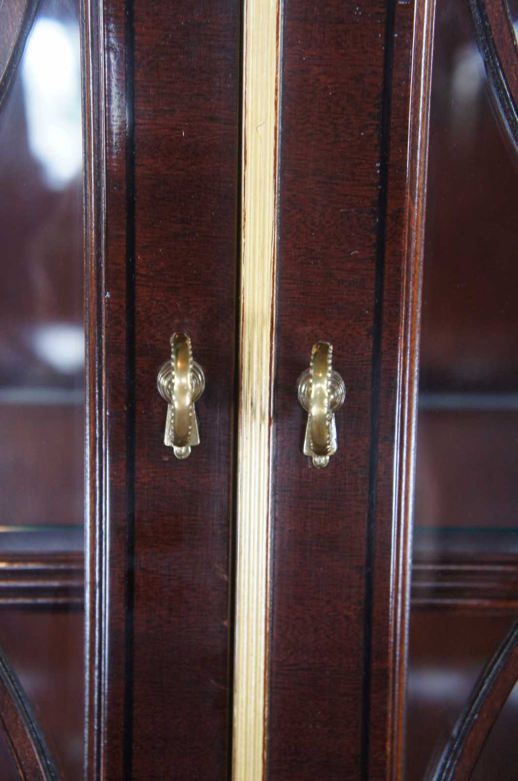 Baker Furniture Historic Charleston Collection bonnet top curio or china cabinet. A timeless beauty adapted from a pair of English originals in the Joseph Manigault House, circa 1790s. Made from mahogany with satinwood inlay, burled door panels and brass hardware. Features a glass front with elaborate fretwork. Opens to an iluminated interior with three inset shelves and lower cabinet storage.