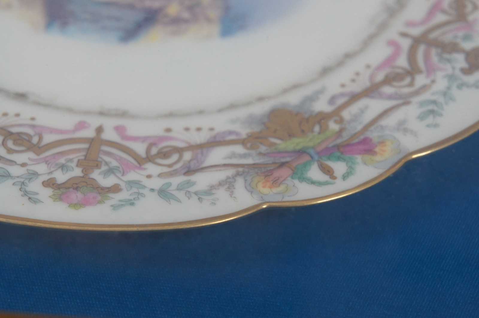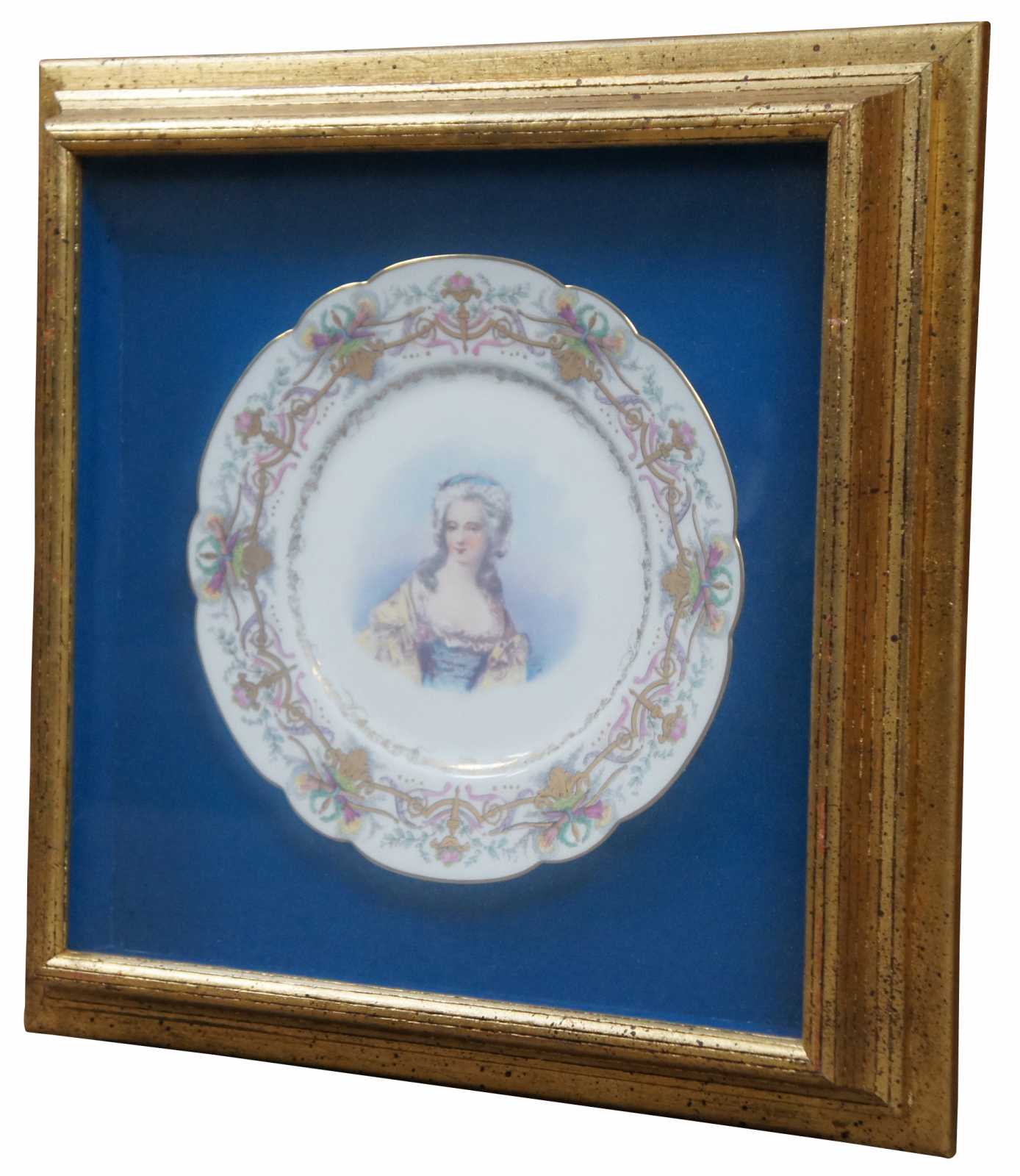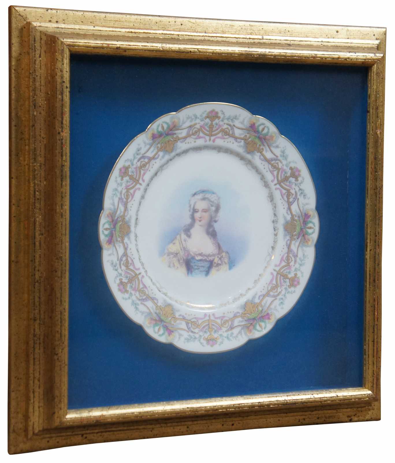 Framed antique 19th century Sevres porcelain plate by Chateau des Tuileries featuring a portrait of a noblewoman framed by pink and gold torches and flowers.
