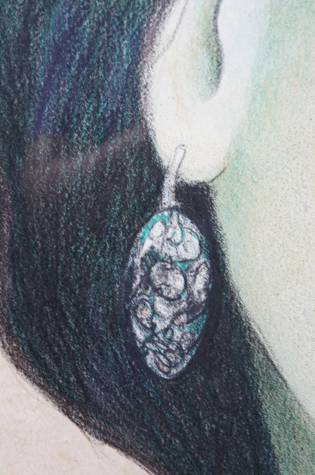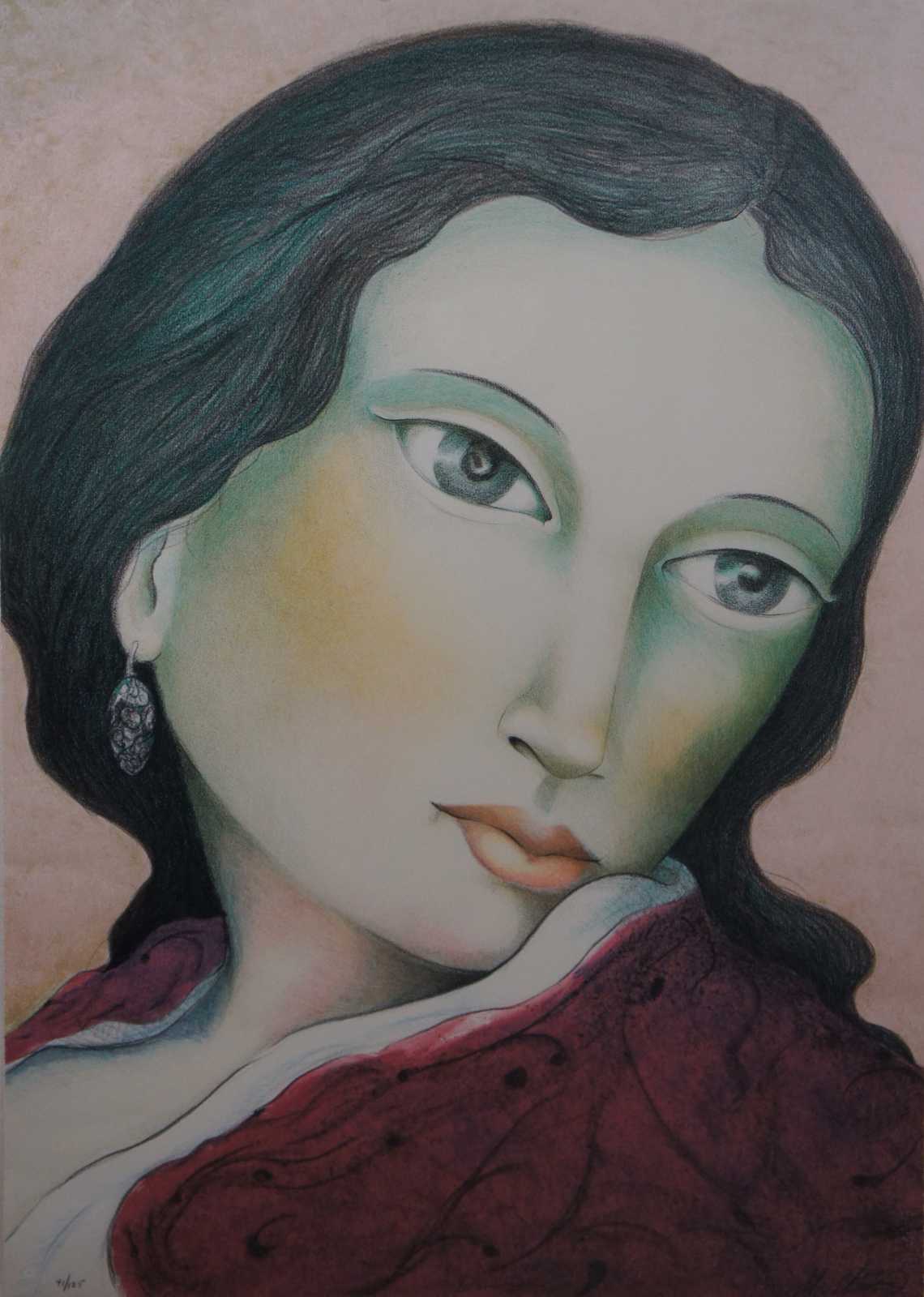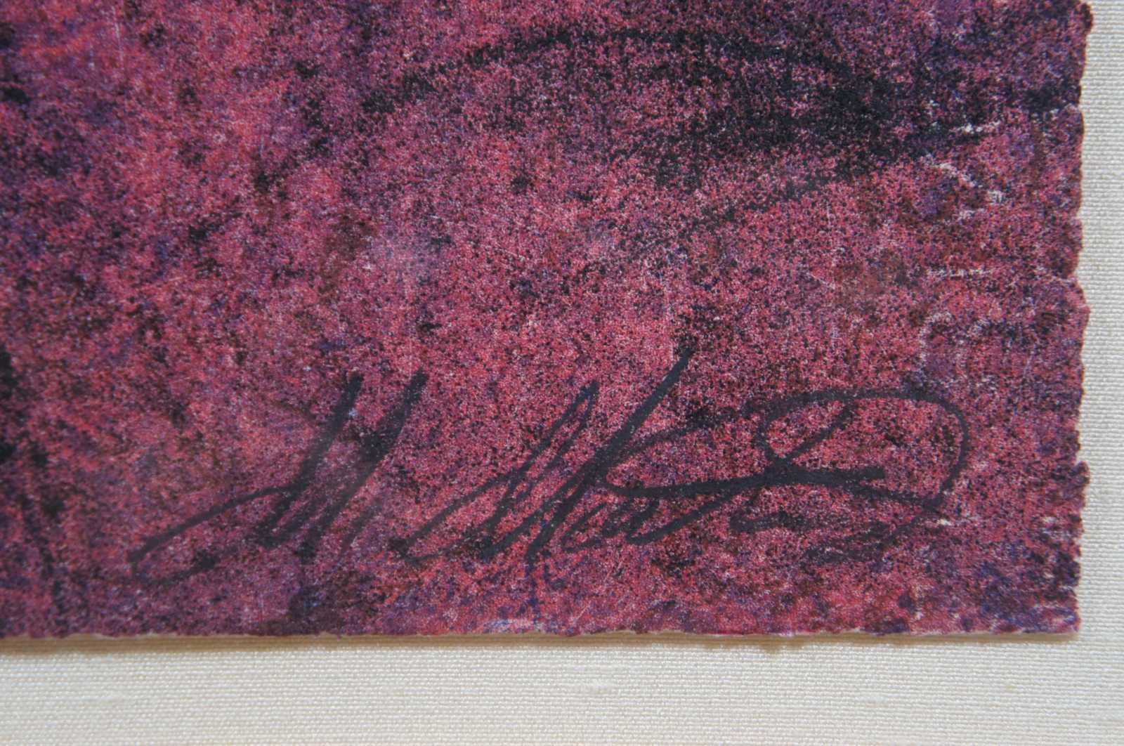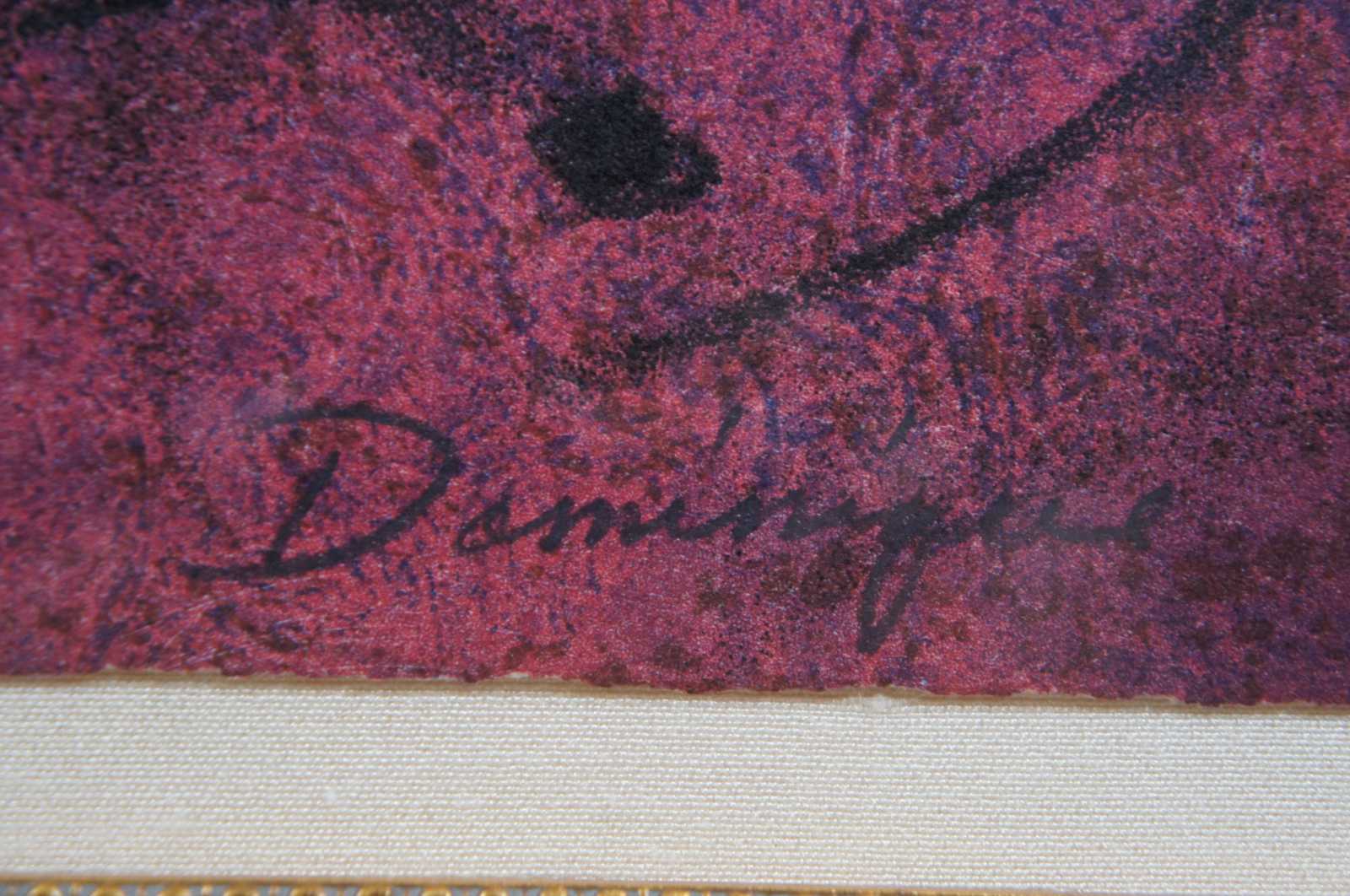 Large portrait of a woman in burgundy lithograph print titled “Dominique” by Miguel Martinez, signed and numbered 41/125. “The youngest son of Hispanic parents, Miguel Martinez was born in New Mexico in 1951.