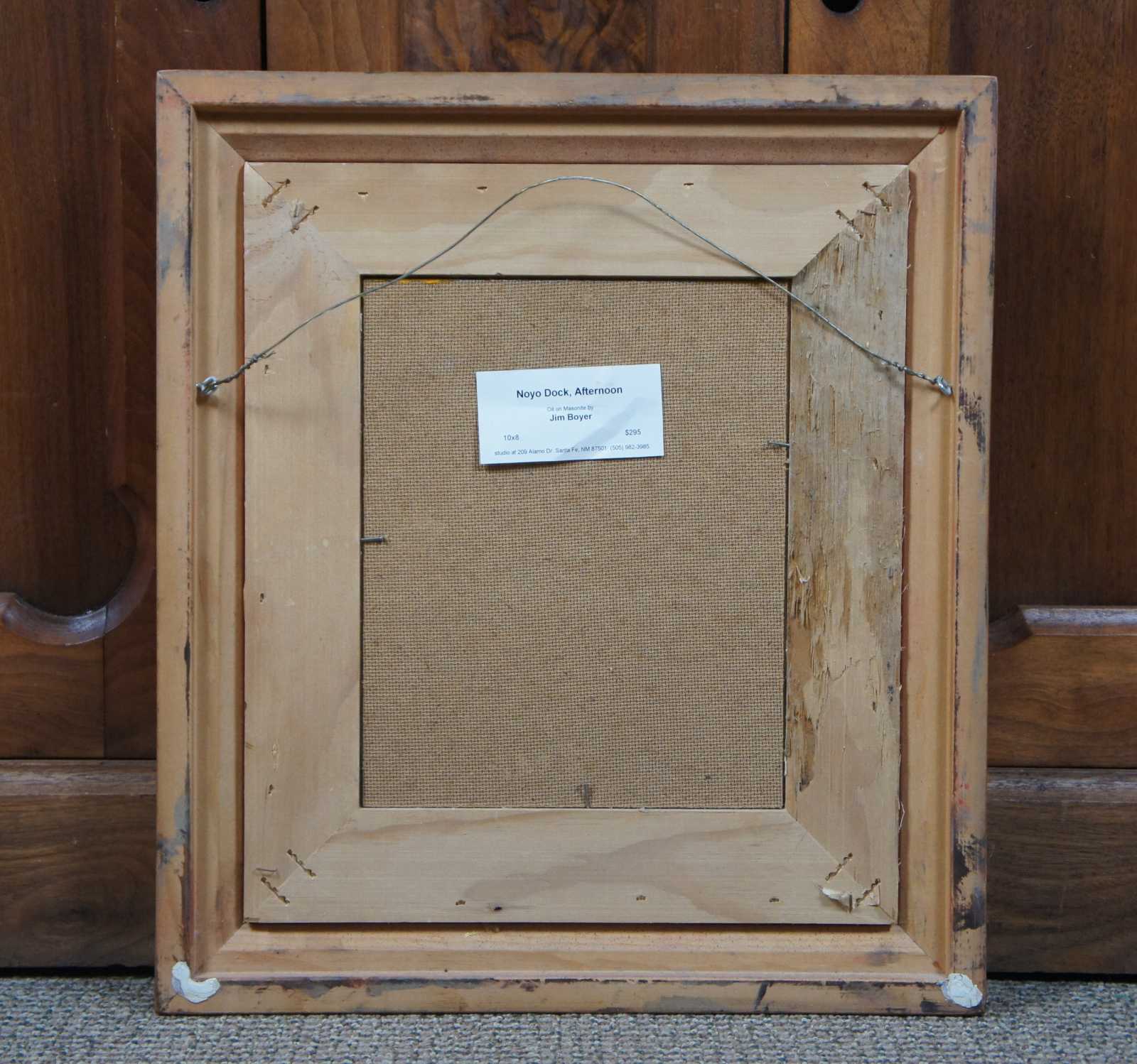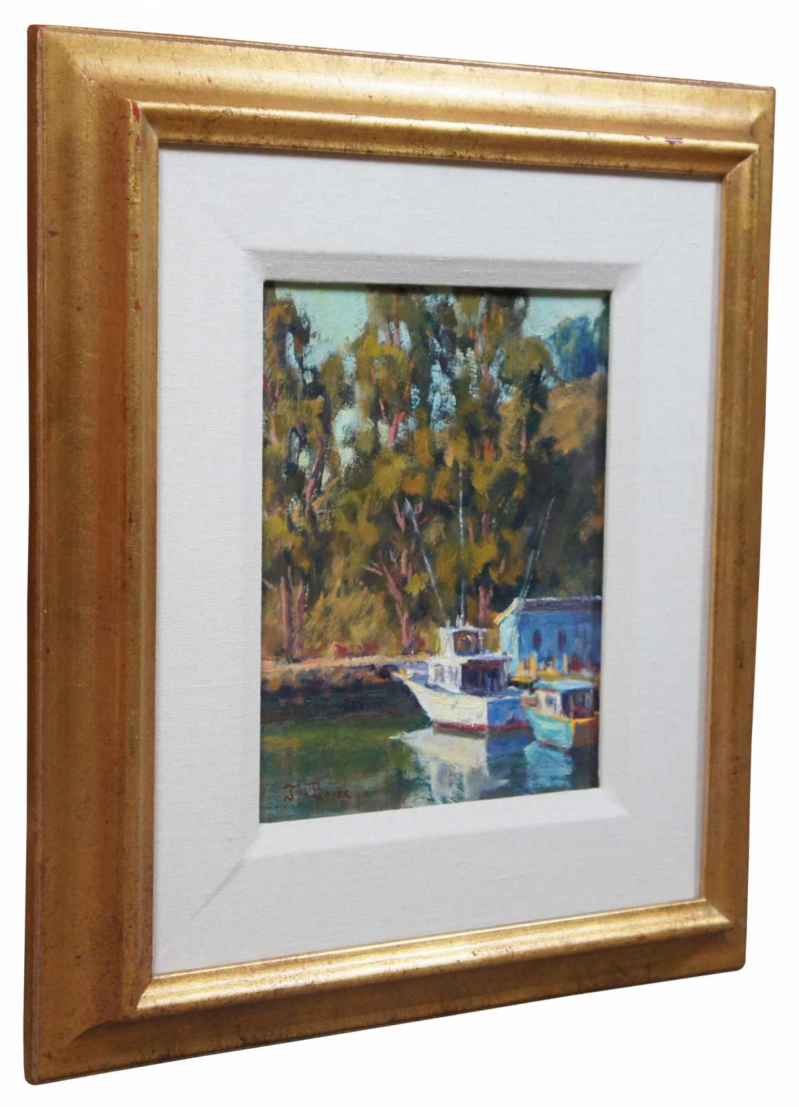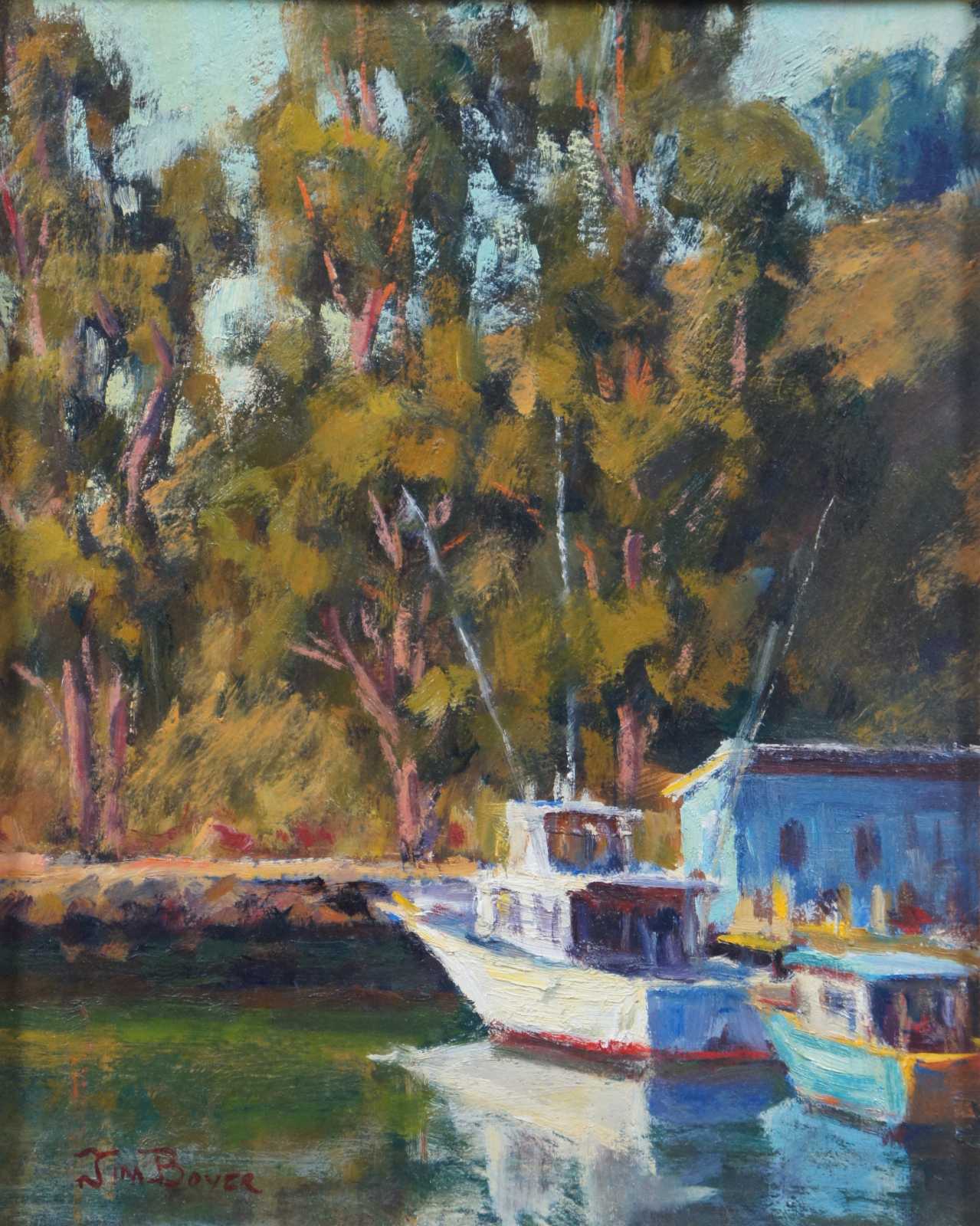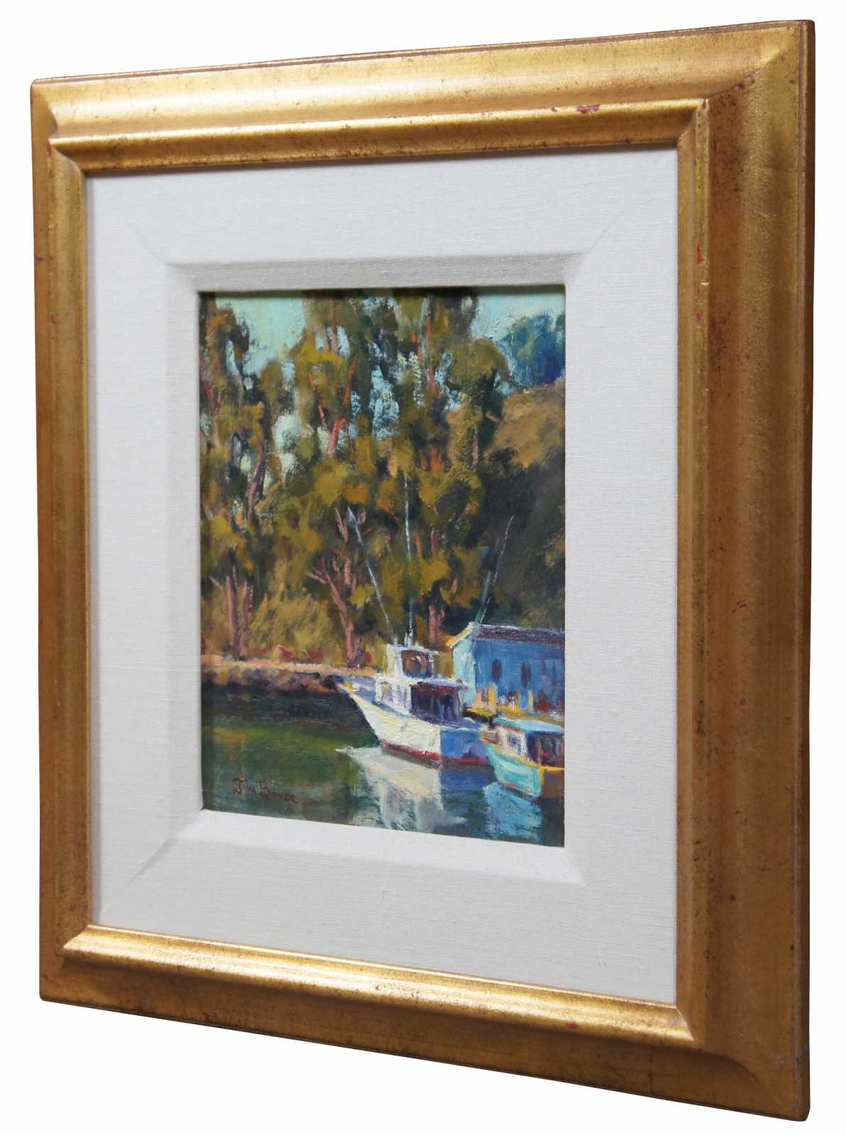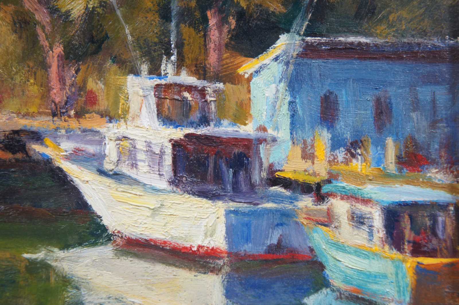 Vintage oil on masonite landscape painting by Jim Boyer, titled “Noyo Dock, Afternoon” showing a small fishing boat and water taxi moored at a tree lined dock.