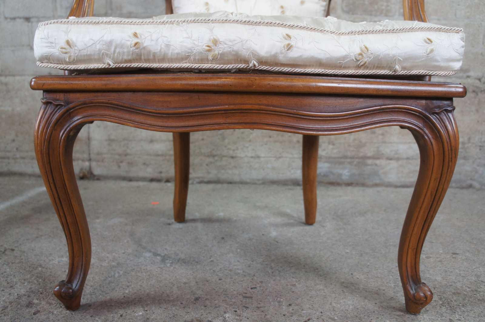 Antique walnut cane back chairs. Features open arms, cabriole legs and silk raised floral upholstery.
