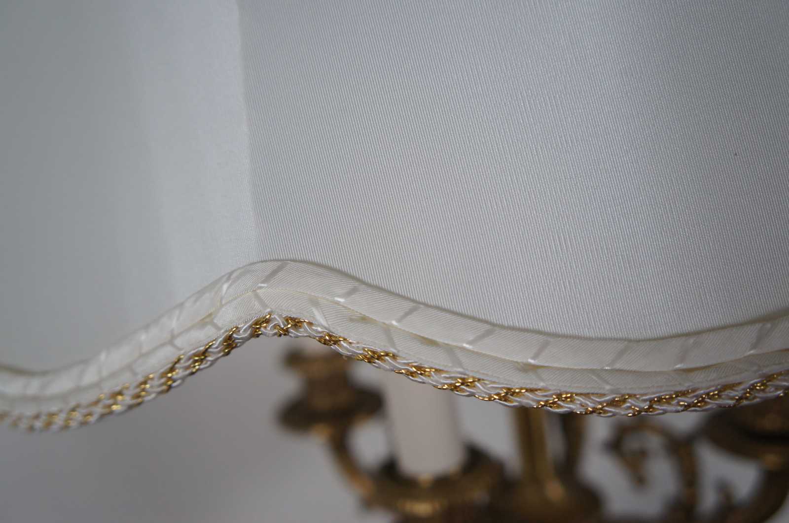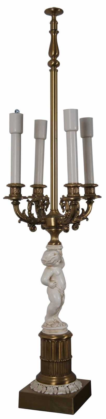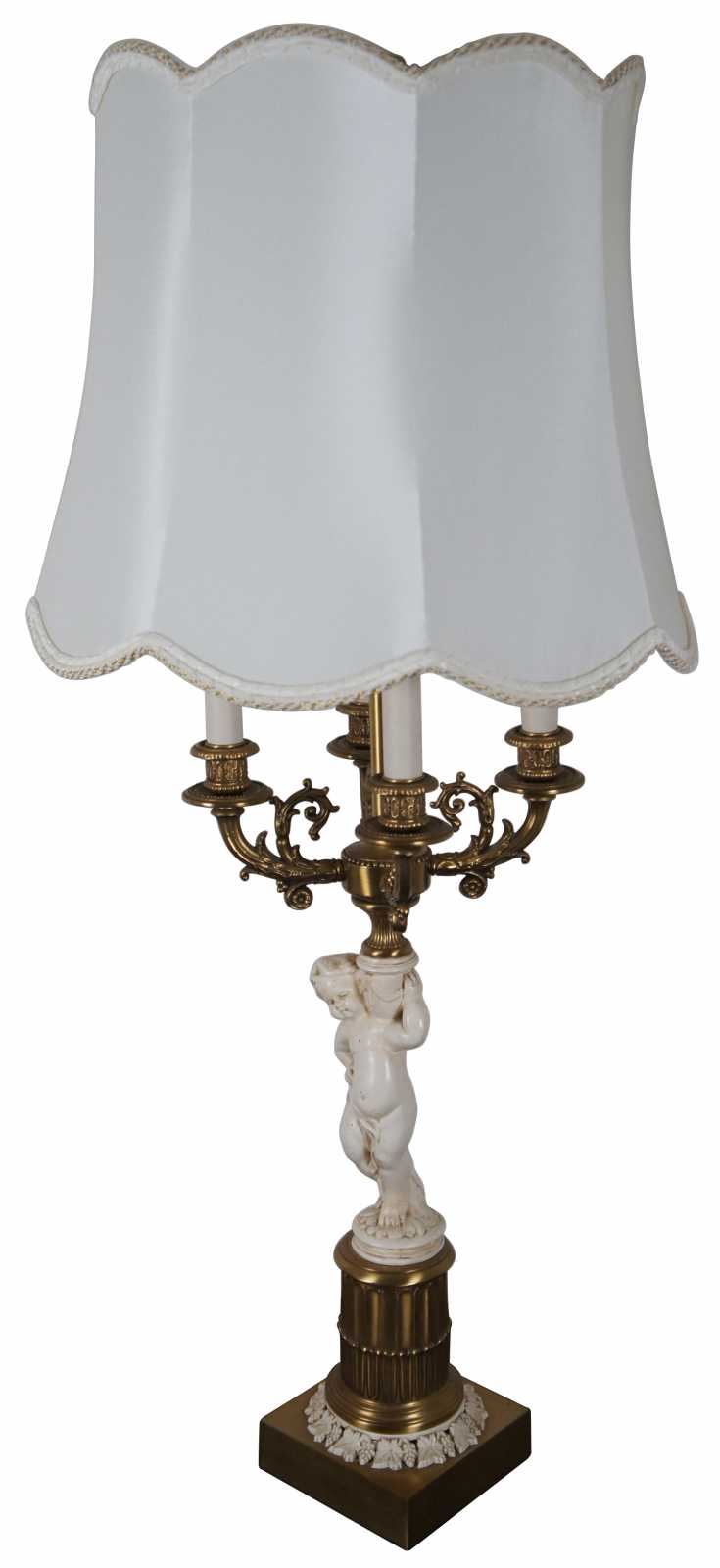 Brass and spelter four light candelabra shaped table lamp featuring a neoclassical cherub figure and ornate Diane Studios shade.