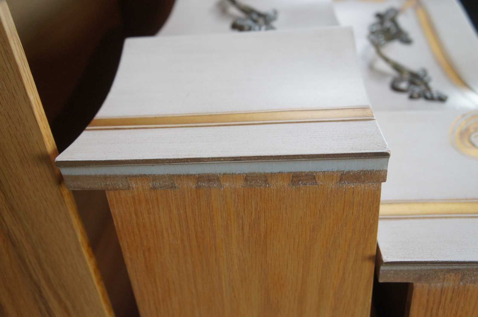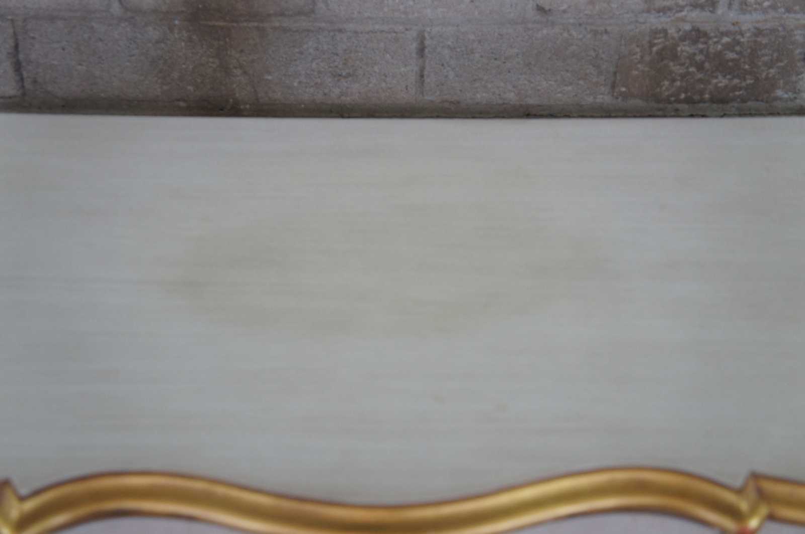 John Widdicomb dresser, circa 1960s. Drawing inspiration from Italian Florentine and Provincial. Features a rectangular form with serpentine front, 9 dovetail drawers with dividers and cabriole legs. Finished in Antique white with gold painted trim.