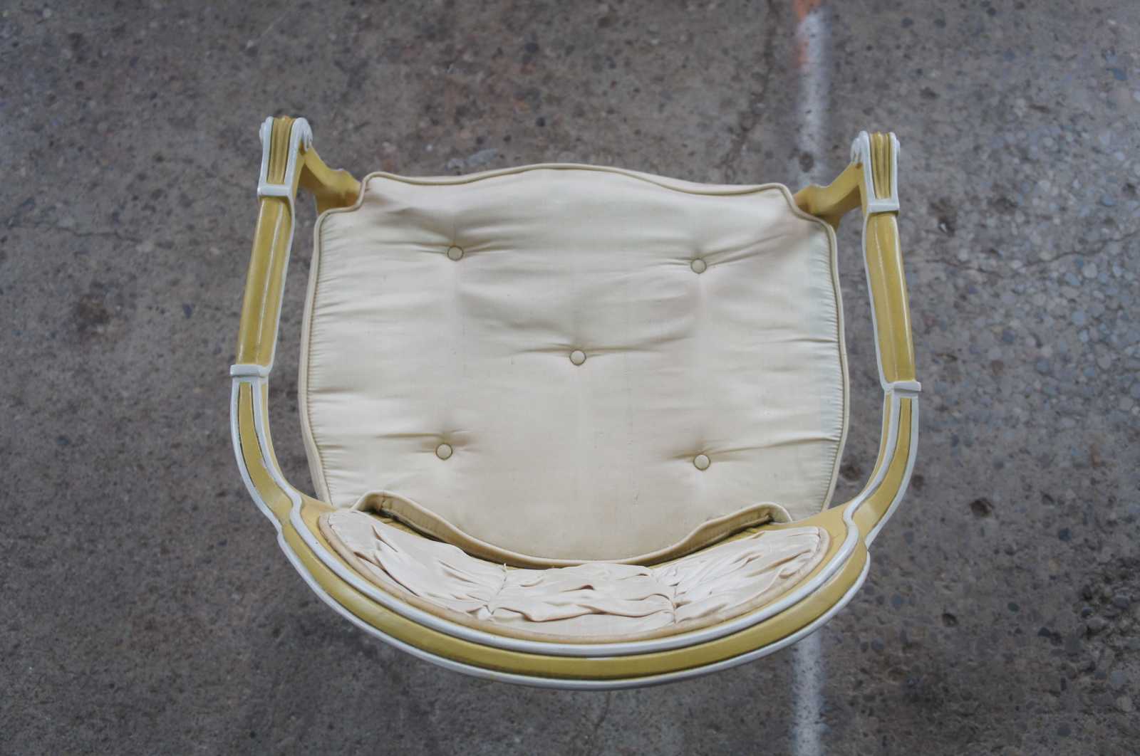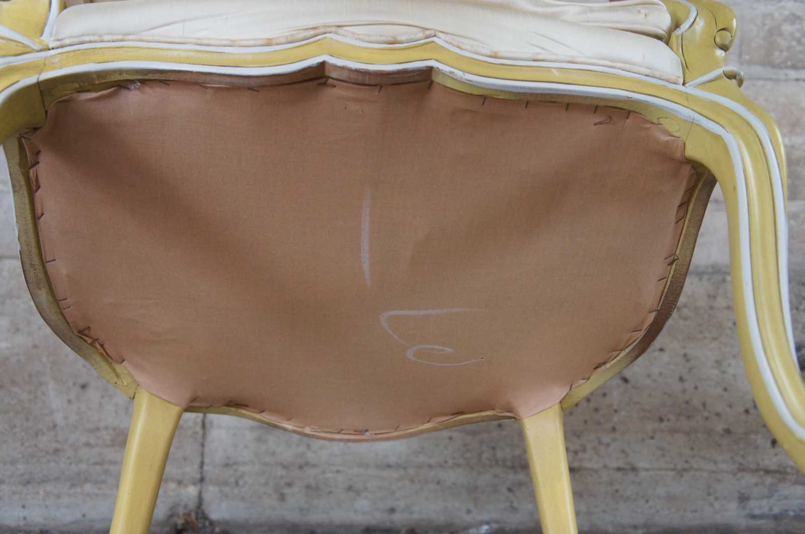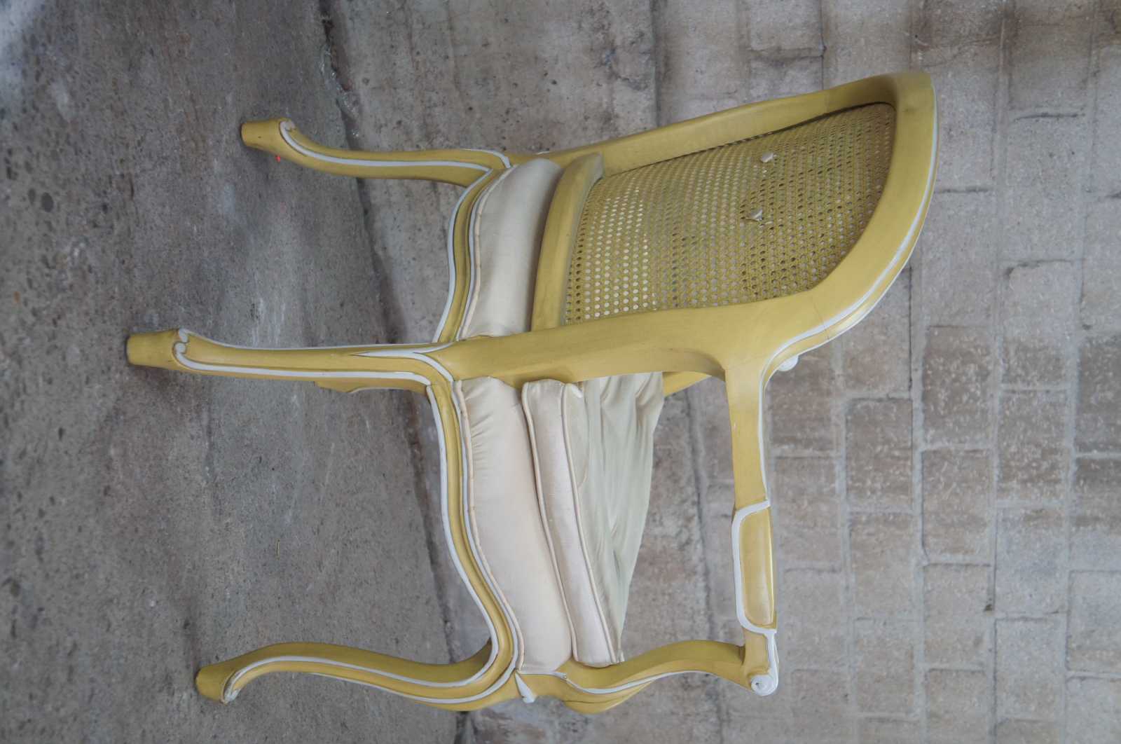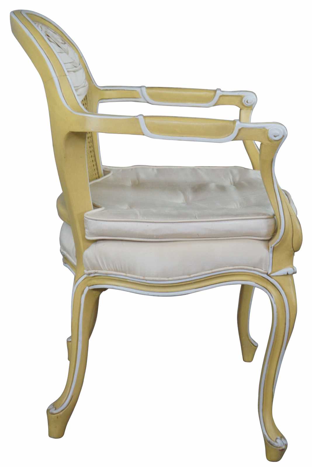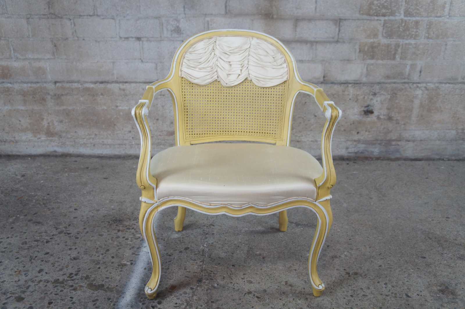 Mid Century 1966 Hibriten arm chair featuring French Provincial styling with caned drapery back, serpentine shape, and cabriole legs.