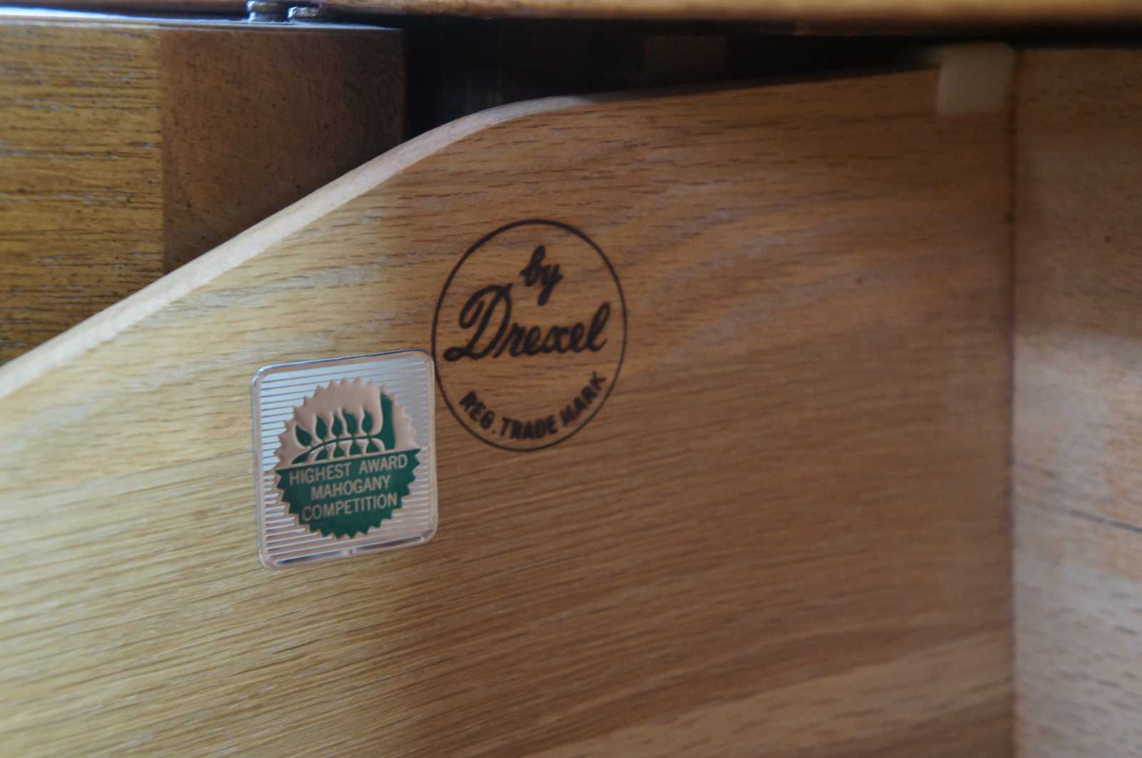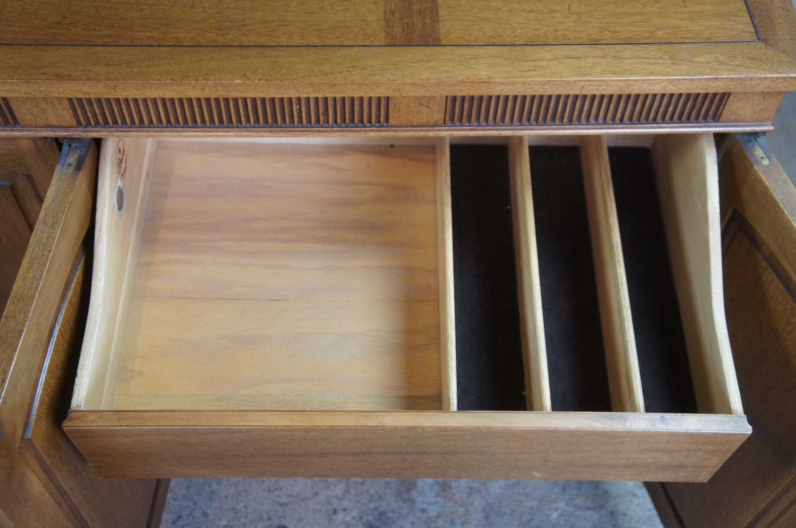 Italian Provincial Sideboard/ Server by Drexel Heritage, circa 1961. Part of their Triune collection, finished in Mahogany. Features a rectangular form sporting a Tuscan inspired design with a fluted apron, paneled doors and brass hardware. Includes 4 dovetailed drawers, a central cabinet and shelves. 555-135-6