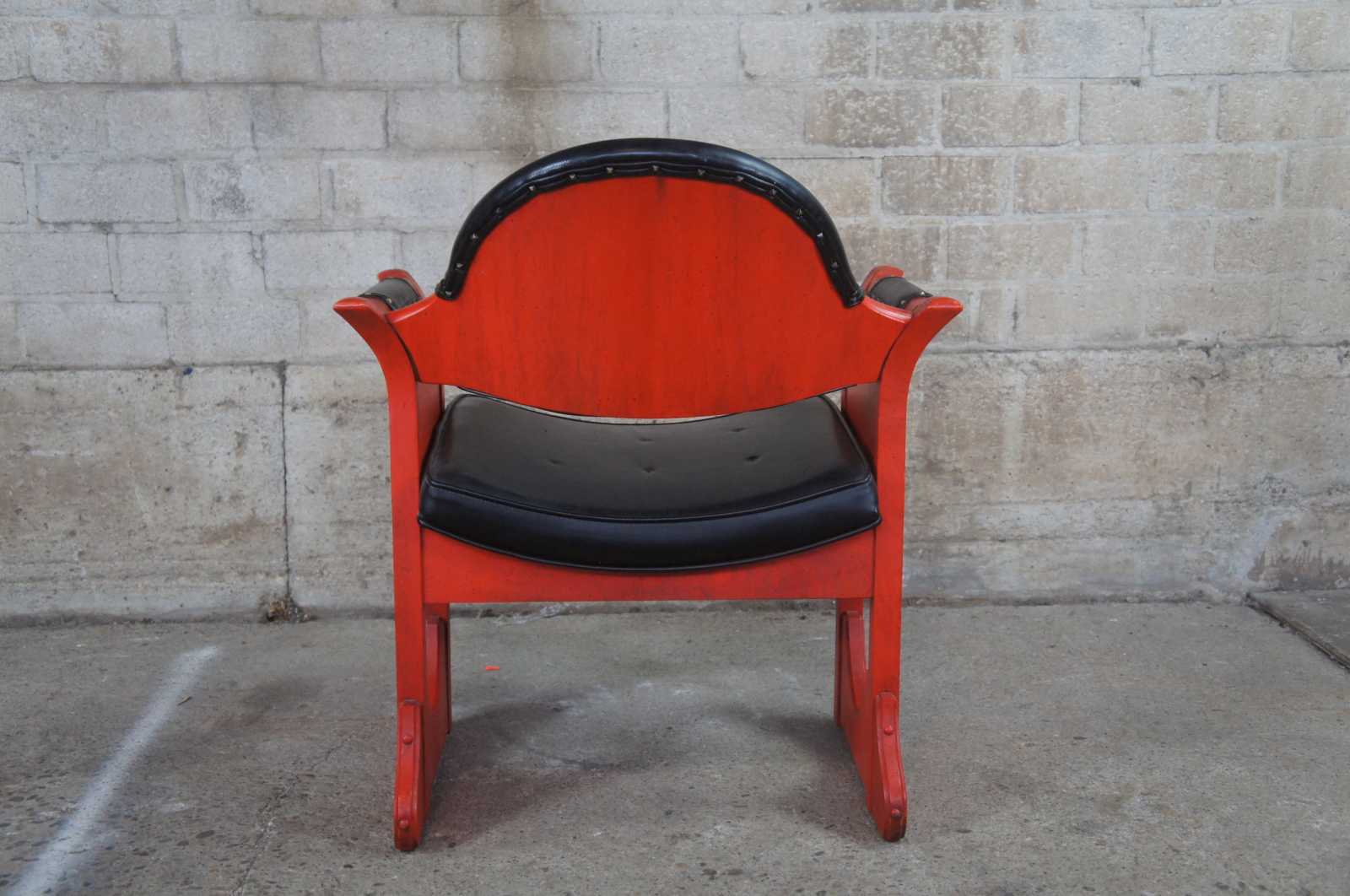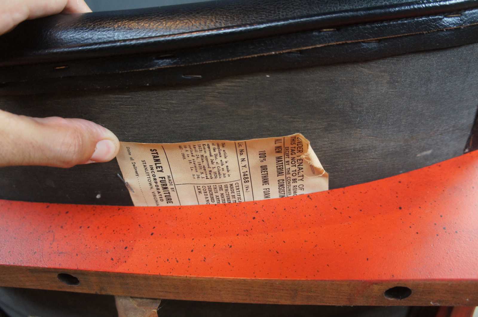 Set of 4 mid century Stanley Furniture arm chairs. Features comfortable saddle seat with padded and flared arms, nailhead trim and tufting. Great addition to any theater, poker or office.
