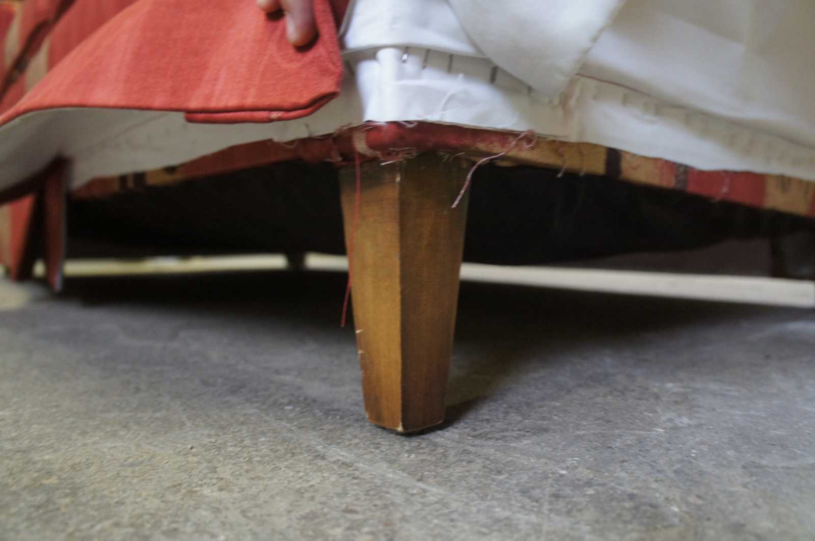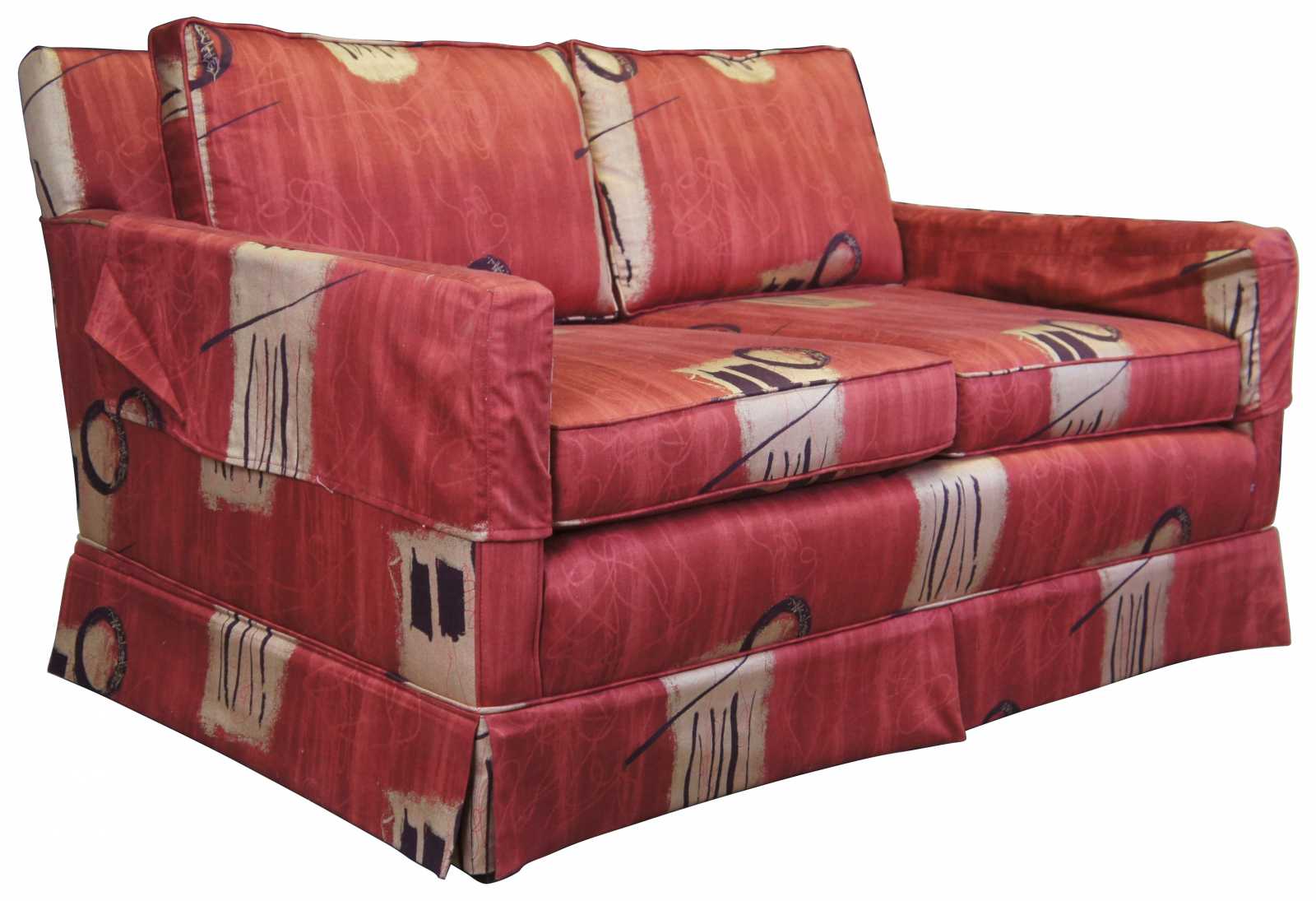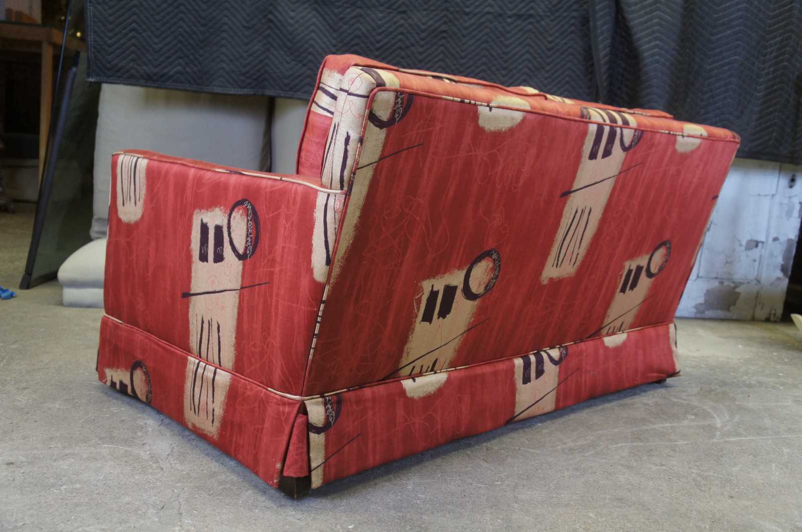 Mid Century red upholstered sofa. Renovated by LT Laquaglia Inc of Dayton Ohio. Features a rectangular form with downfilled rear cushions, arm covers and walnut legs.