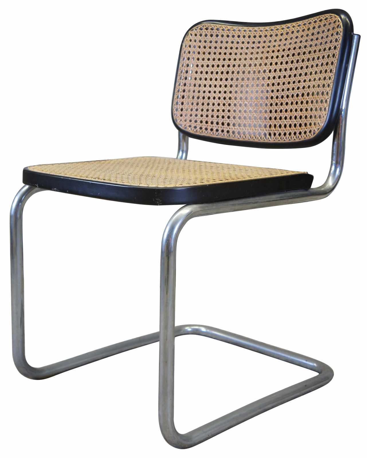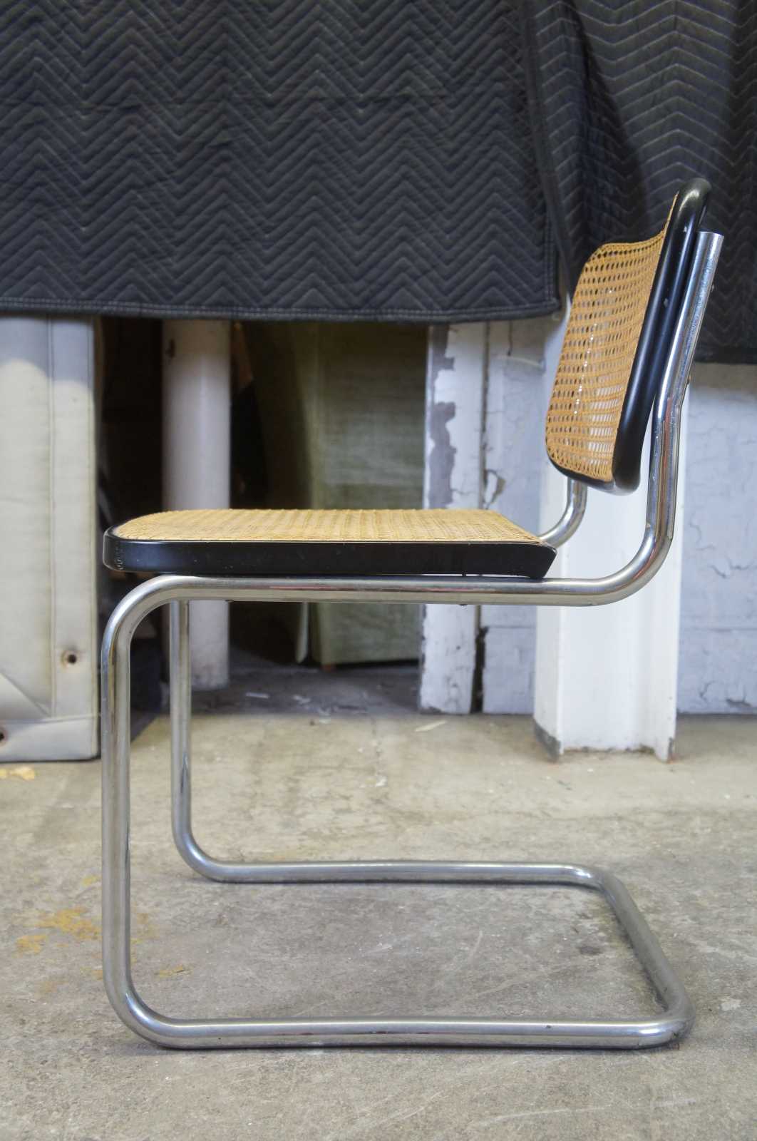 Stendig Breuer Cesca Bauhaus side chair is by Marcel Breuer. The cantilevered stainless steel design is perfect for casual dining spaces. The perfectly balanced stainless steel frame provides sturdy support for the woven rattan seat. A durable ebonized frame surrounds the caned back and seat.