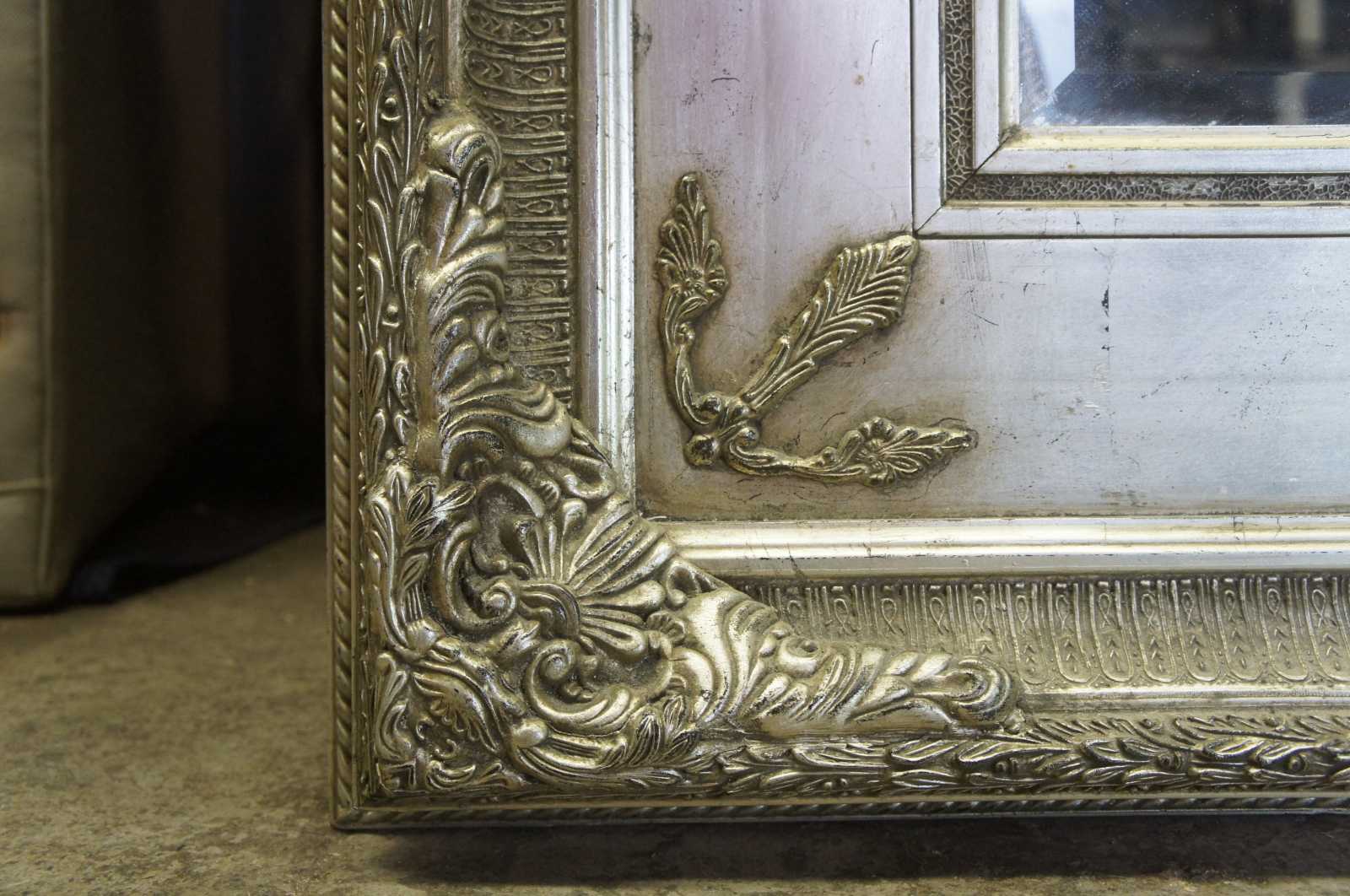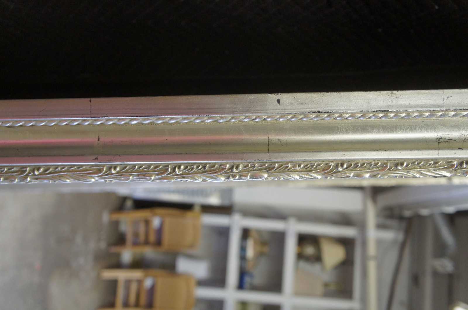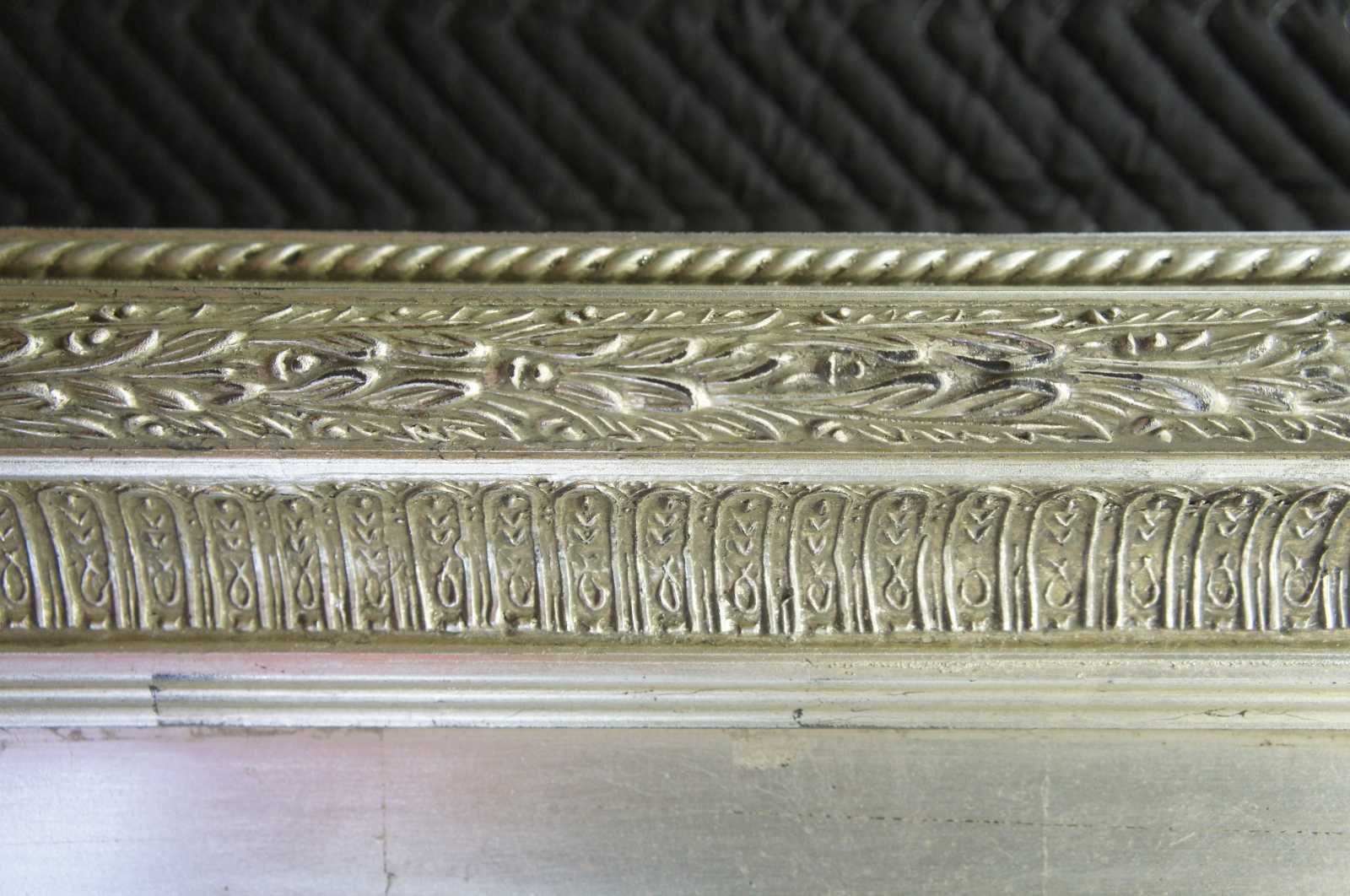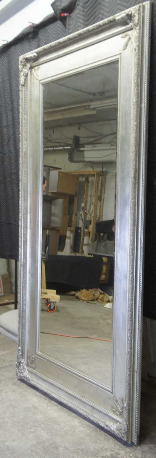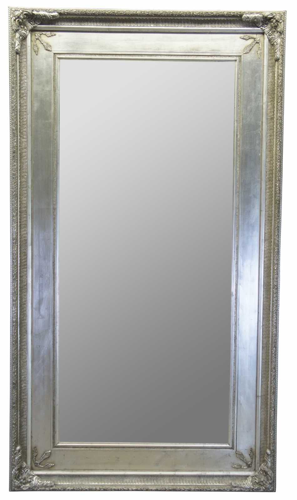 Transitional French inspired full length mirror. Finished in silver with acanthus leaf carvings.