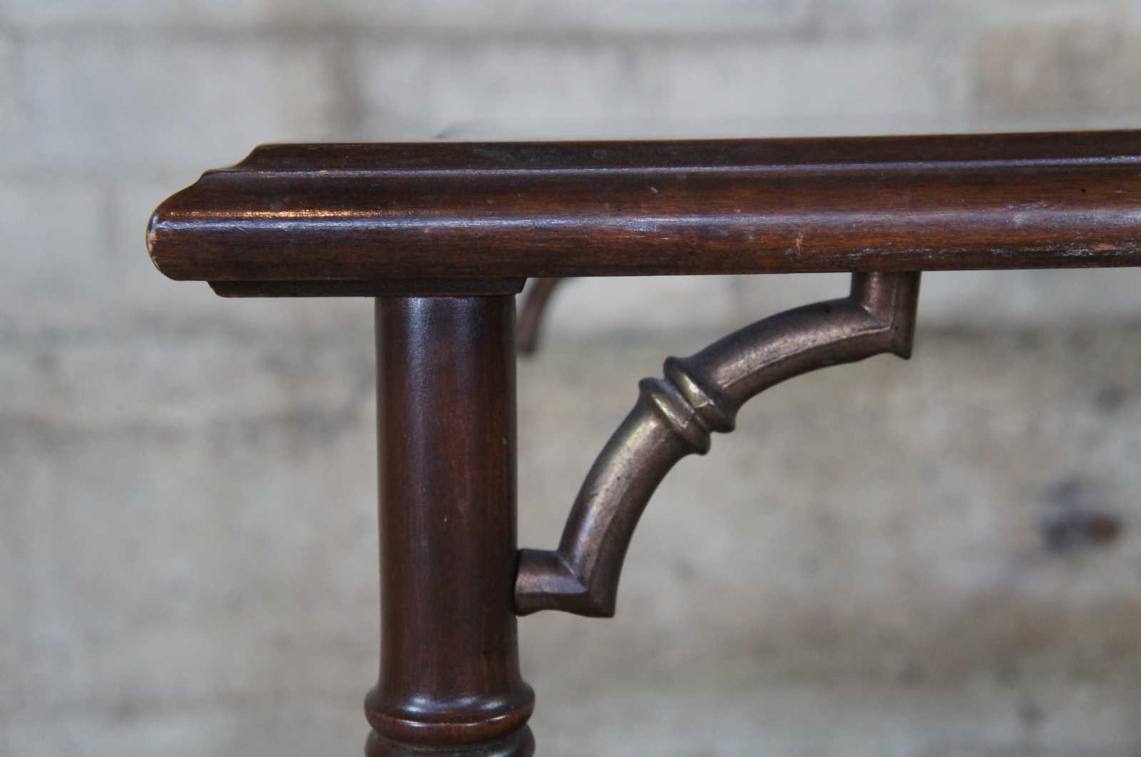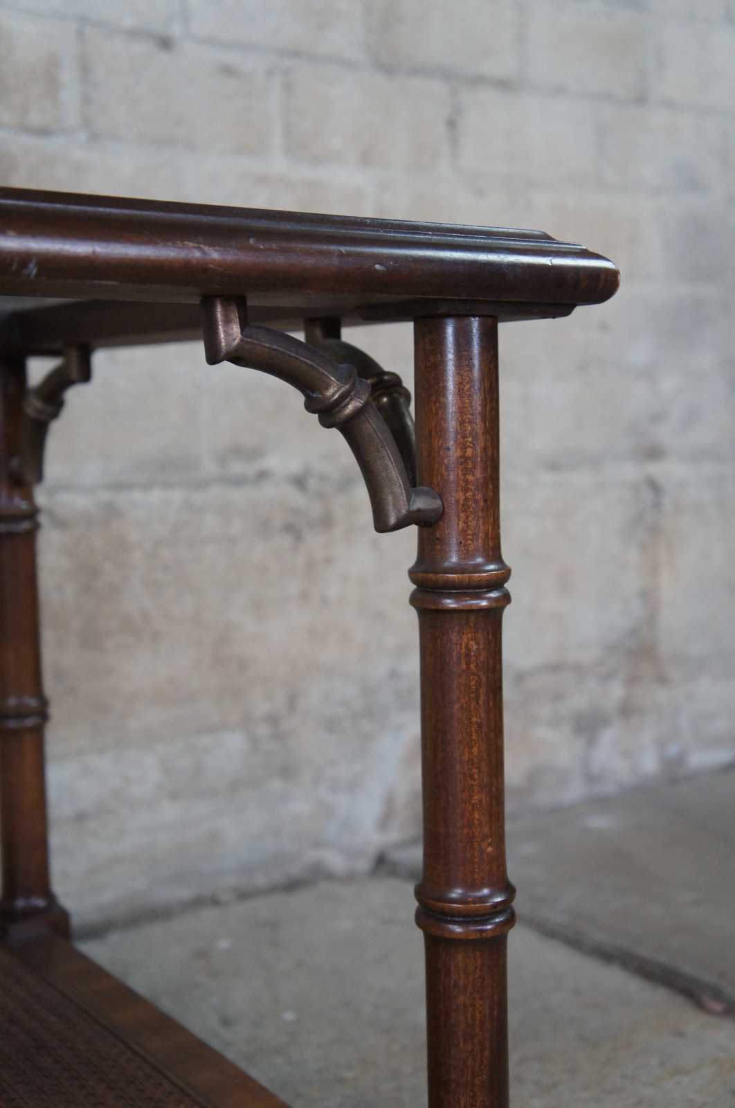 Vintage Lane Altavista two tier side, end or accent table. Made of walnut featuring faux bamboo styling with beveled glass inset top and caned wicker lower tier. Modern Chinoiserie. 1366-05.