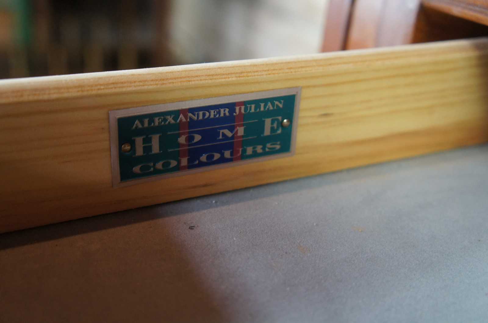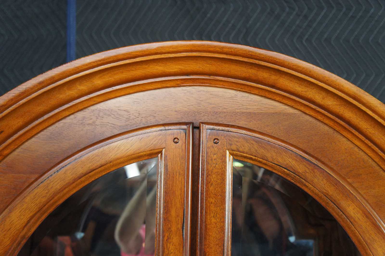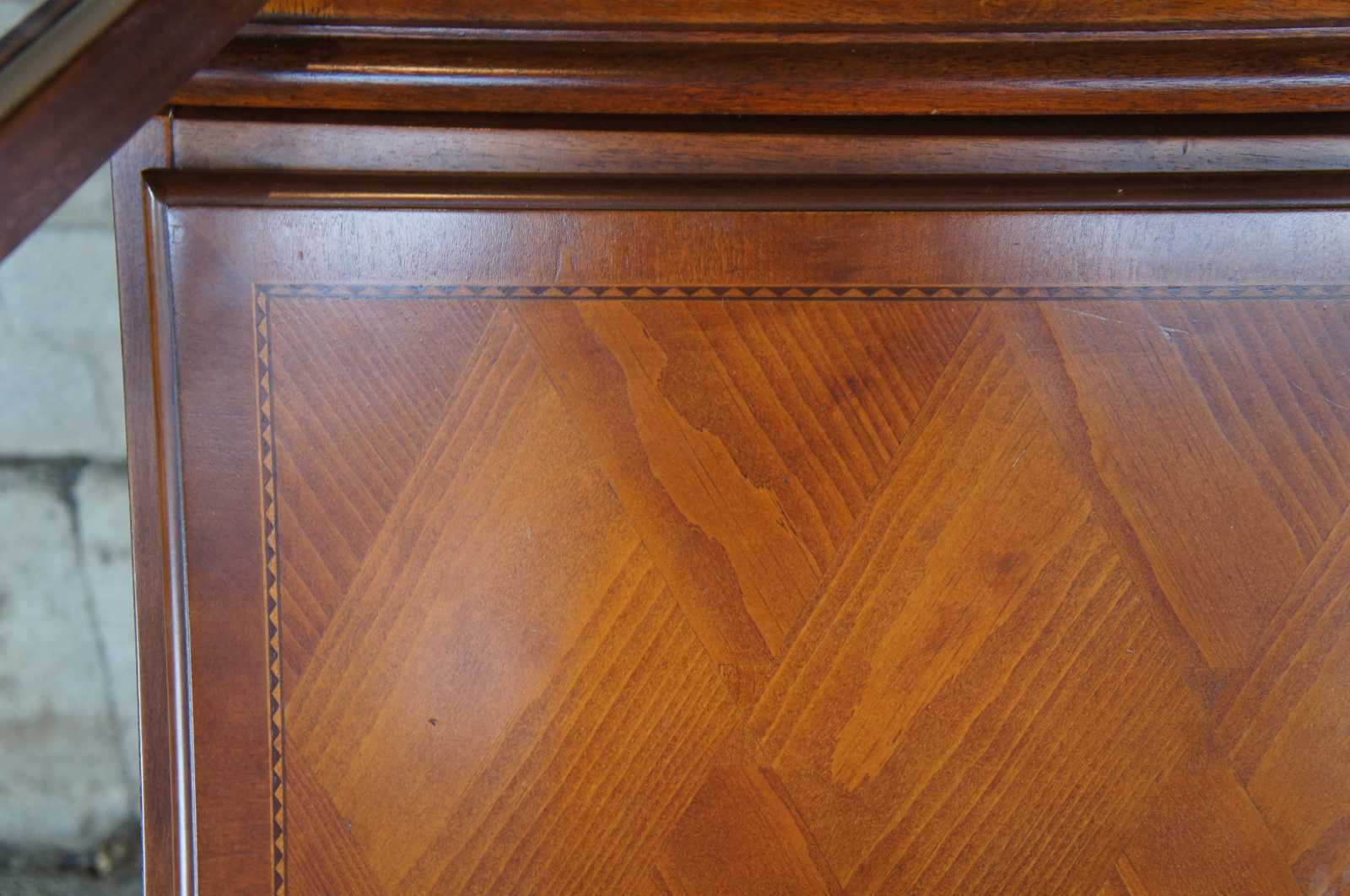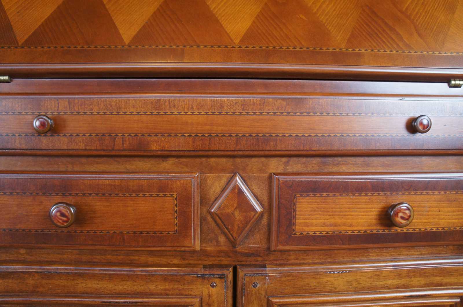 Vintage Alexander Julian Home Colours secretary desk cabinet. Made of cherry featuring an arched or domed top, mirrored back, two adjustable glass shelves, and beveled glass door fronts. The base cabinet features a drop front secretary with diamond shaped parquetry inlay and triangular geometric bands. Opens to reveal five letter or cubby slots flanked by three small drawers to either side and one long drawer in the center. Below, one shallow full-width drawer, two half-width drawers, and a double door cabinet offer additional storage. The piece is supported by ogee bracket feet.