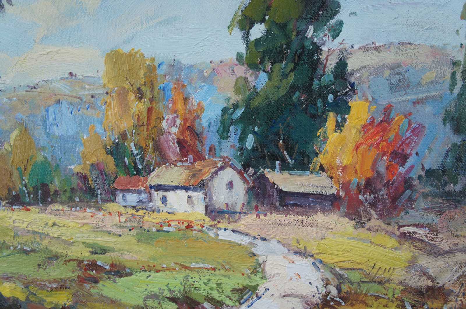 Original oil painting by Feng H.M. Featuring a landscape scene with a road leading to a grouping of cottages set against the backdrop of a large hillside or mountain range. Circa 2009.