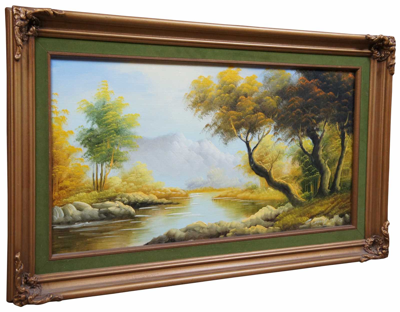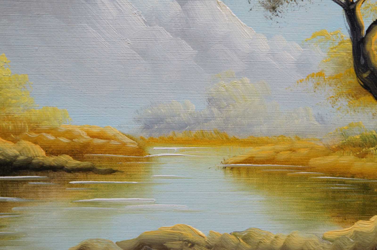 Vintage oil on canvas painting showing a Autumn landscape with river and mountains; signed Campillo in the lower corner.