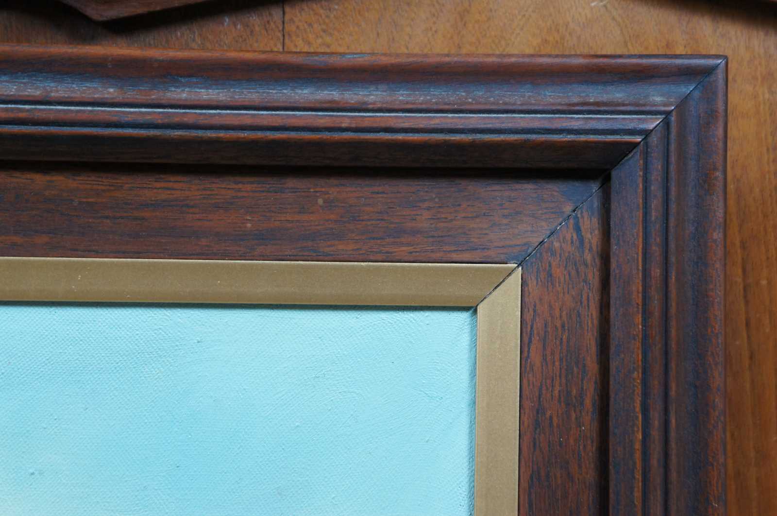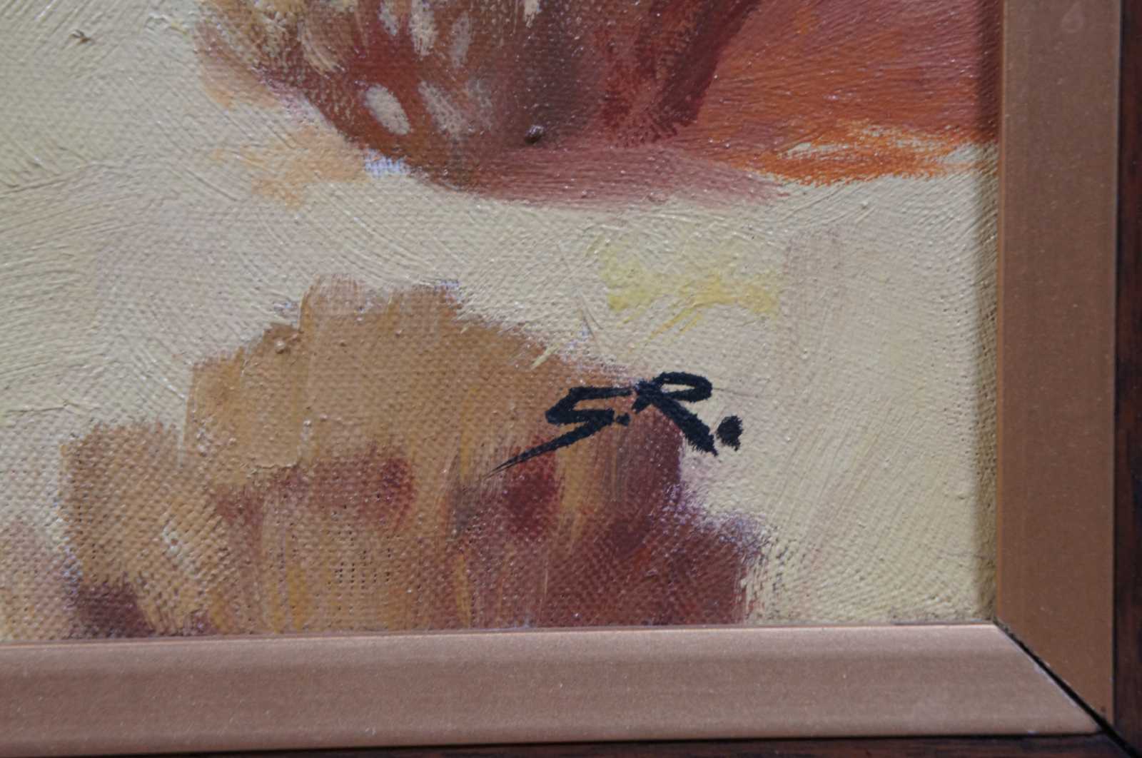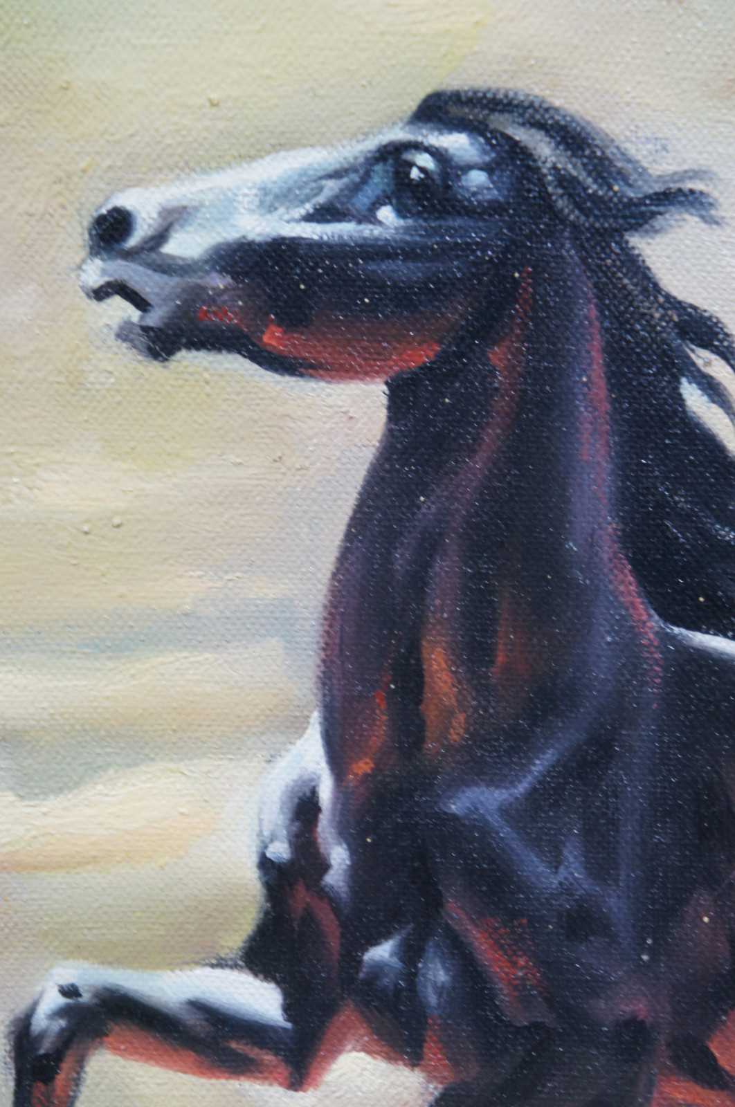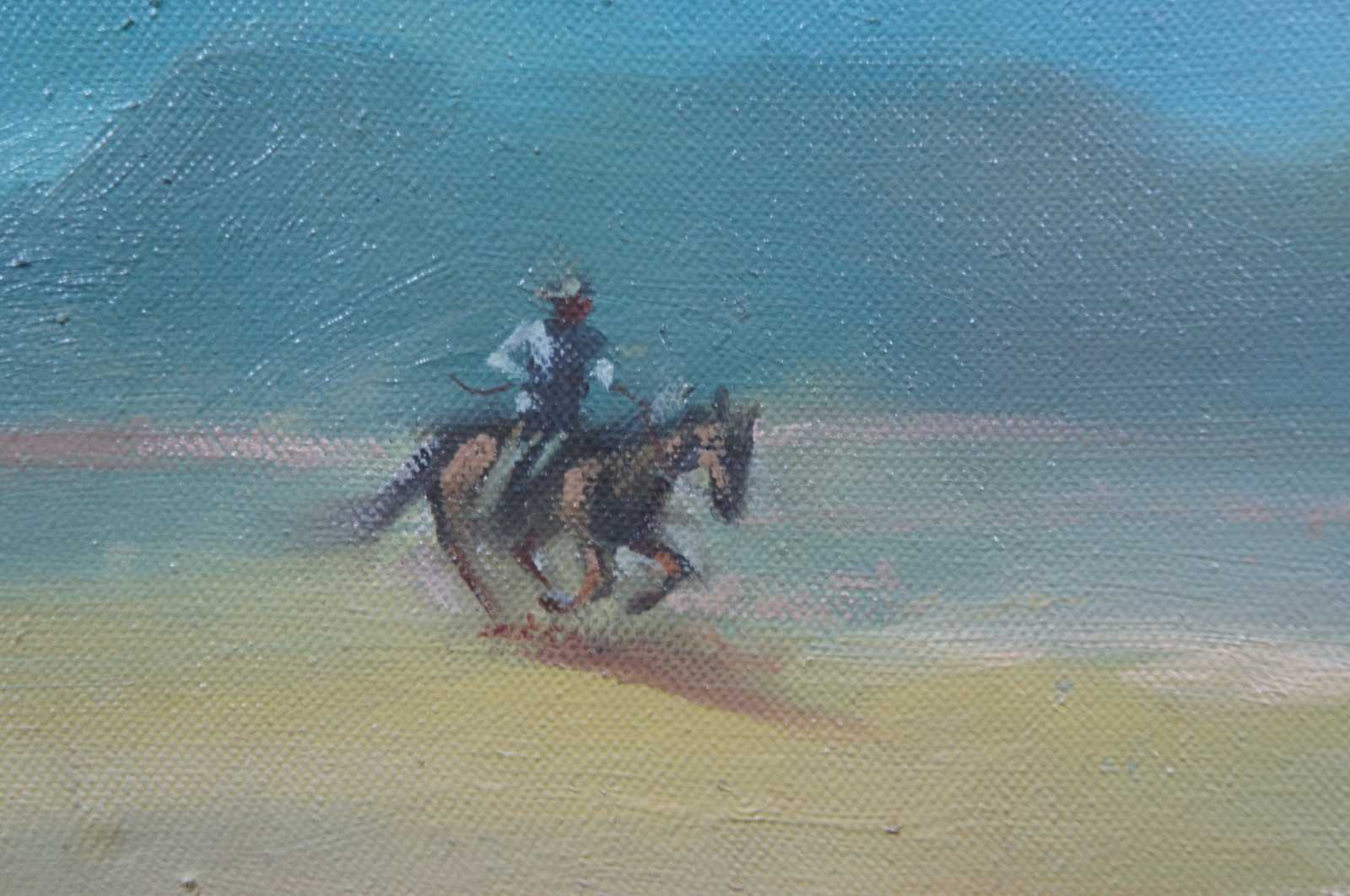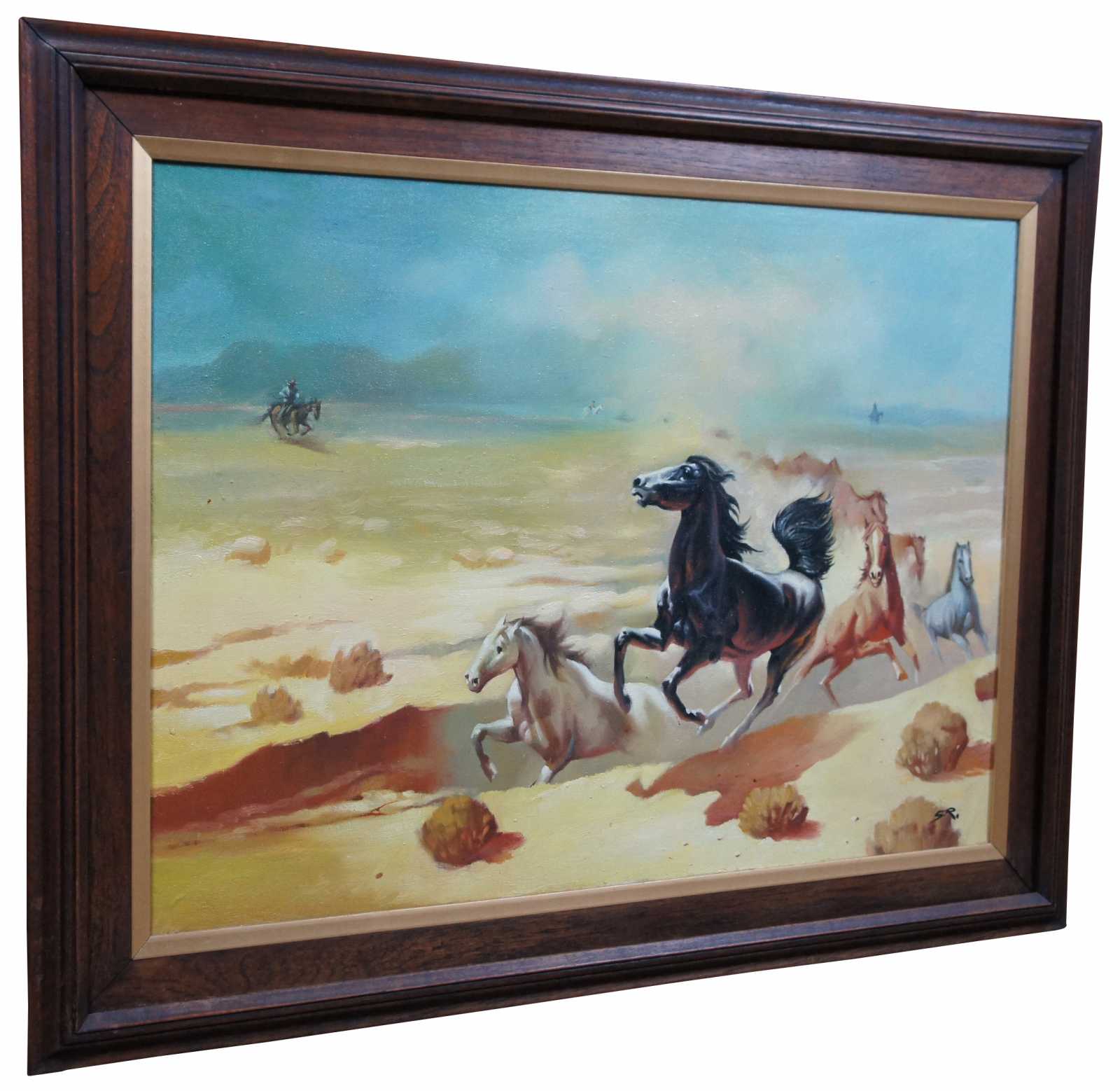 Vintage surrealist oil on canvas landscape painting showing Western cowboys herding wild horses; signed SR in the bottom corner.