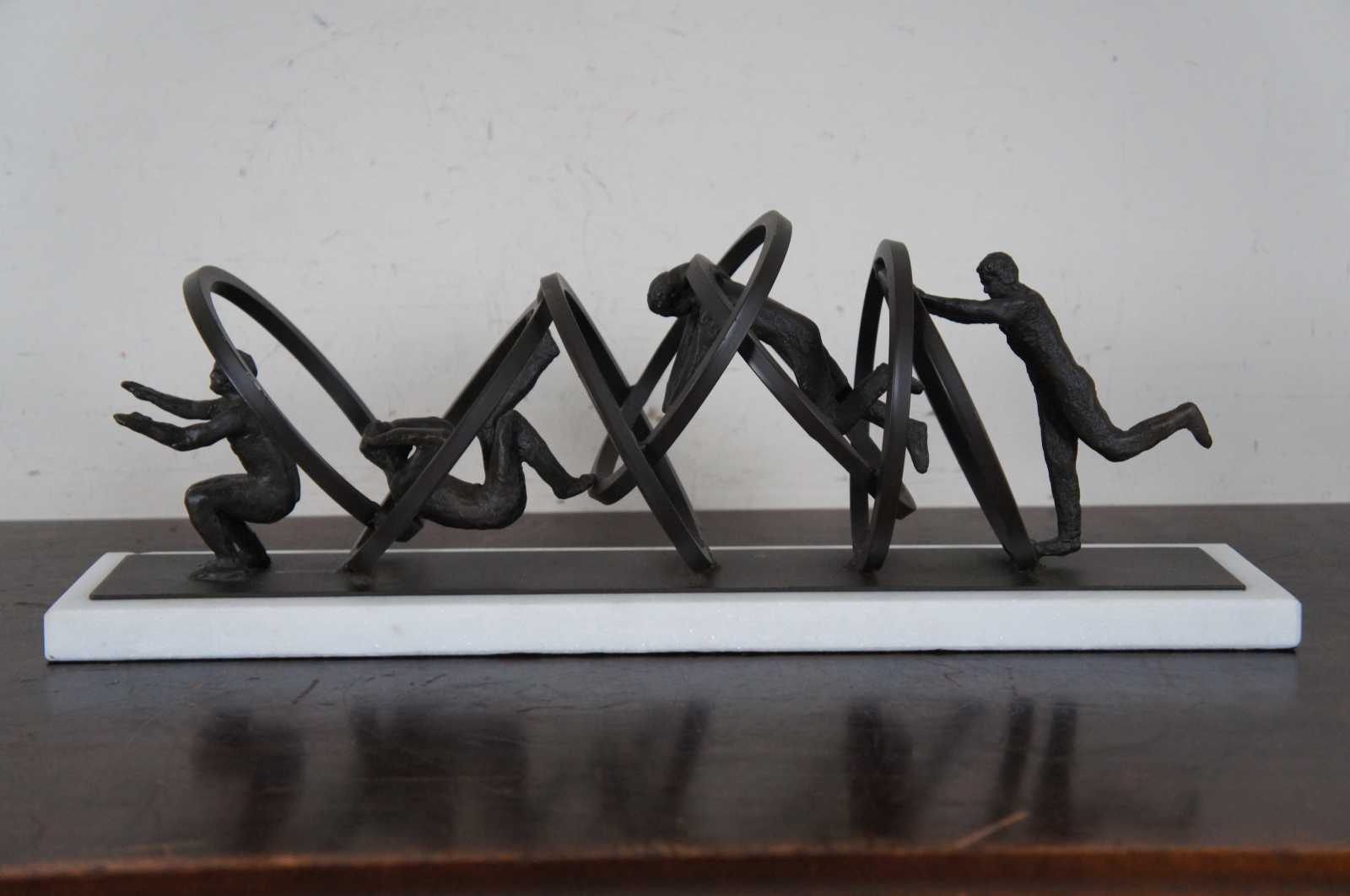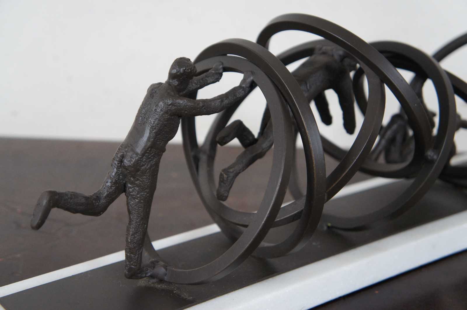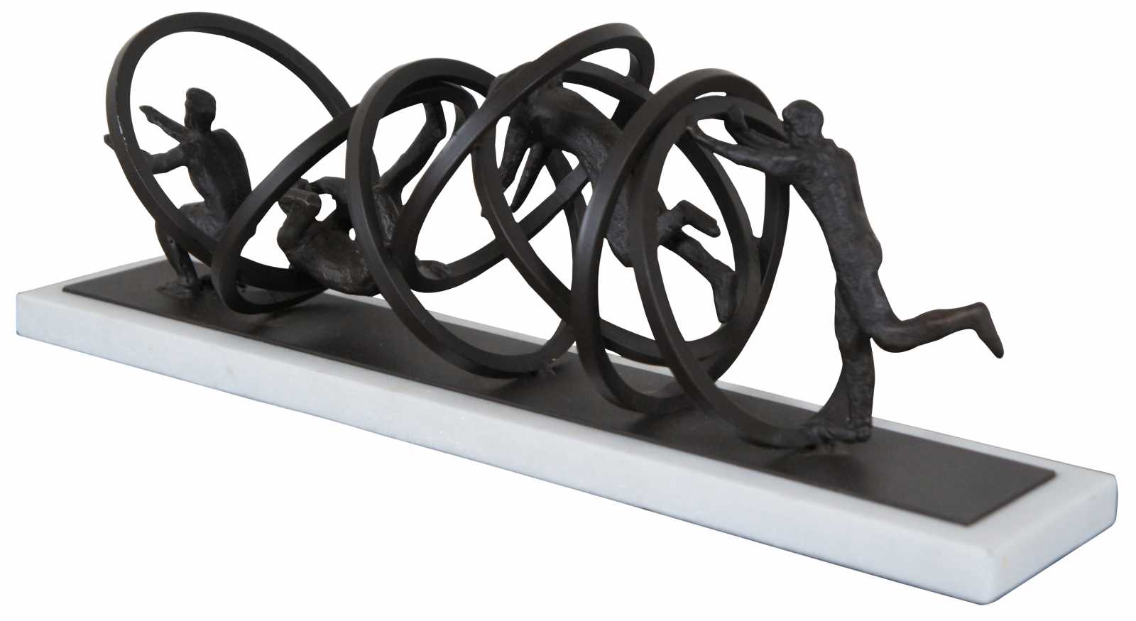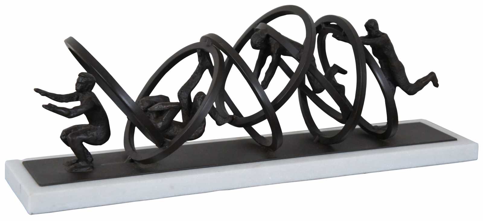 Global Views iron sculpture showing a series of tumbling men, trying to reach the end. Made of iron and sits on a white marble base. Titled, Jumping Through Hoops.