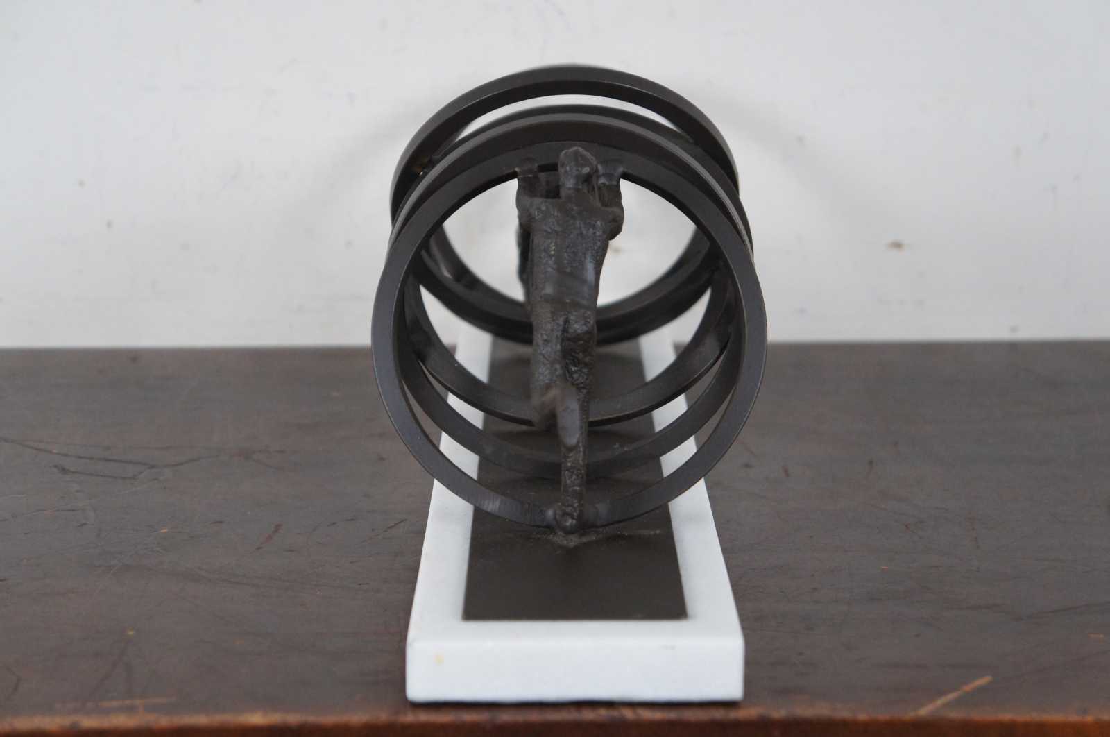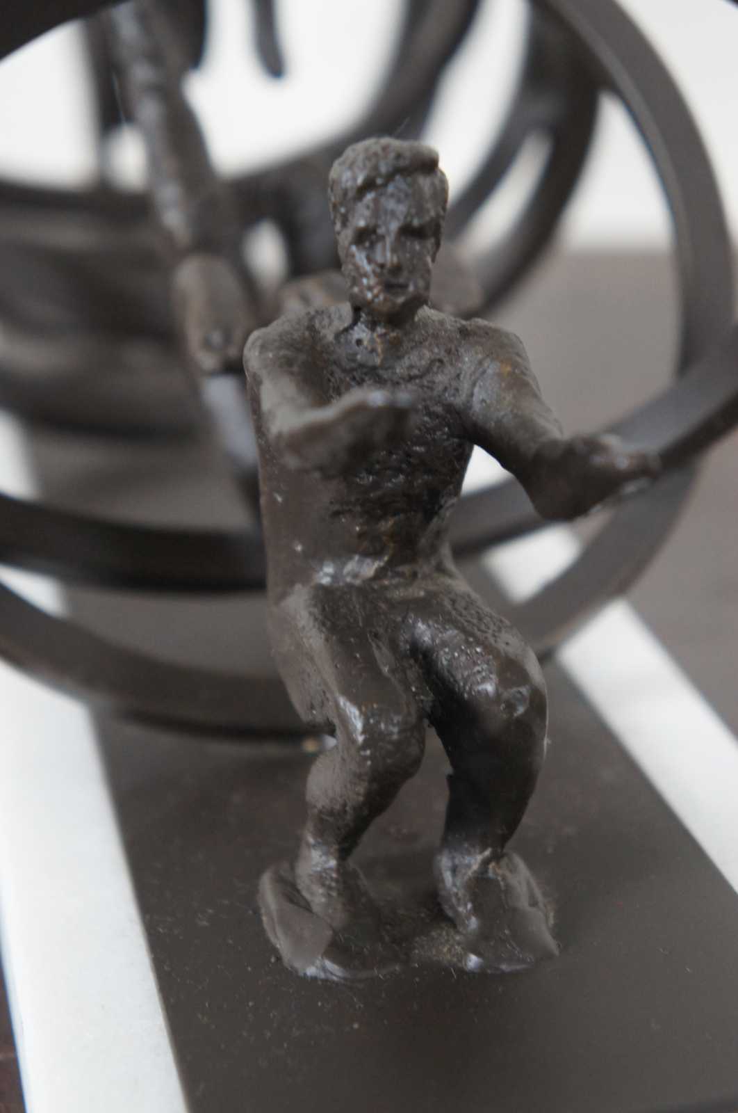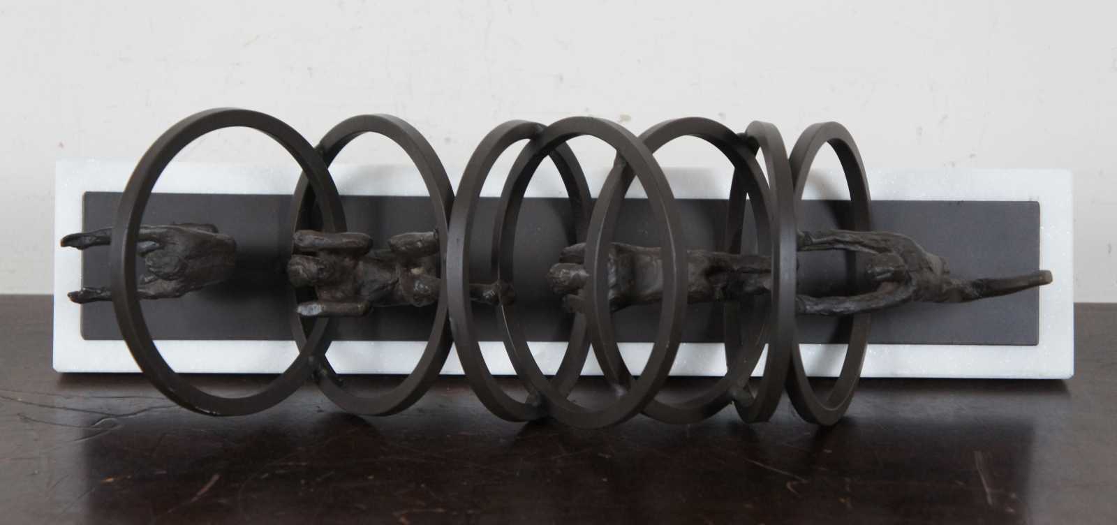 Global Views iron sculpture showing a series of tumbling men, trying to reach the end. Made of iron and sits on a white marble base. Titled, Jumping Through Hoops.