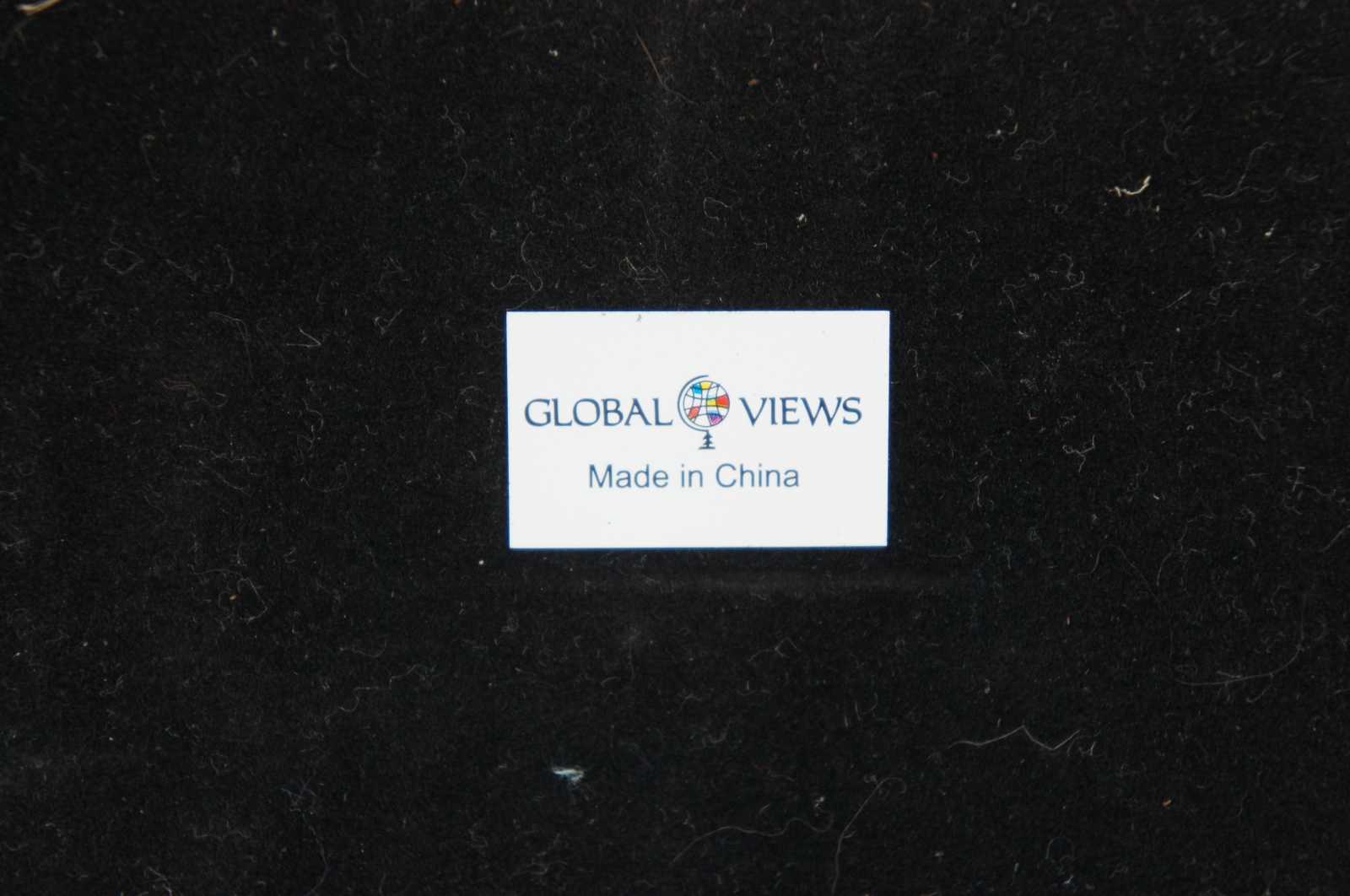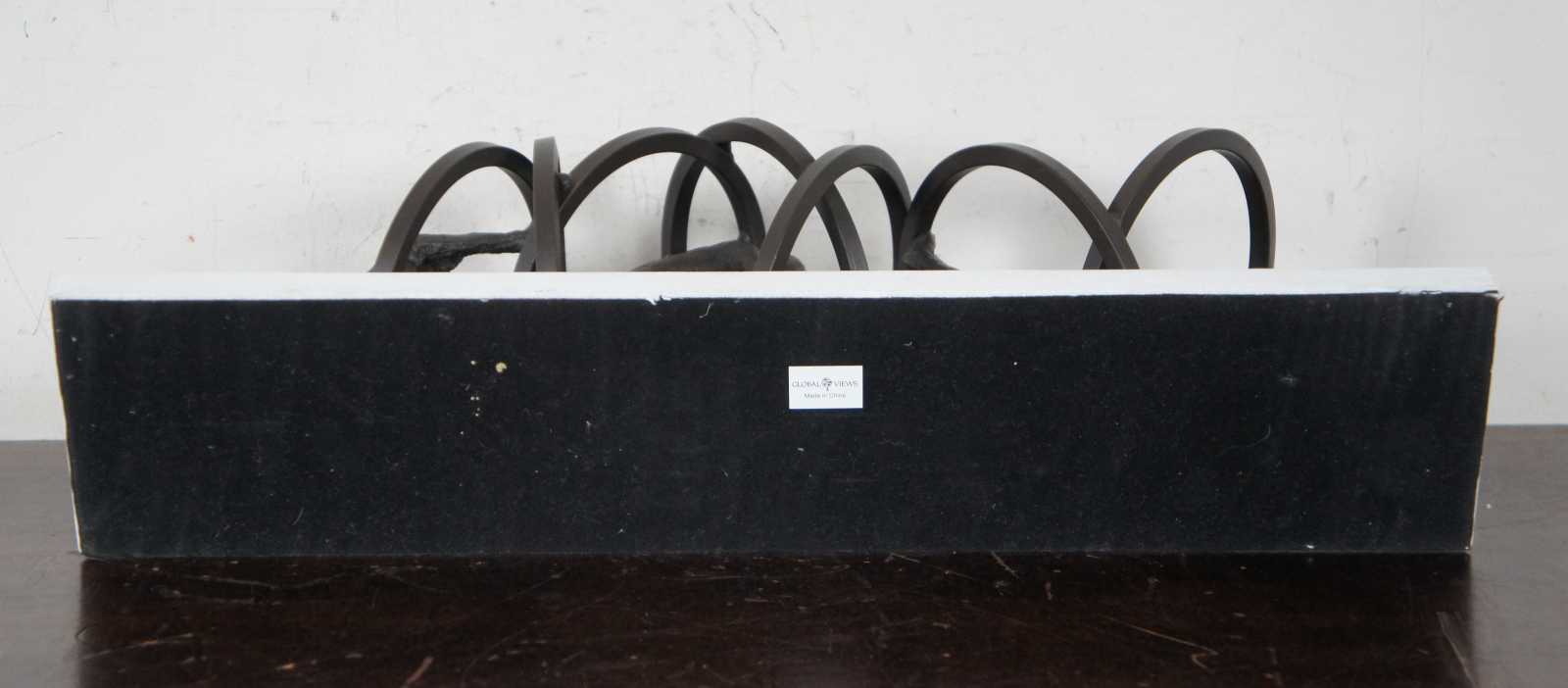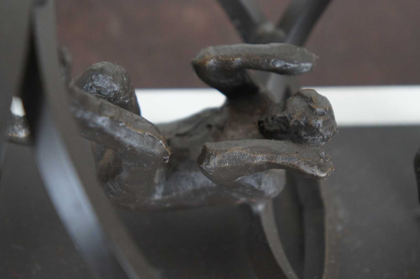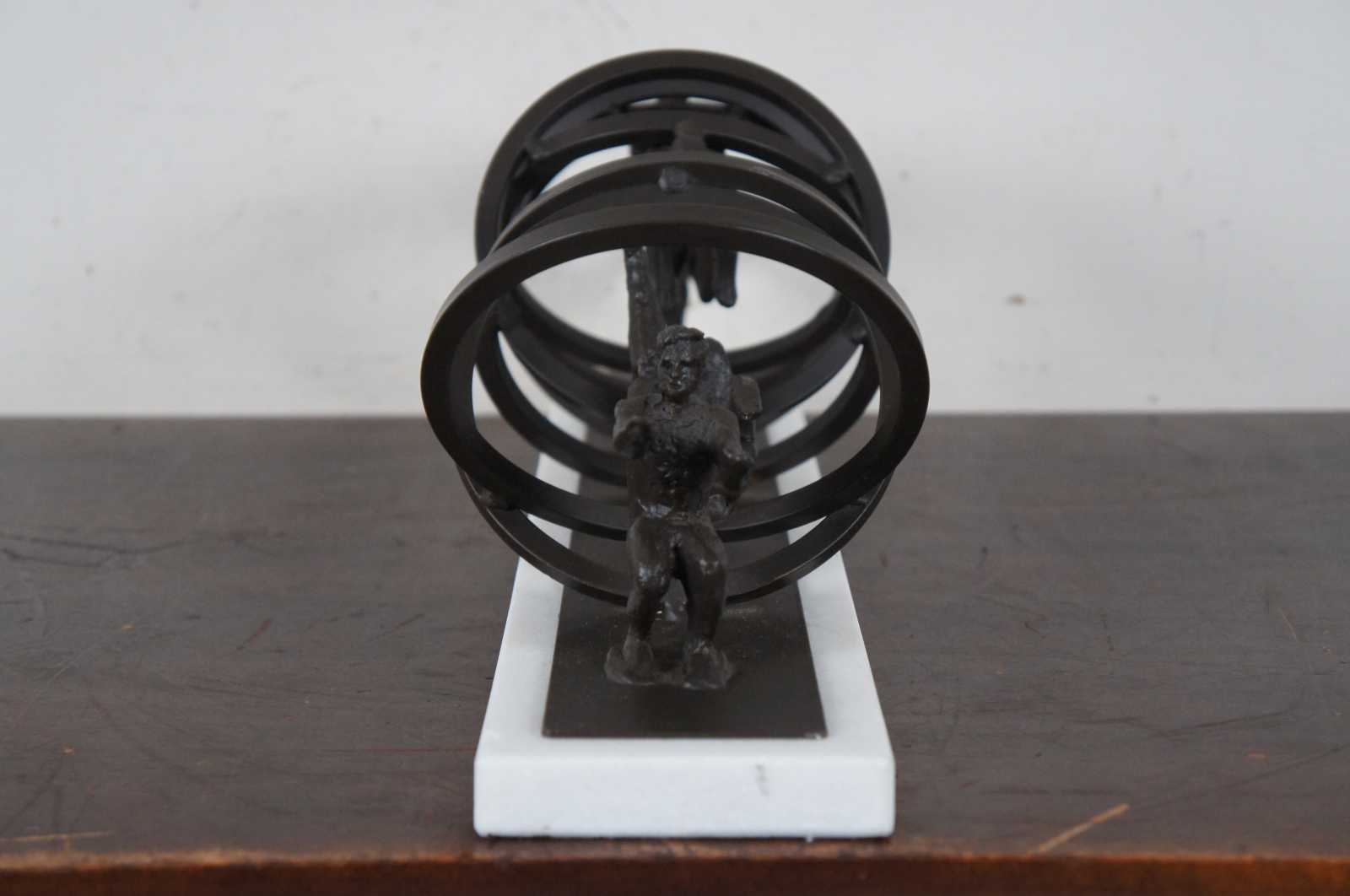 Global Views iron sculpture showing a series of tumbling men, trying to reach the end. Made of iron and sits on a white marble base. Titled, Jumping Through Hoops.