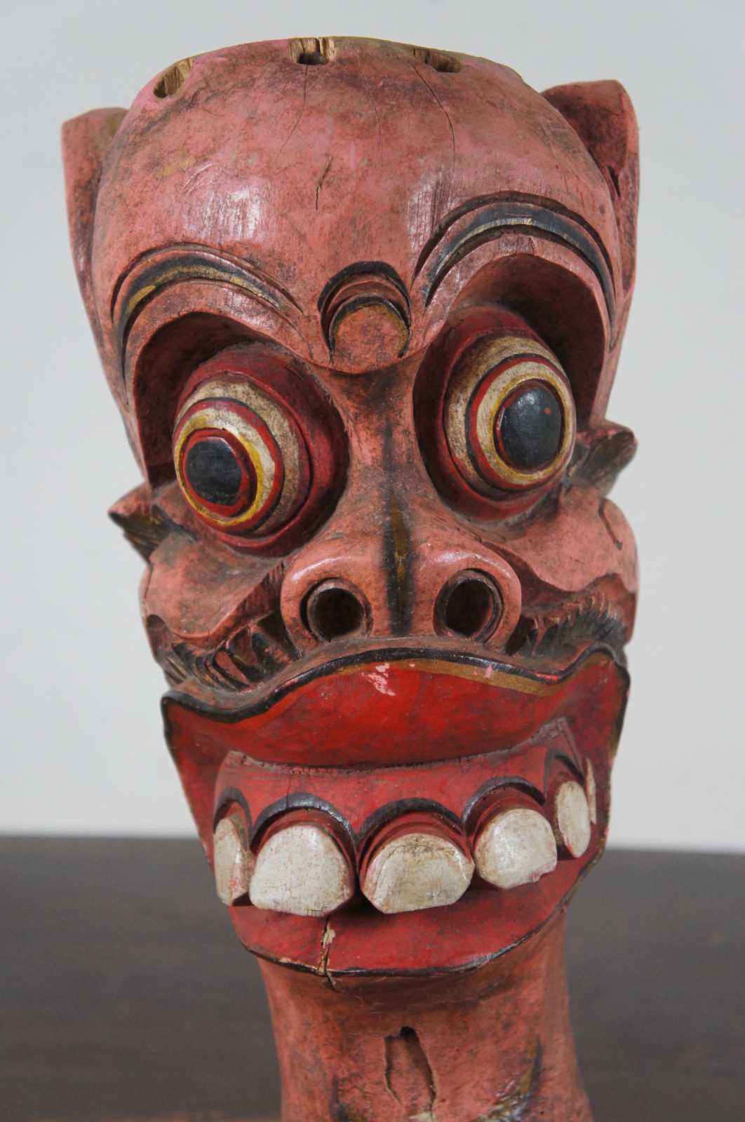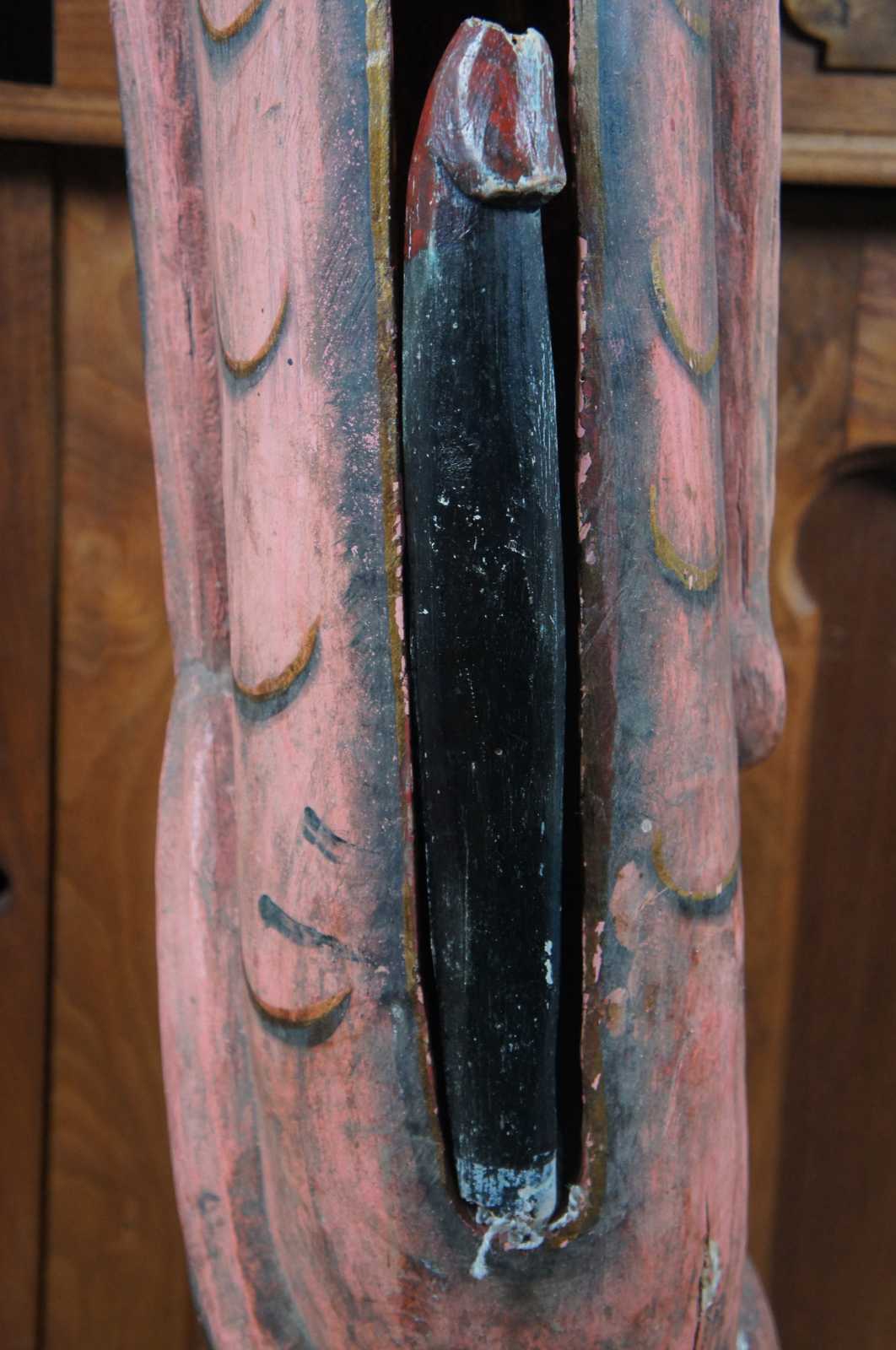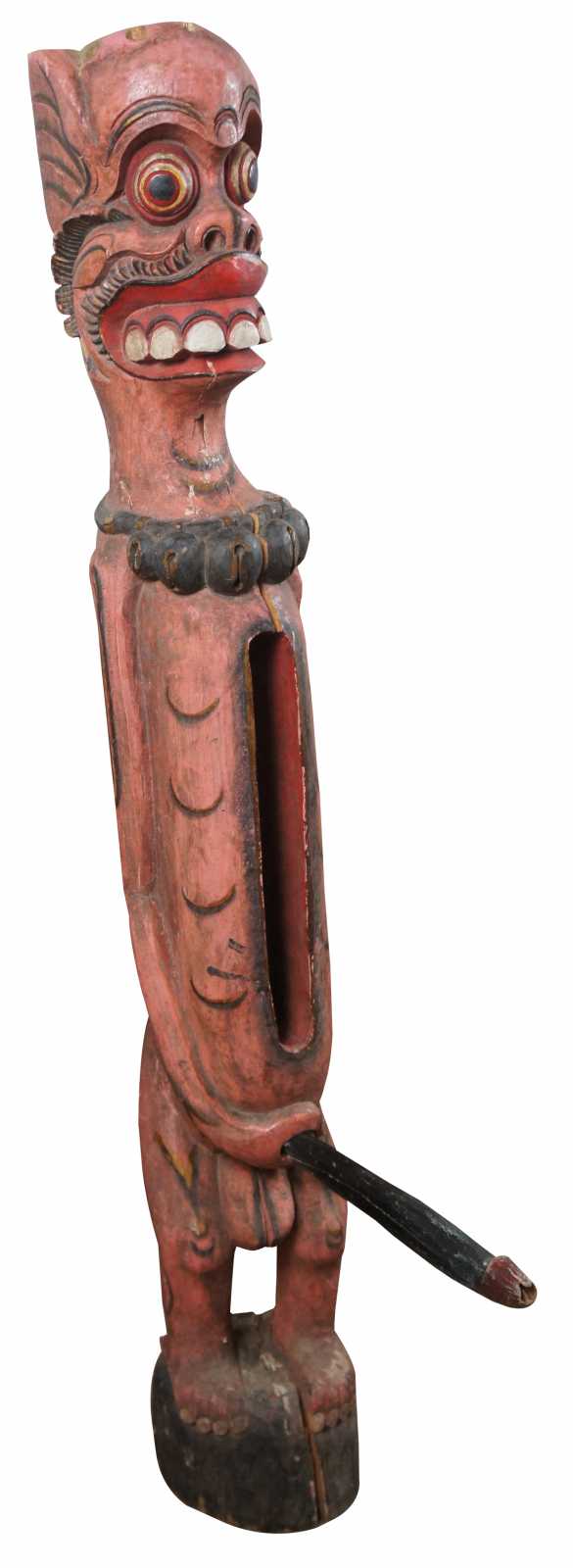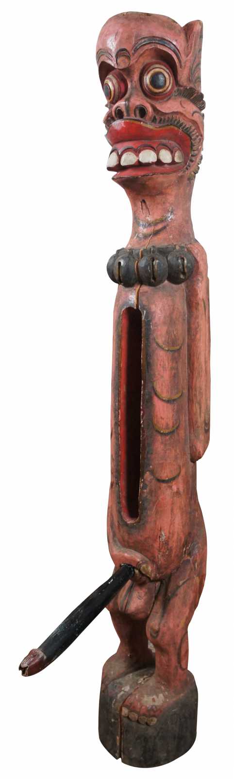 Vintage Indonesian hand carved wooden slit drum / tribal fertility figure painted in red and black with bells around it’s neck and open space in the torso to store the detachable phallus / penis.