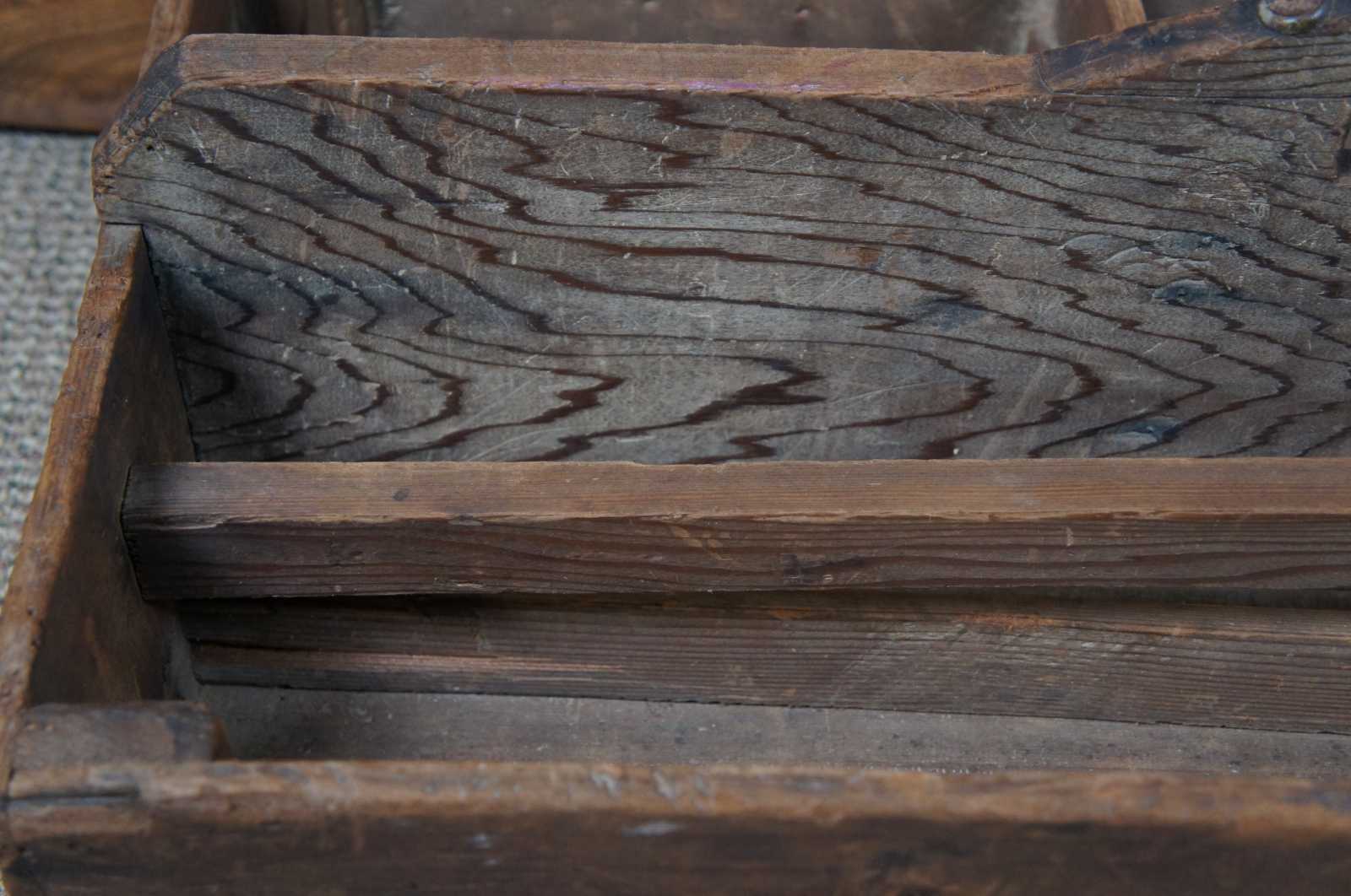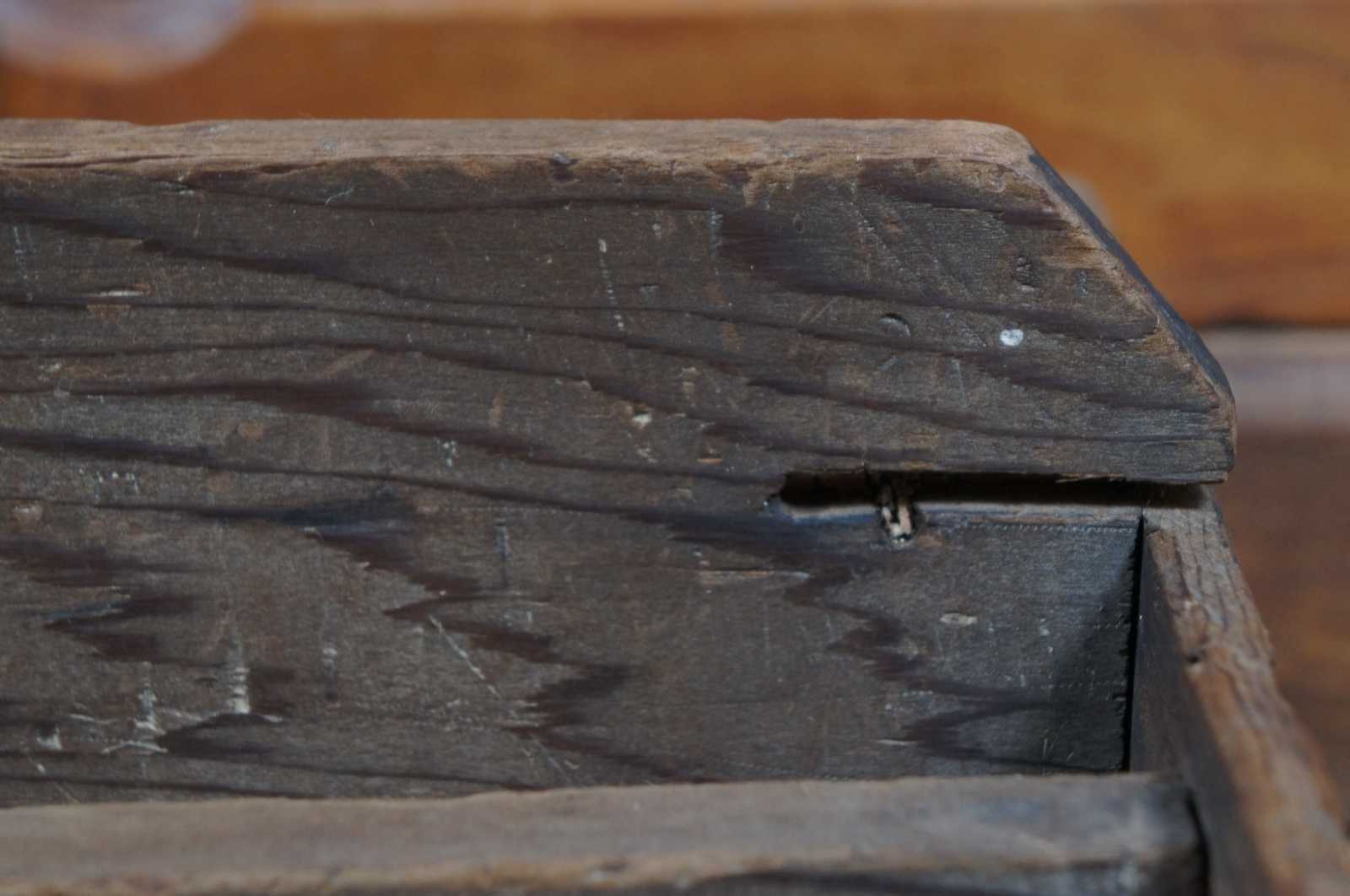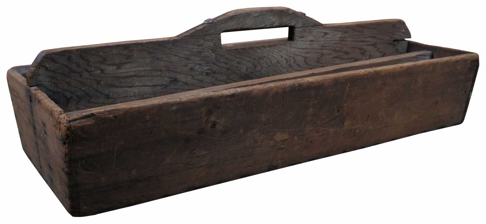 Antique primitive country farmhouse mid 19th century carpenters tote or tool box with center handle and built in dividers.