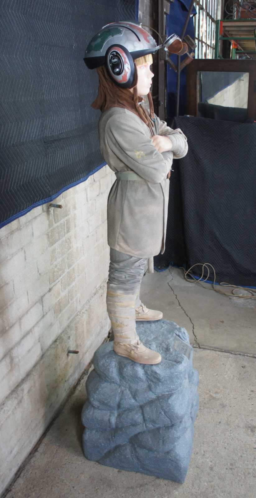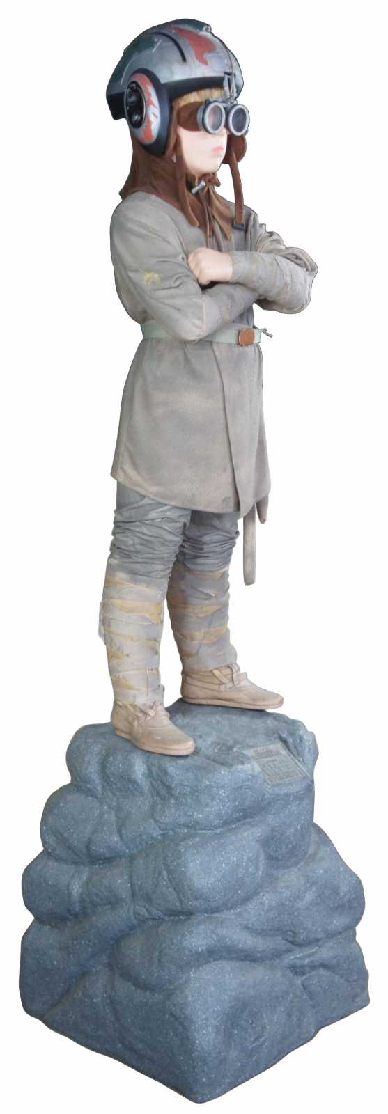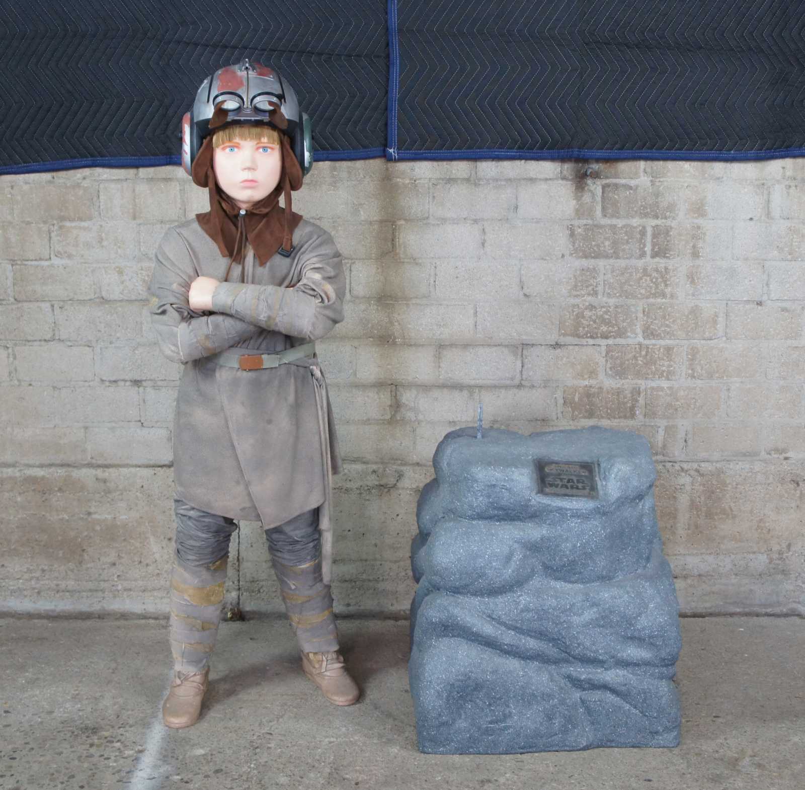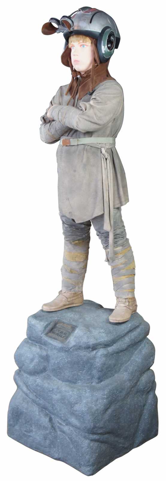 Life size fiberglass prop of Anakin Skywalker from Star Wars Episode 1. Features Lord Vader as a youth in his pod racing outfit with articulating goggles standing cross arm atop a boulder. Displayed at JC Penney and given away as a raffle promotion to 275 lucky winners. Designed by Don Post for Lucasfilm in 1999.