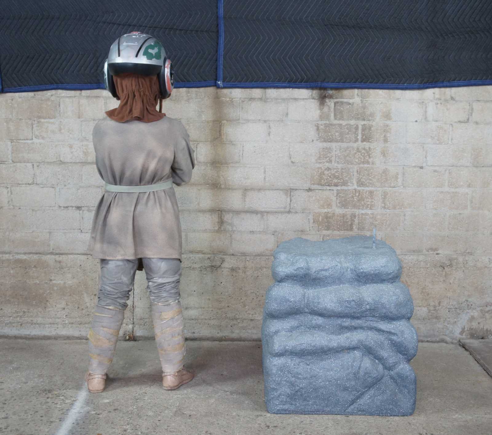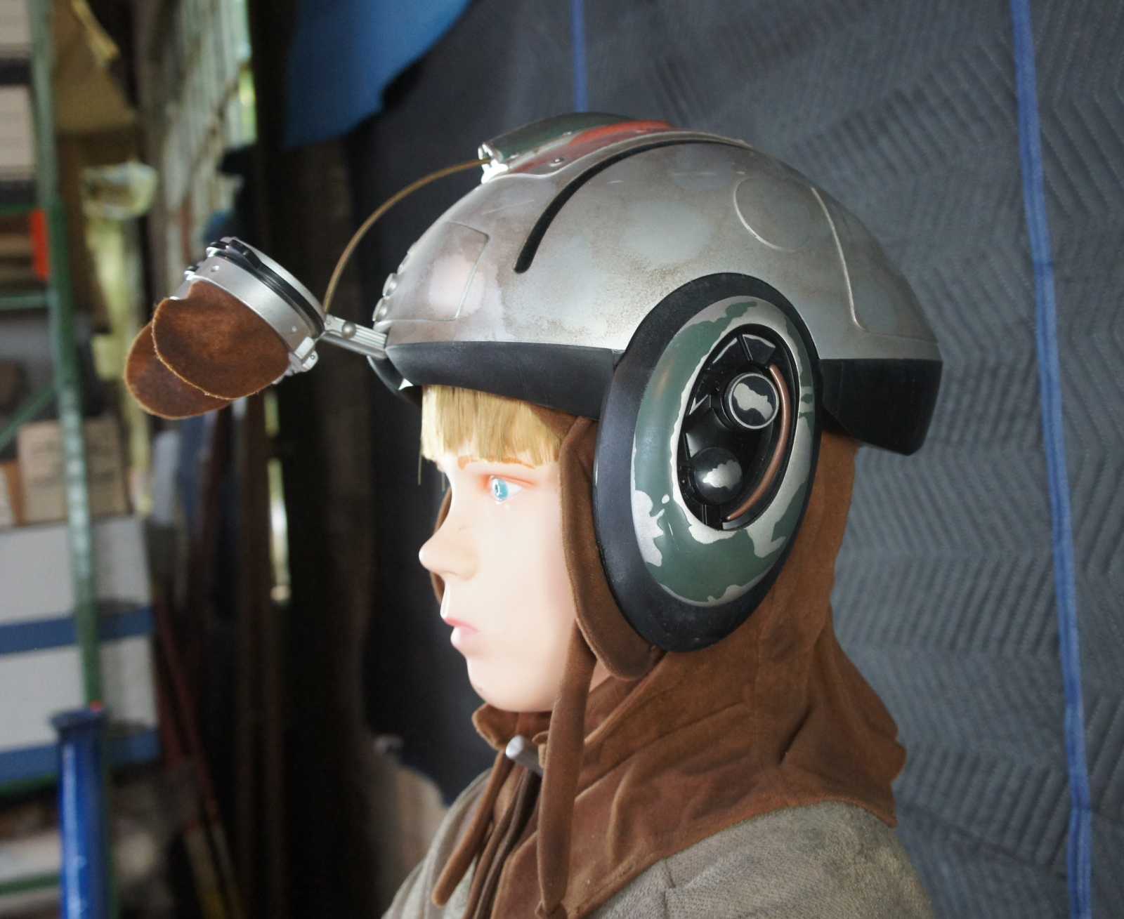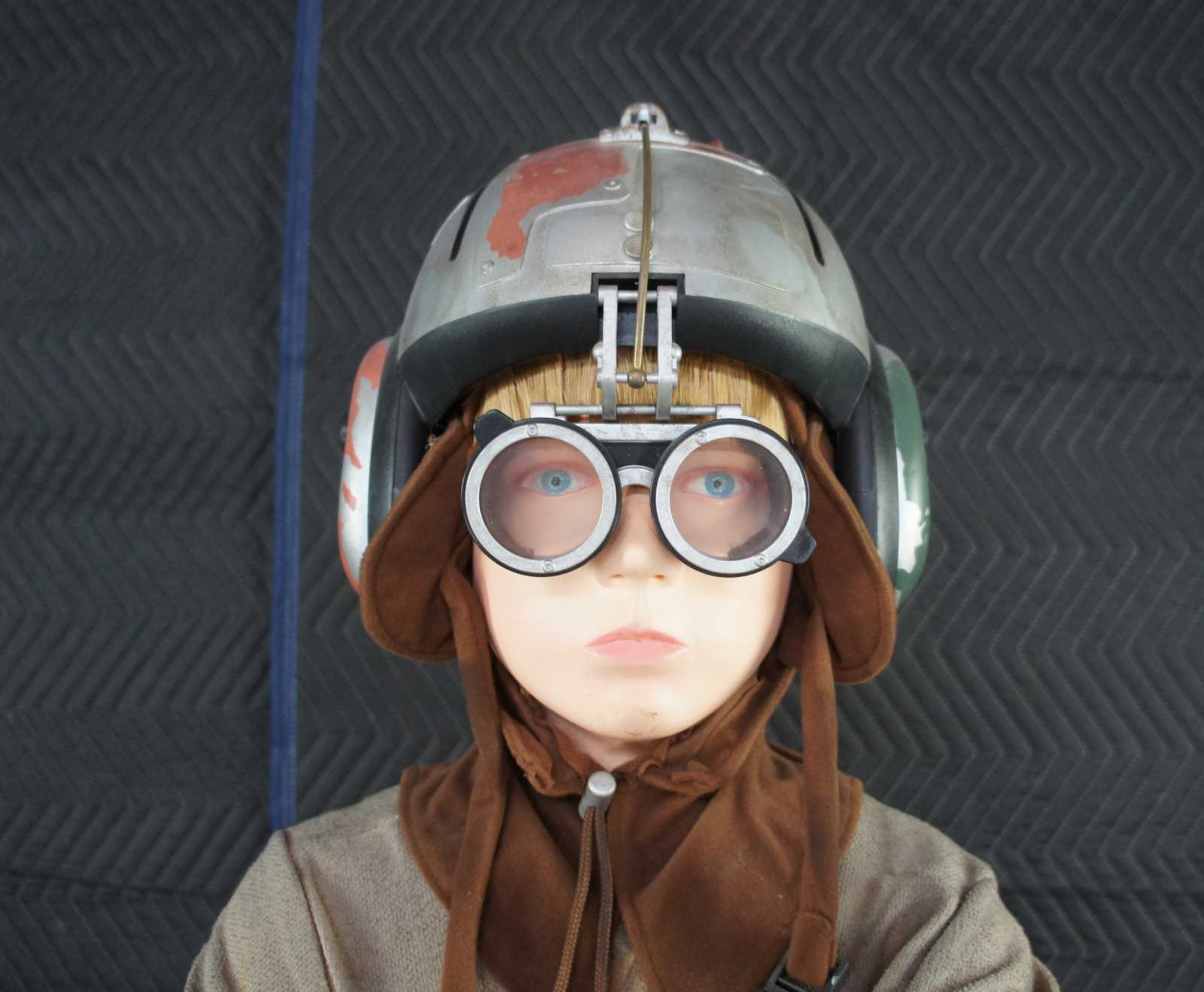 Life size fiberglass prop of Anakin Skywalker from Star Wars Episode 1. Features Lord Vader as a youth in his pod racing outfit with articulating goggles standing cross arm atop a boulder. Displayed at JC Penney and given away as a raffle promotion to 275 lucky winners. Designed by Don Post for Lucasfilm in 1999.