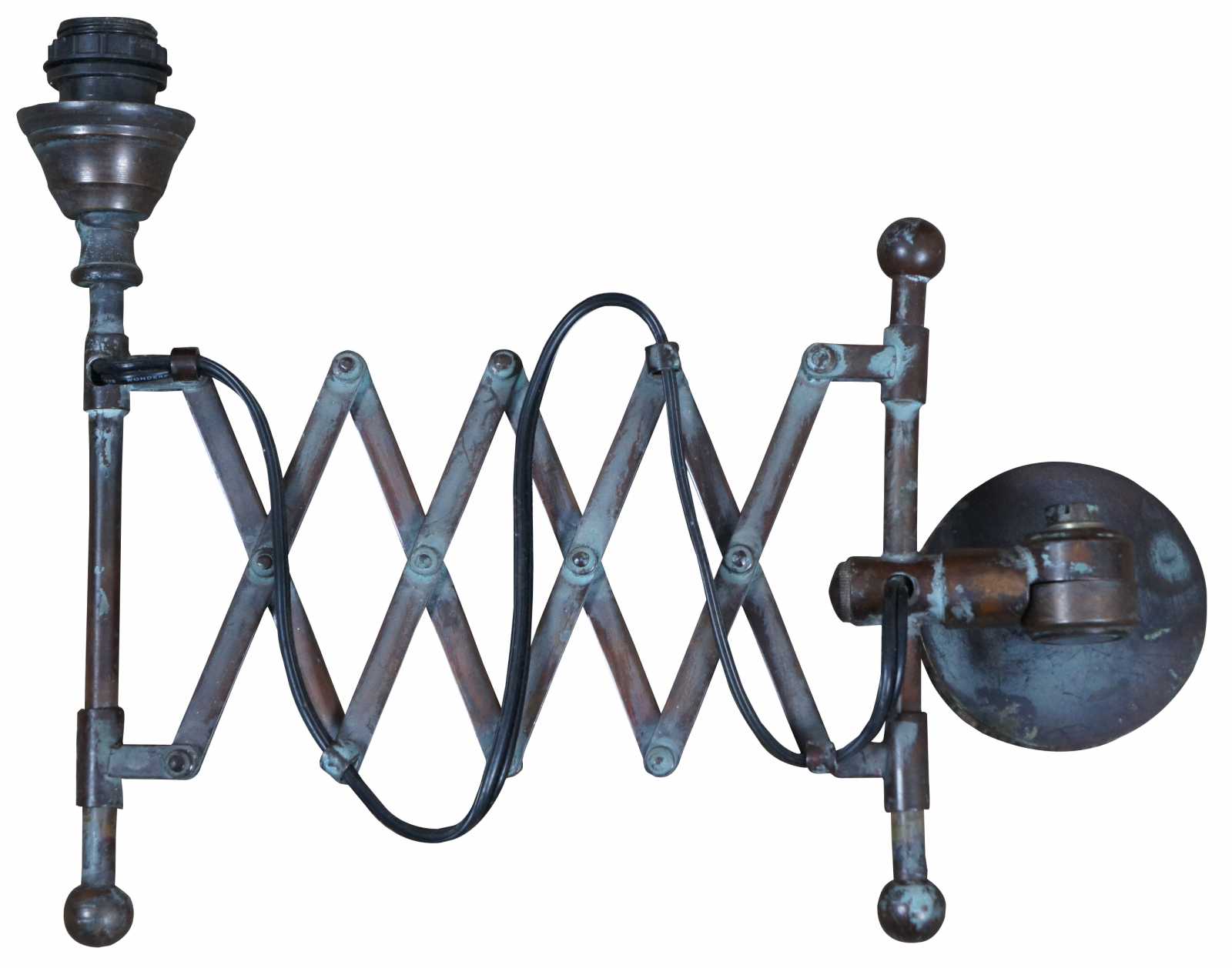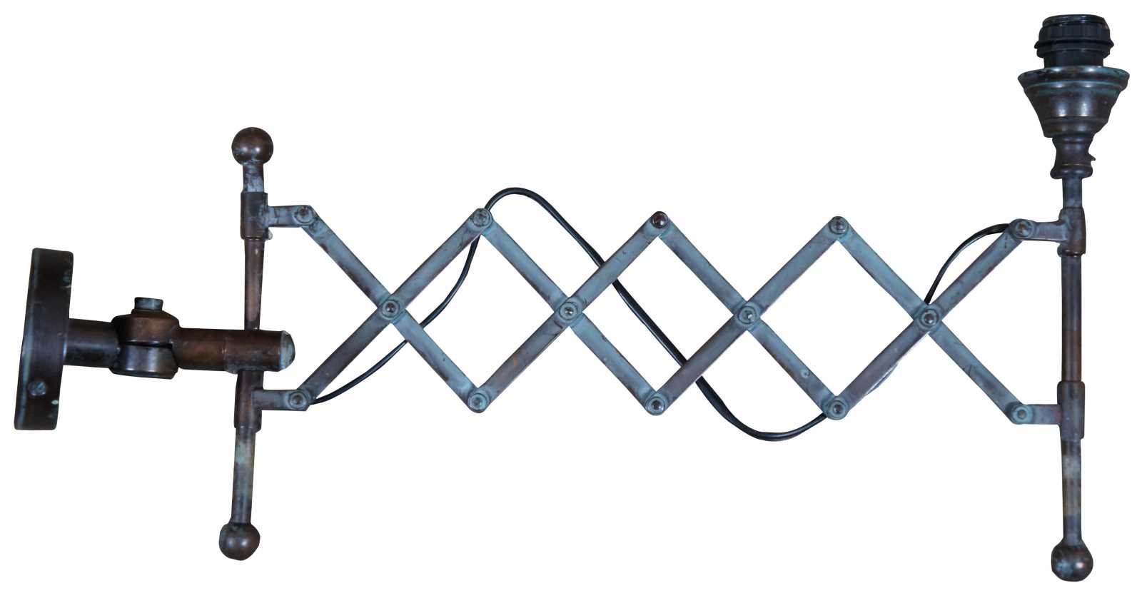 Vintage industrial or steampunk style wall sconce with swiveling accordion style extendable arm.