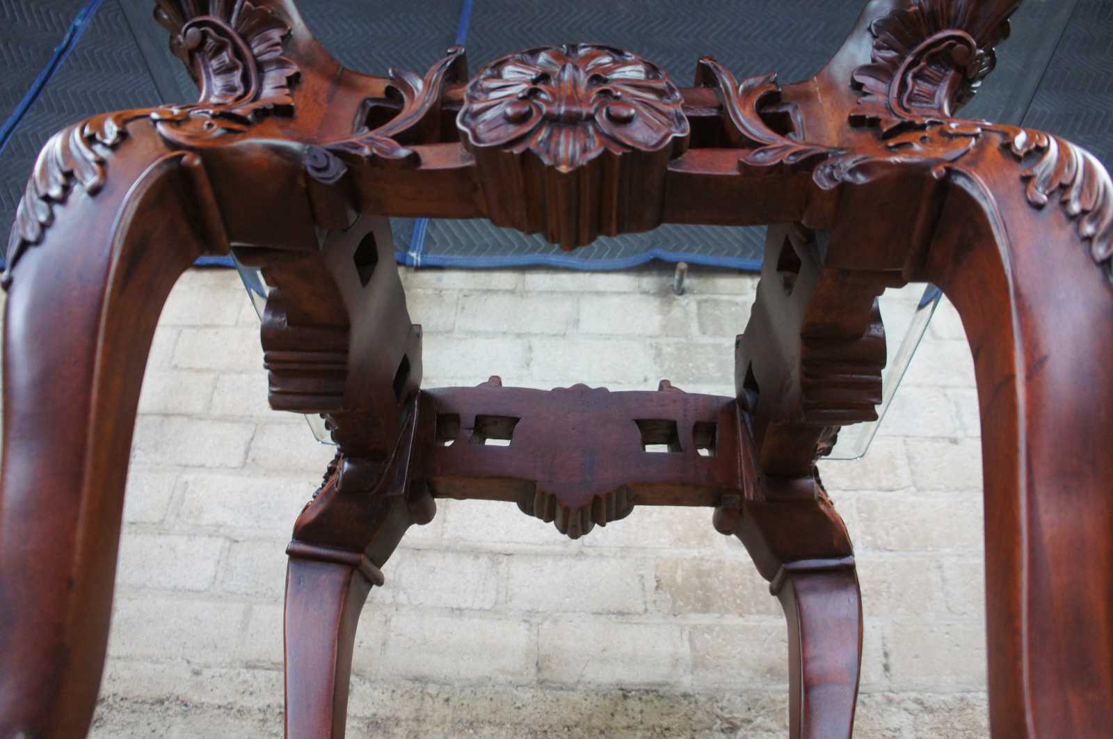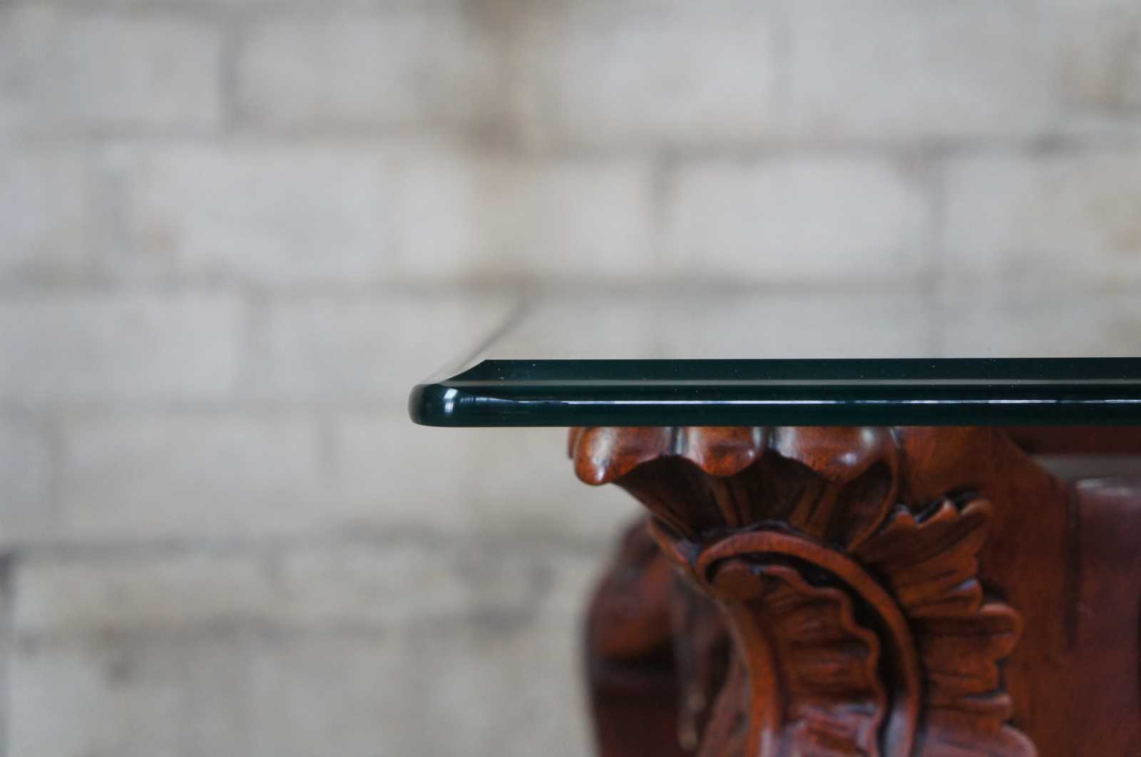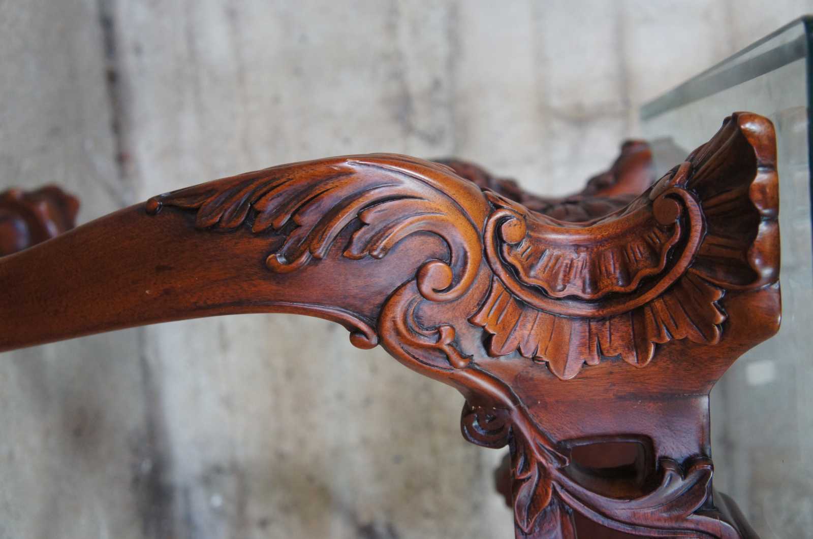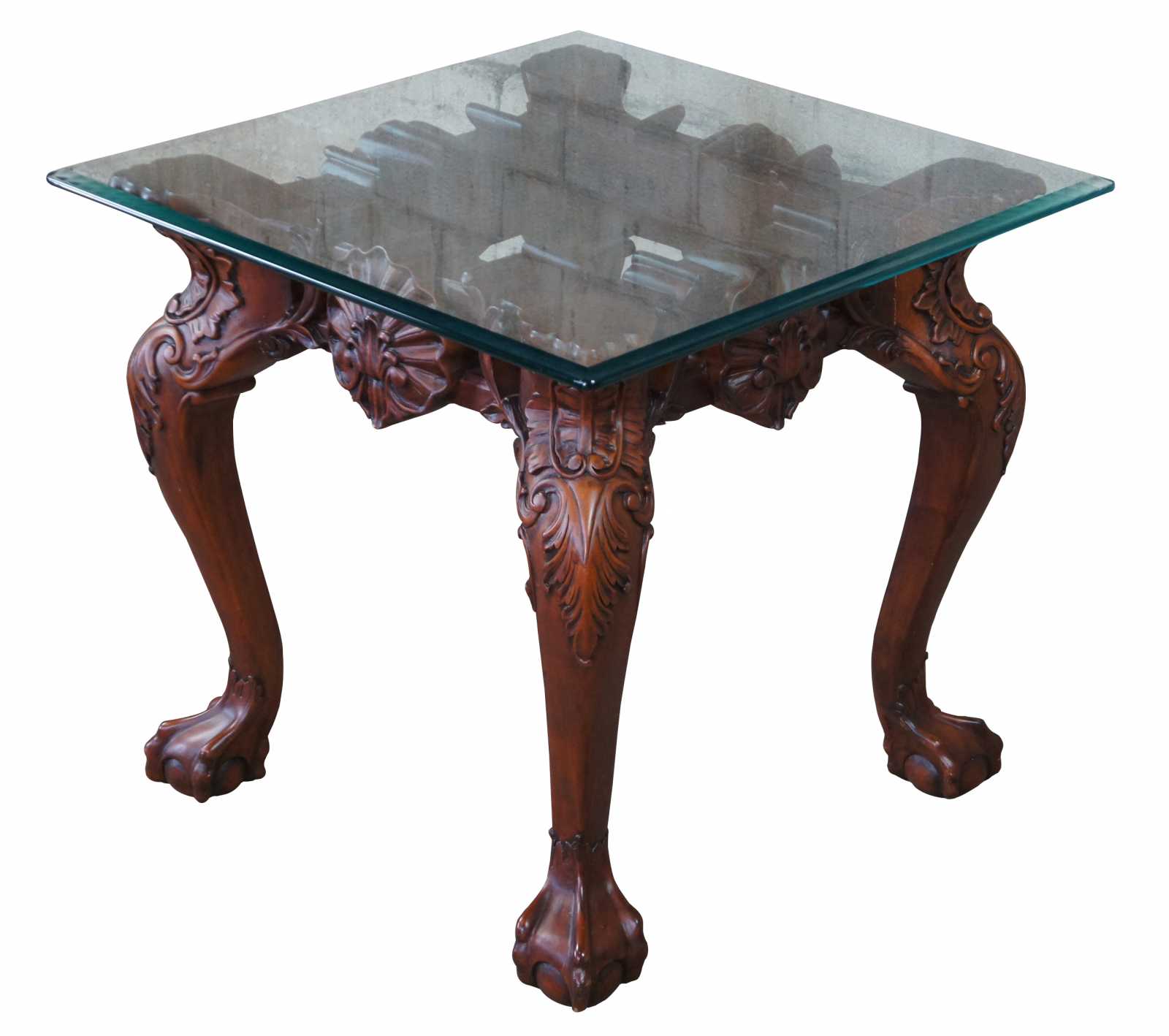Late 20th century mahogany and glass top side, end or accent table. Features ornate chippendale styling with scalloped accents, scrolled legs, and ball and claw feet.