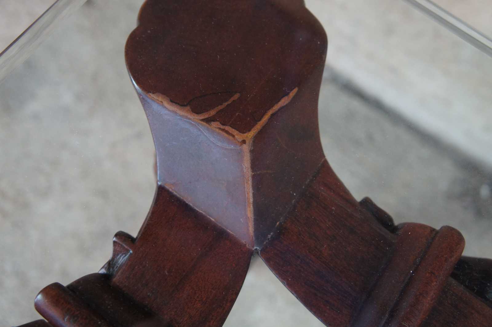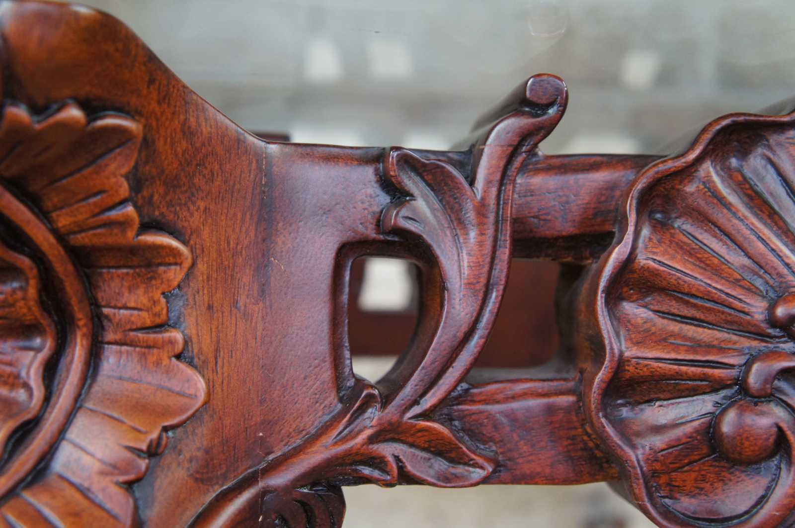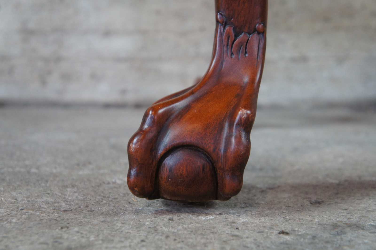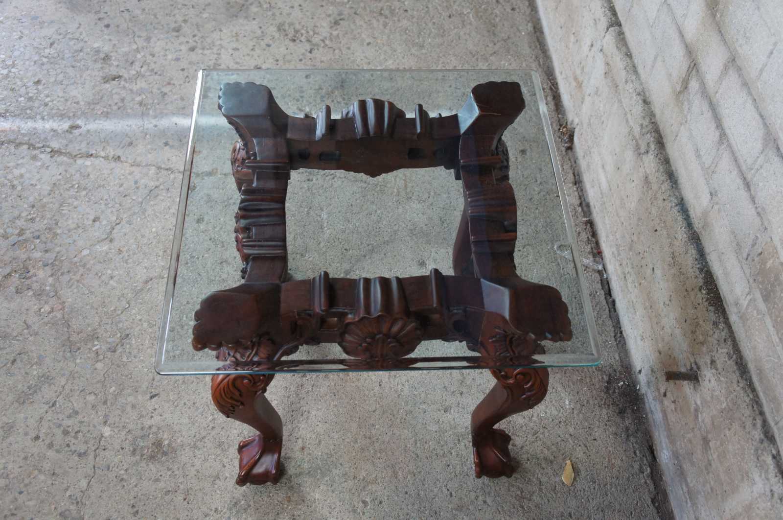 Late 20th century mahogany and glass top side, end or accent table. Features ornate chippendale styling with scalloped accents, scrolled legs, and ball and claw feet.