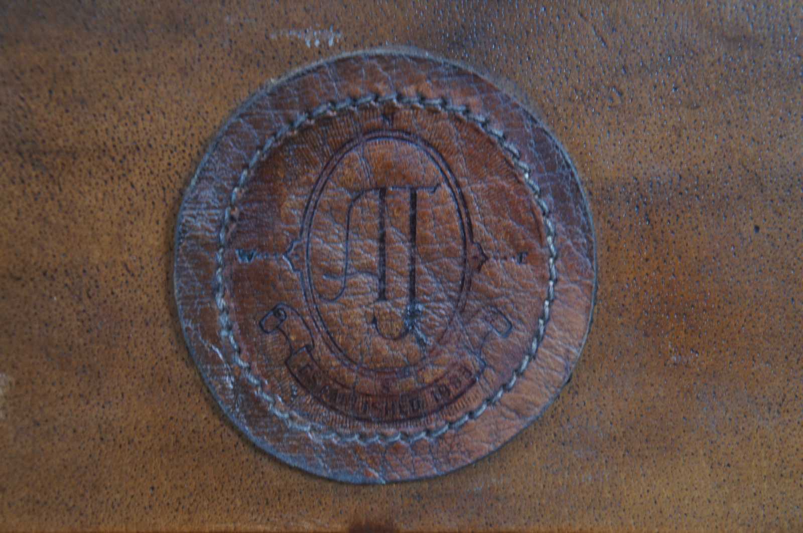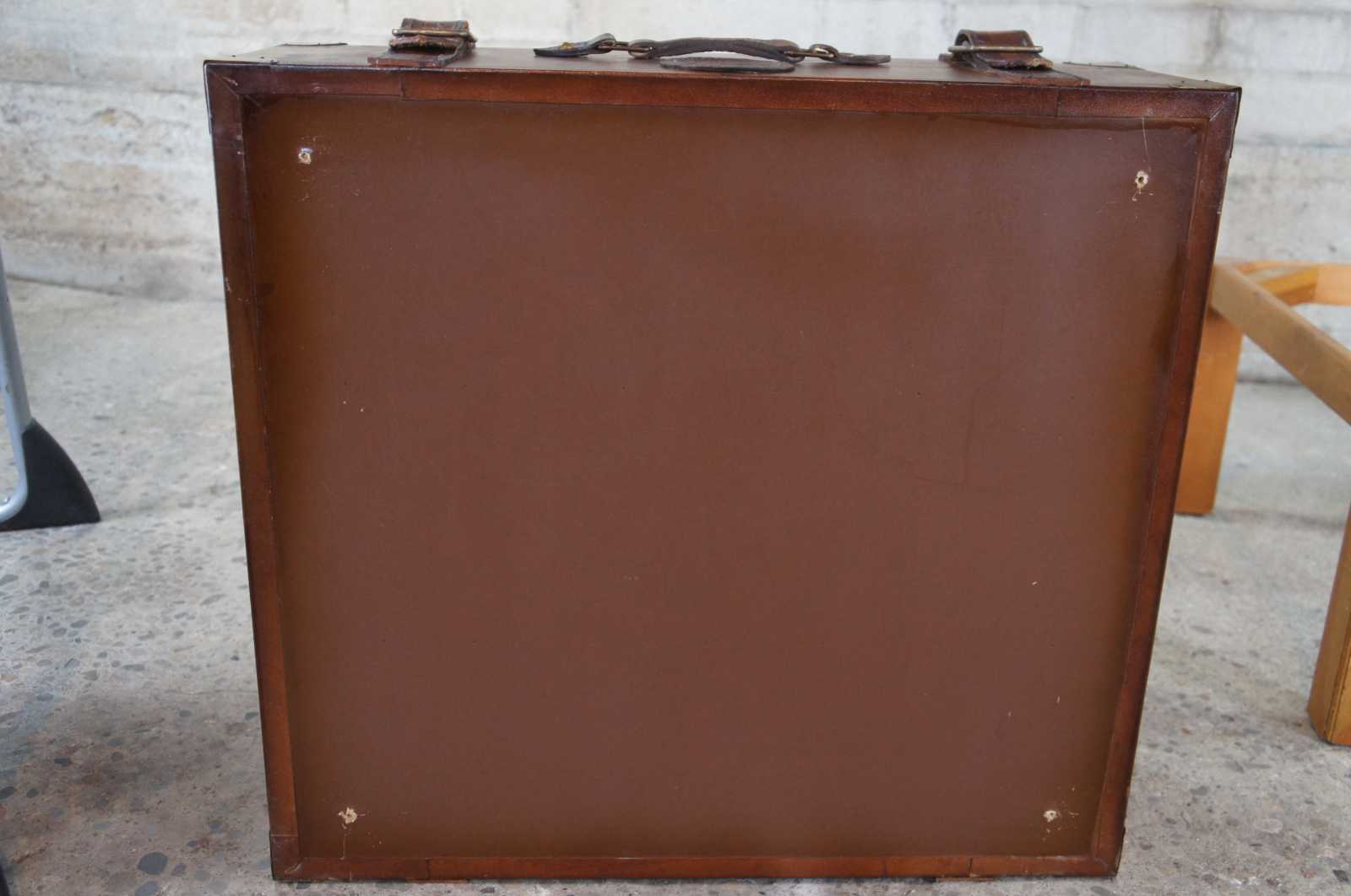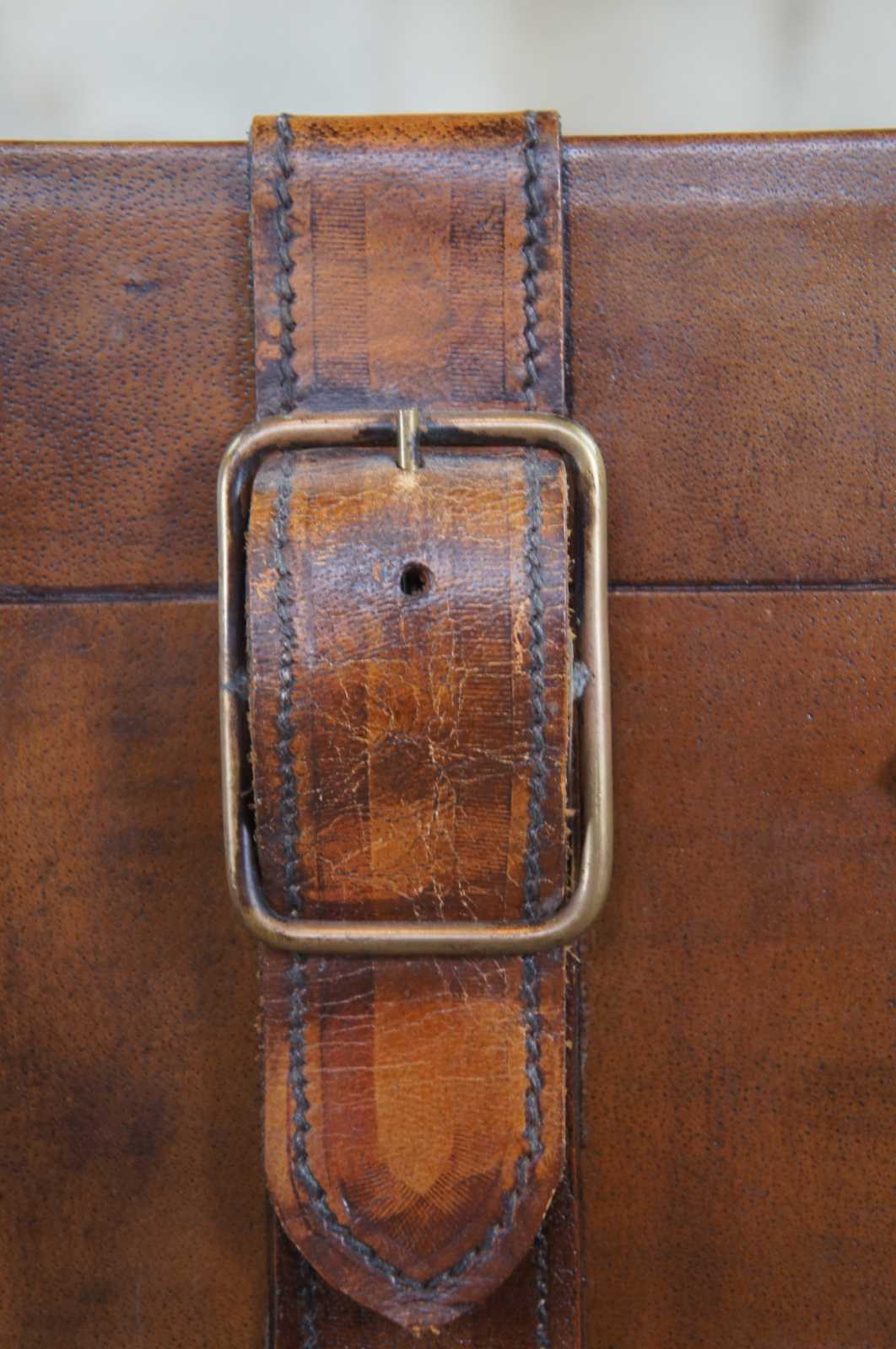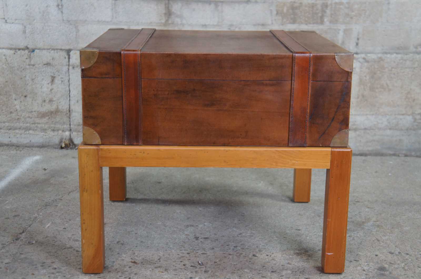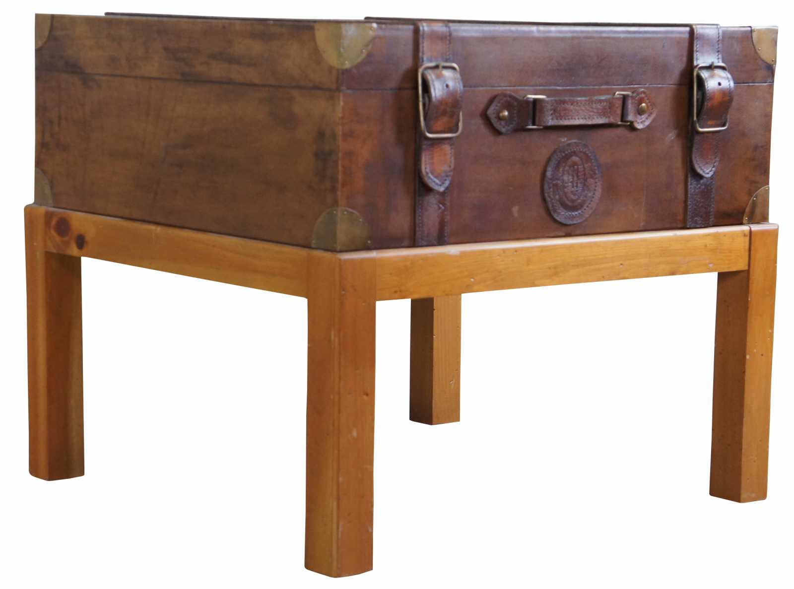 Vintage 1994 leather steam trunk on Pine stand. Features straps and brass covered corners. Trunk does not open