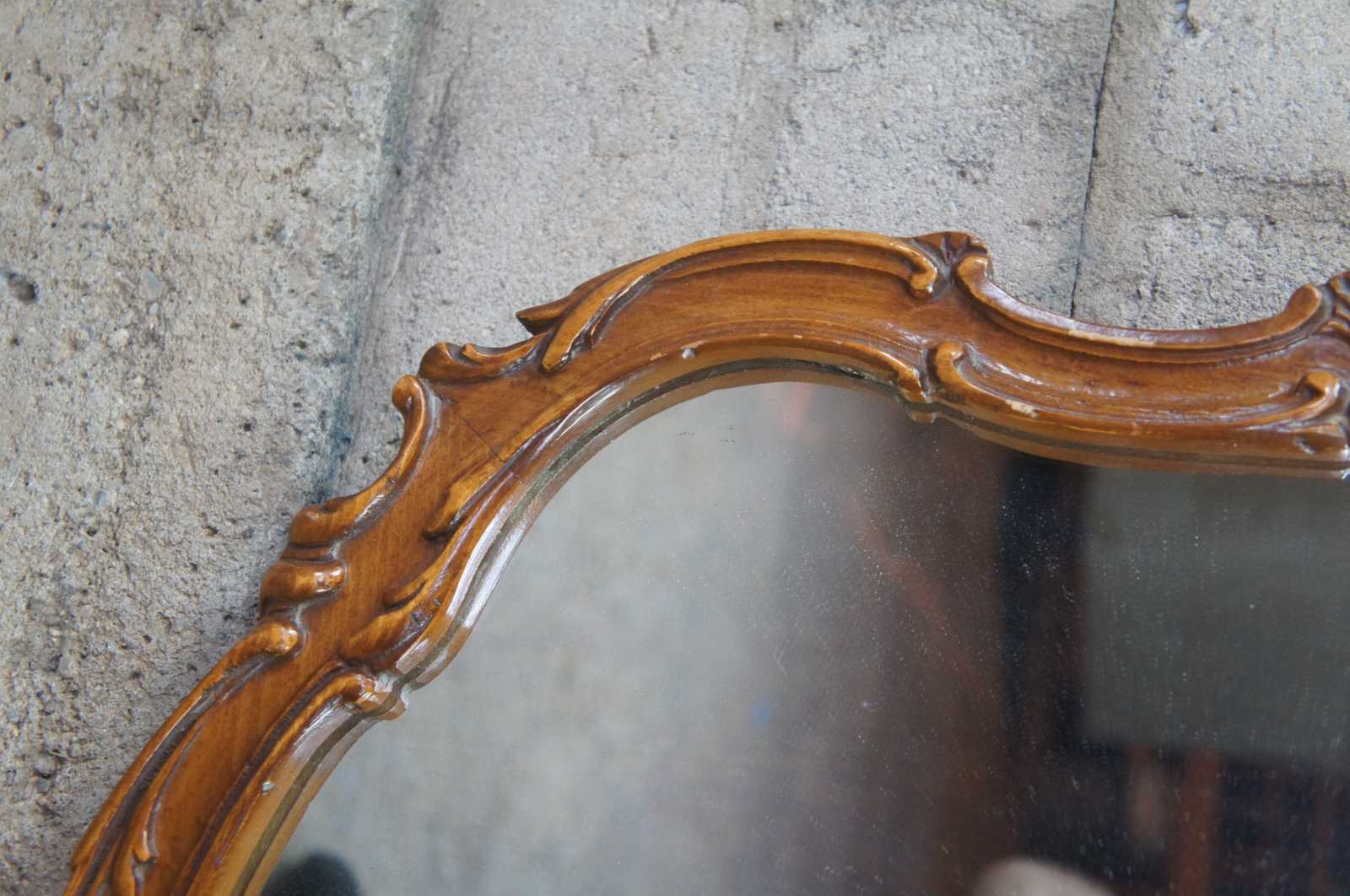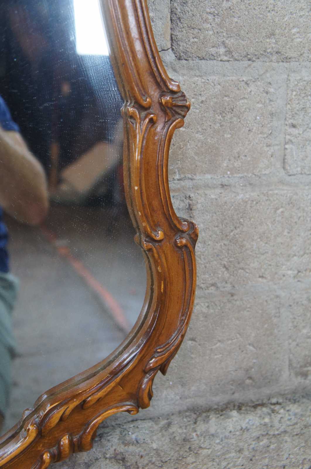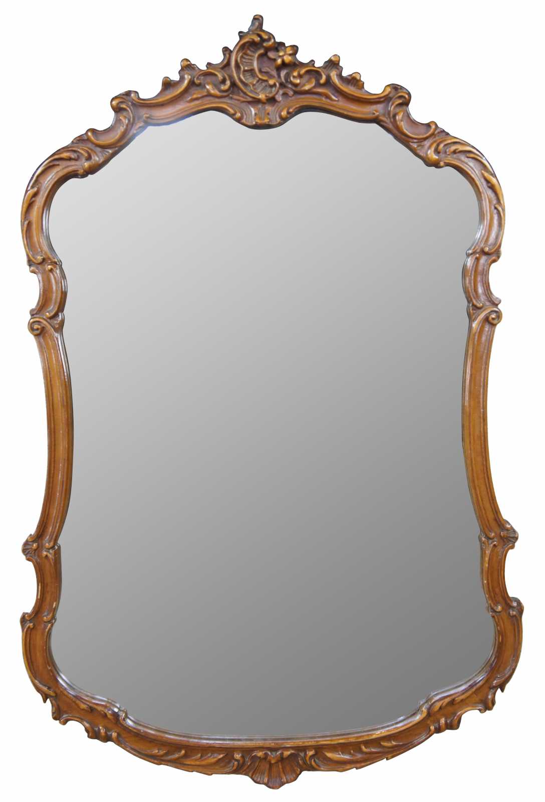 Pair of 1940s French wall mirrors. Made from walnut with ornate scalloped design.