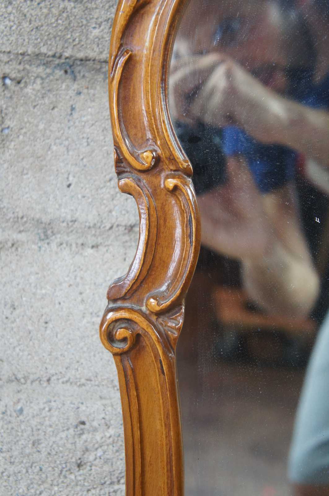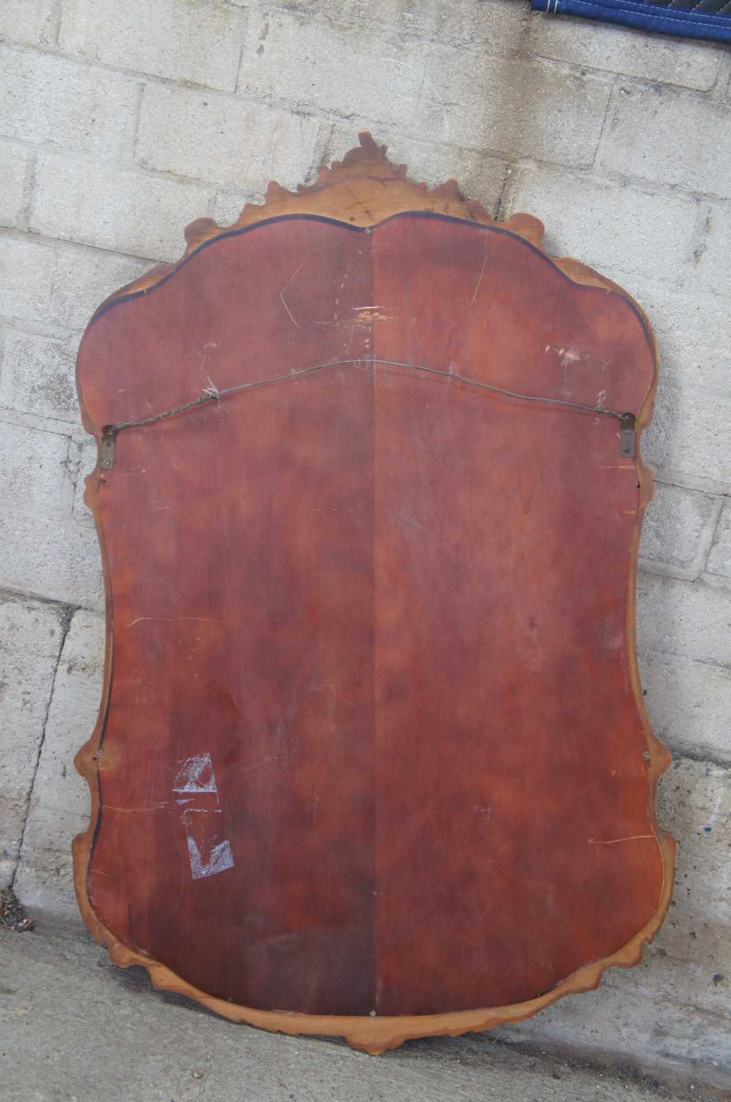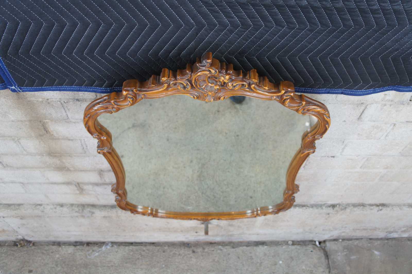 Pair of 1940s French wall mirrors. Made from walnut with ornate scalloped design.