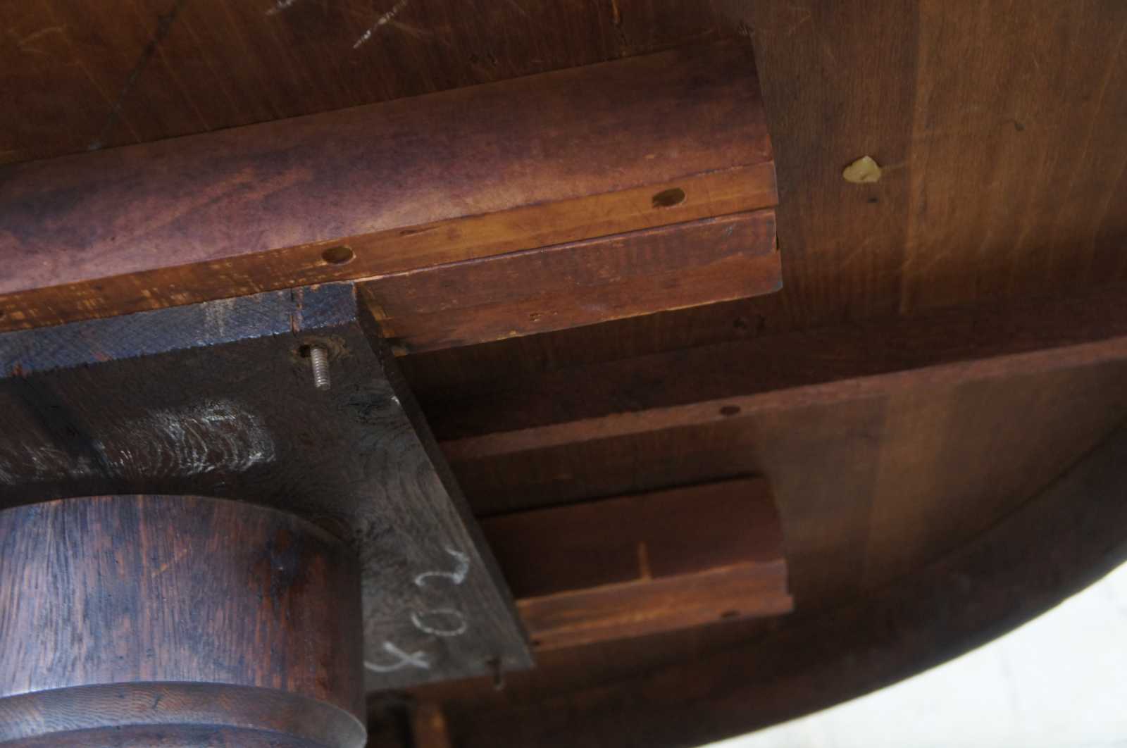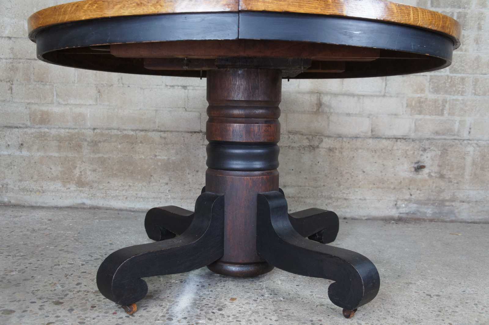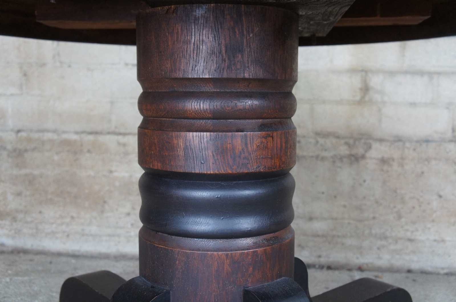 Antique Victorian round dining or breakfast table. Made of oak featuring round top and pedestal base with swivel castors.