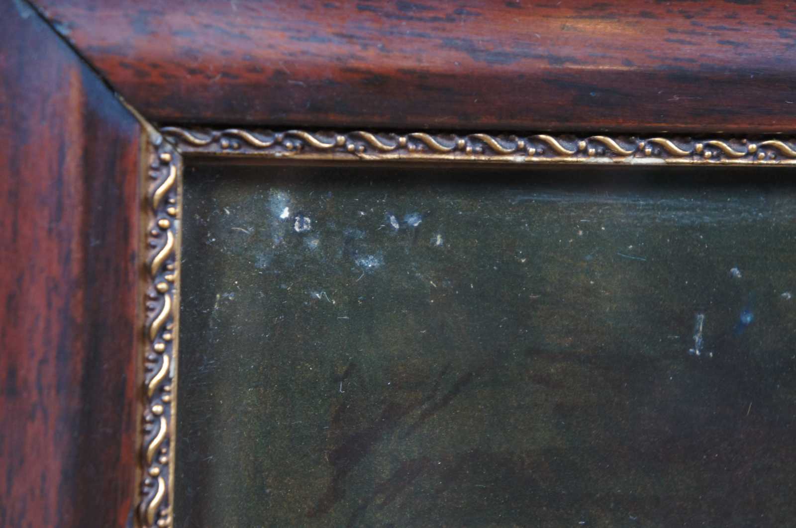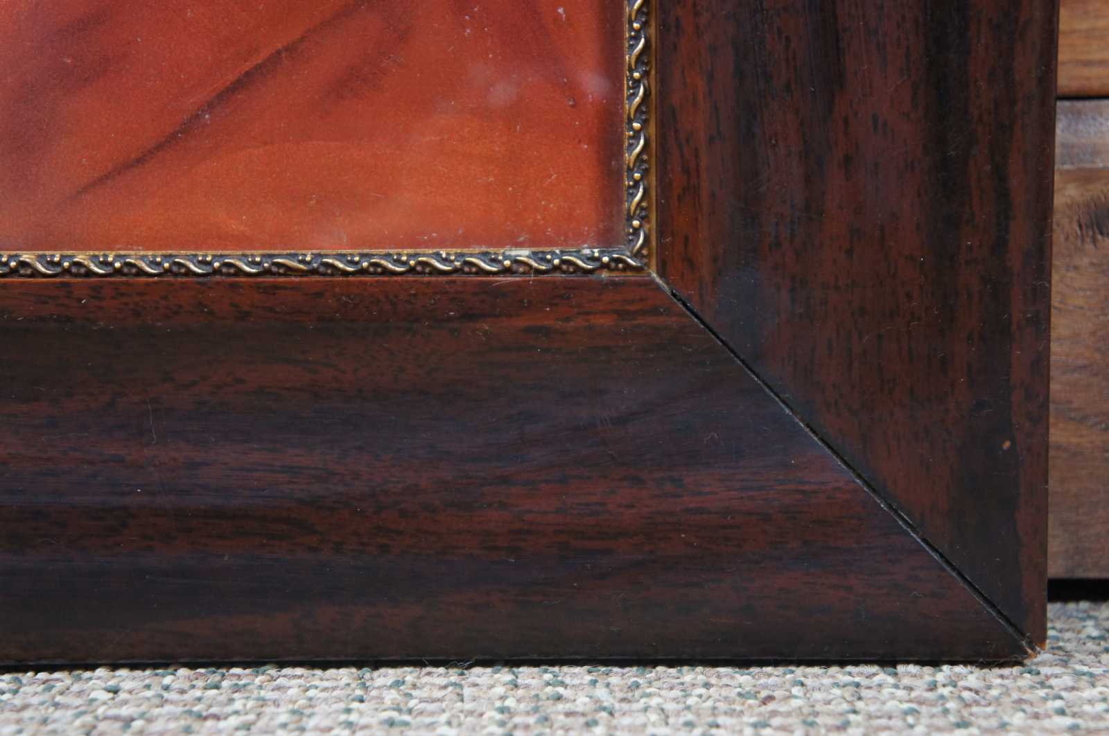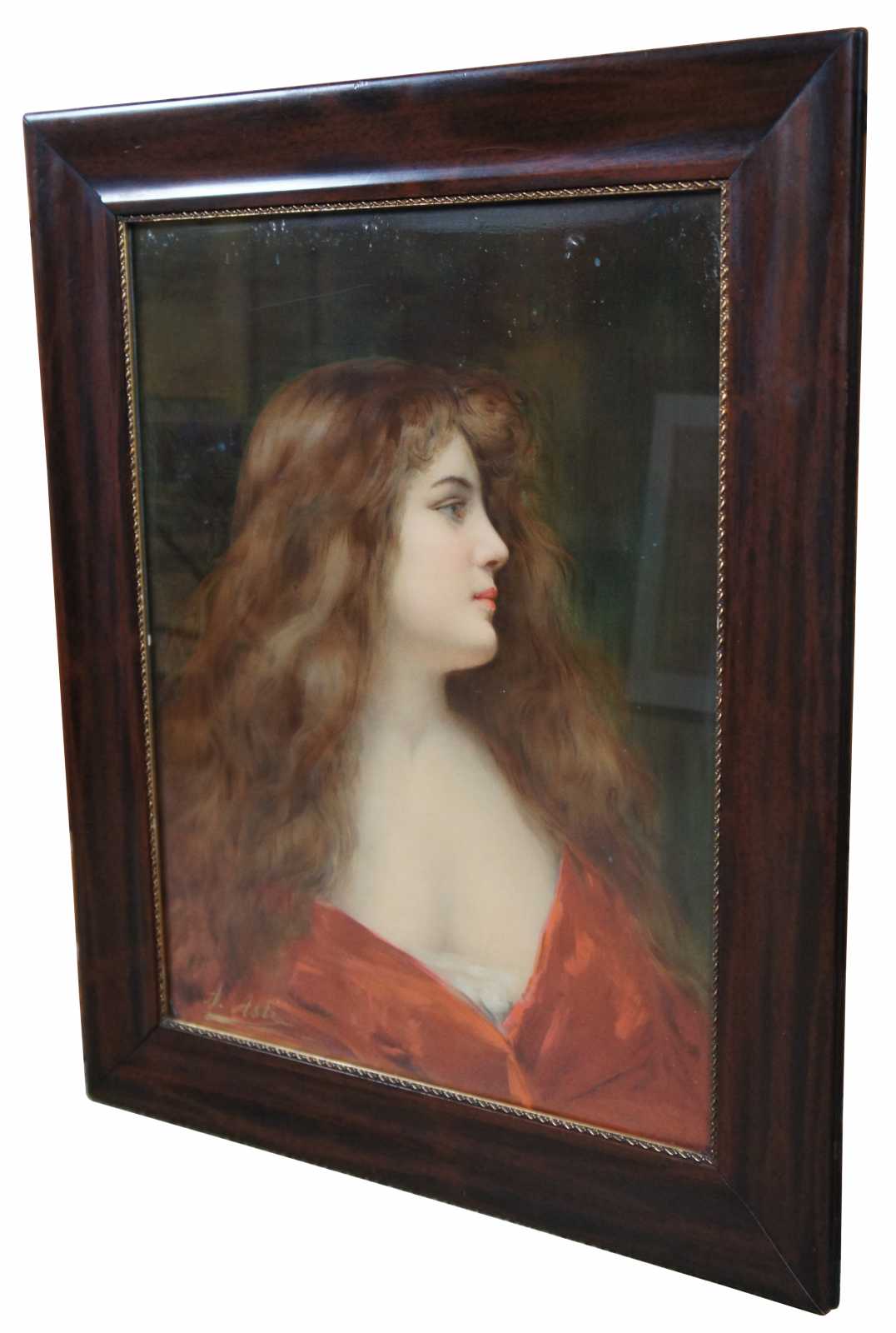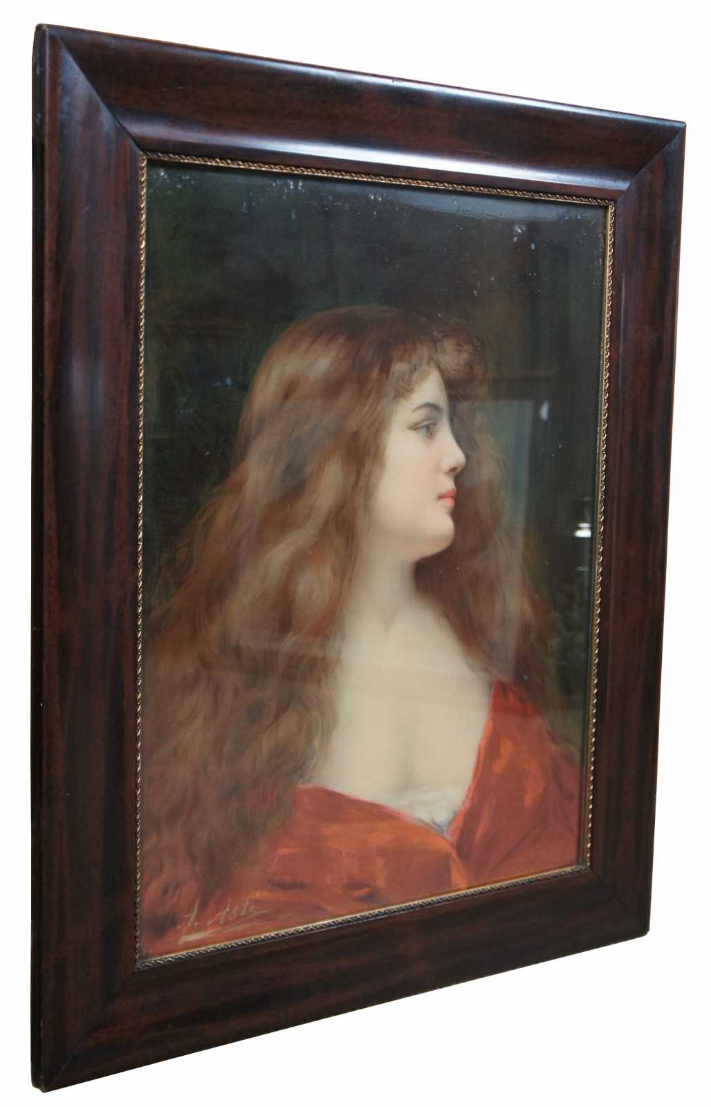 Antique chromolithograph advertising print after Angelo Asti portrait of a maiden in red, Includes a Victorian era mahogany frame