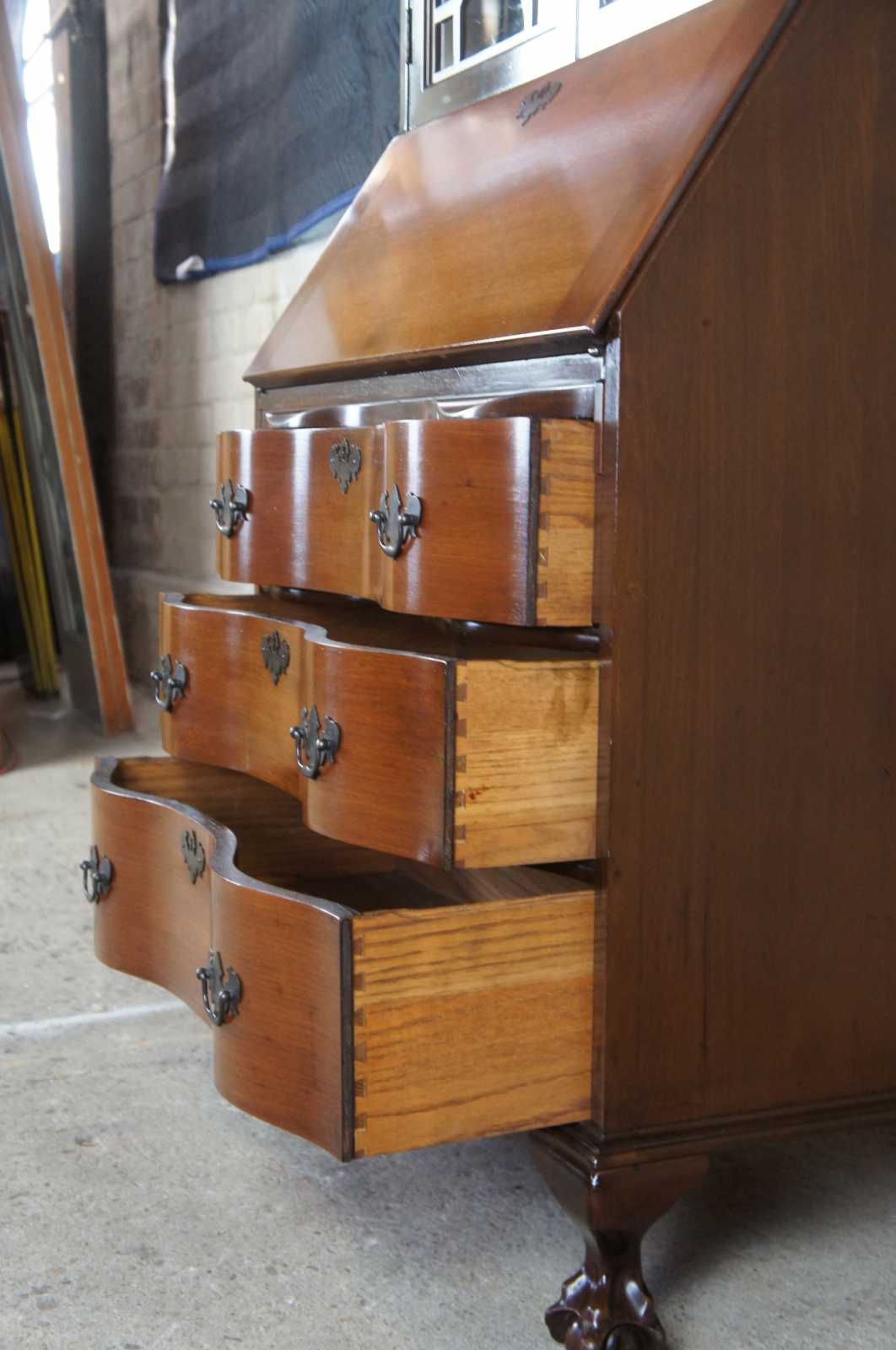 A gorgeous serpentine front one piece secretary desk by Maddox Tables of Jamestown NY. Made from American mahogany. Interior opens to four drawers and multiple divided and hidden compartments. Upper bookcase portion shows an open pediment with turned trophy finial. Doors are glass with fretwork. There are 2 interior bookcase shelves. Hardware is made of brass in classic Chippendale fashion, circa 1940s.