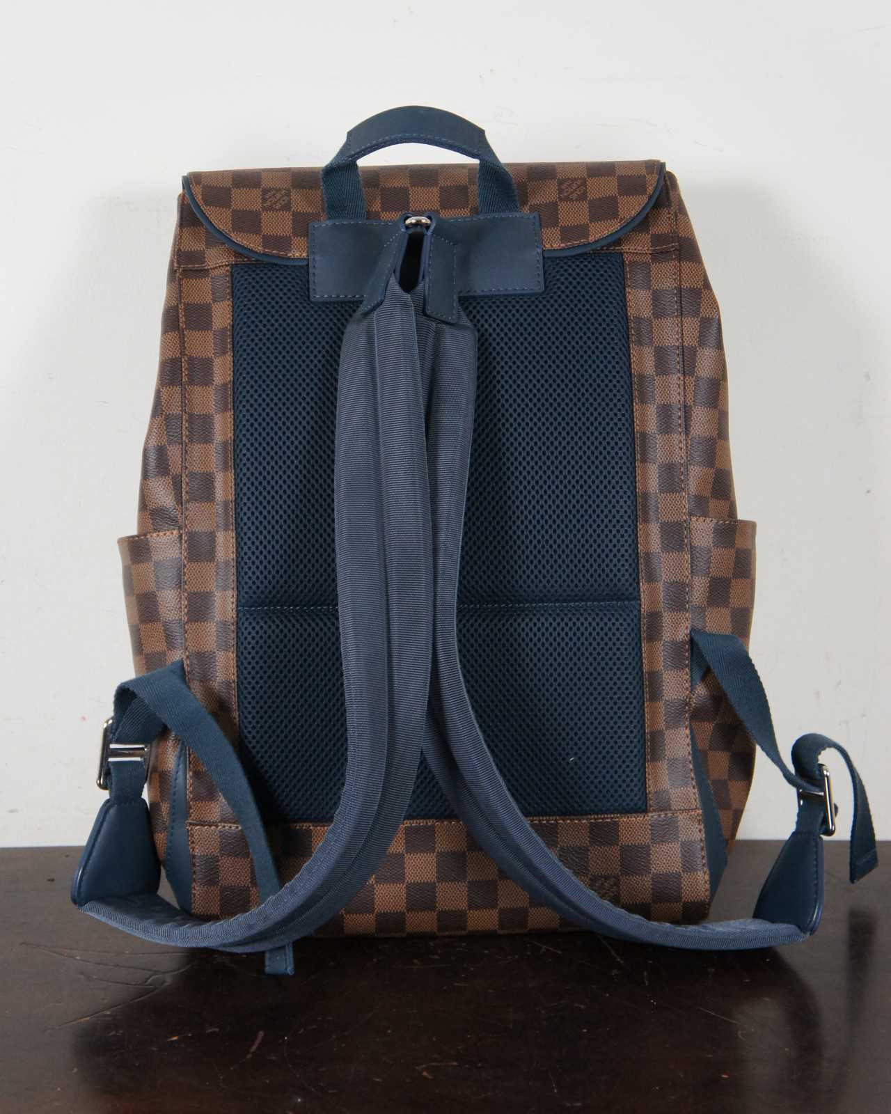100% Authentic Louis Vuitton Damier Ebene runner backpack in brown check with navy blue leather trim. Includes dust bag and original tags.