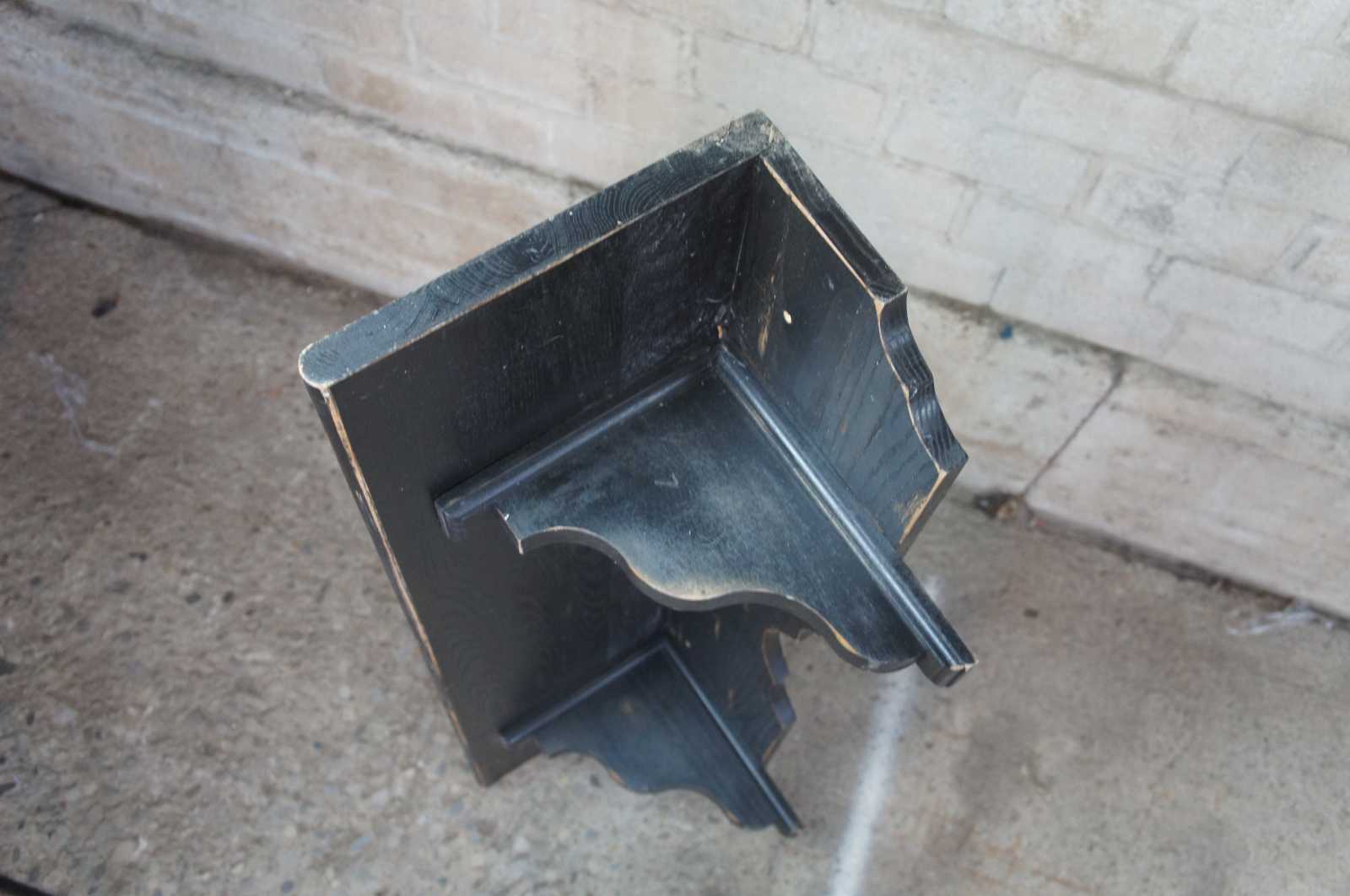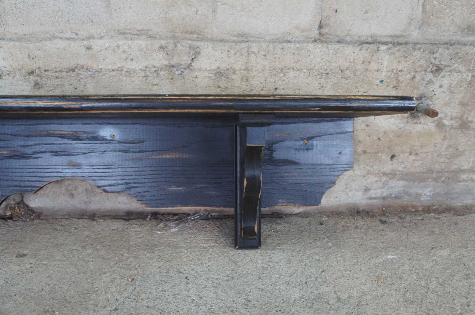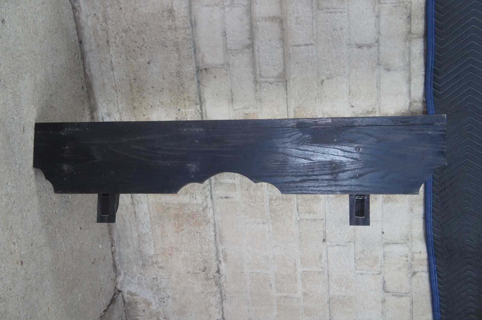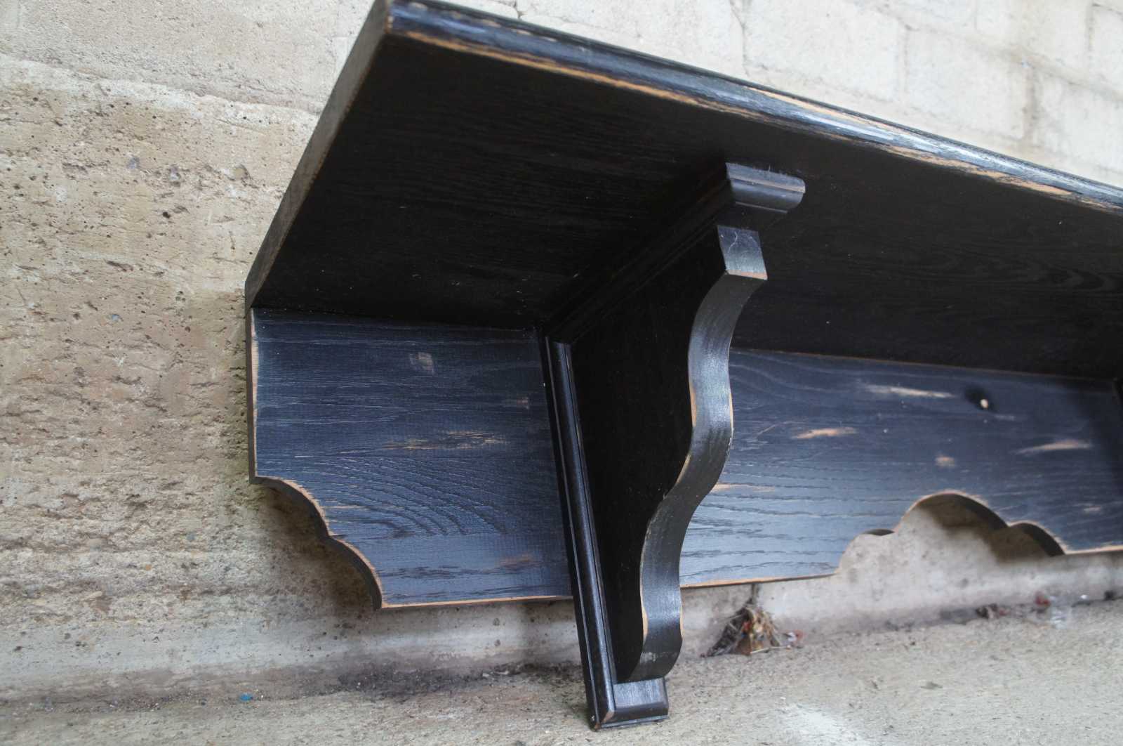 Late 20th century black washed oak wall shelf. French country or farmhous style. Great for storage or display. Hooks can be added to make it a hall tree.