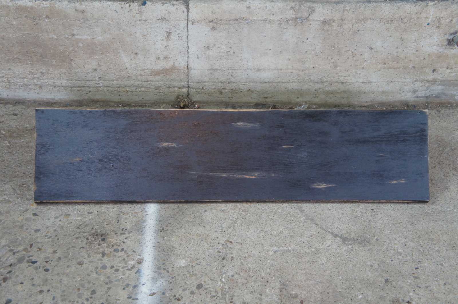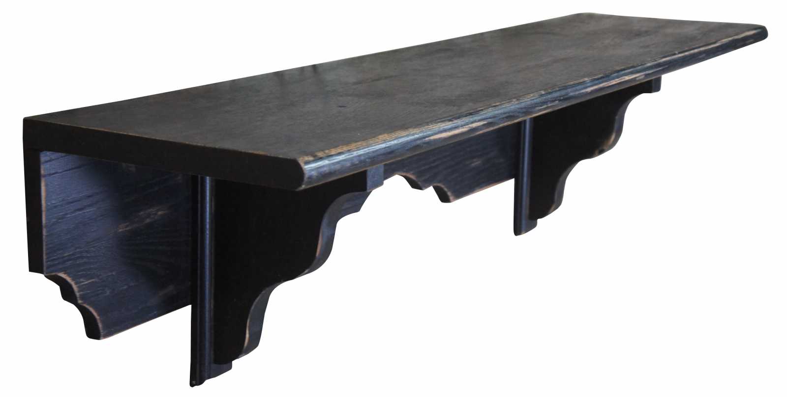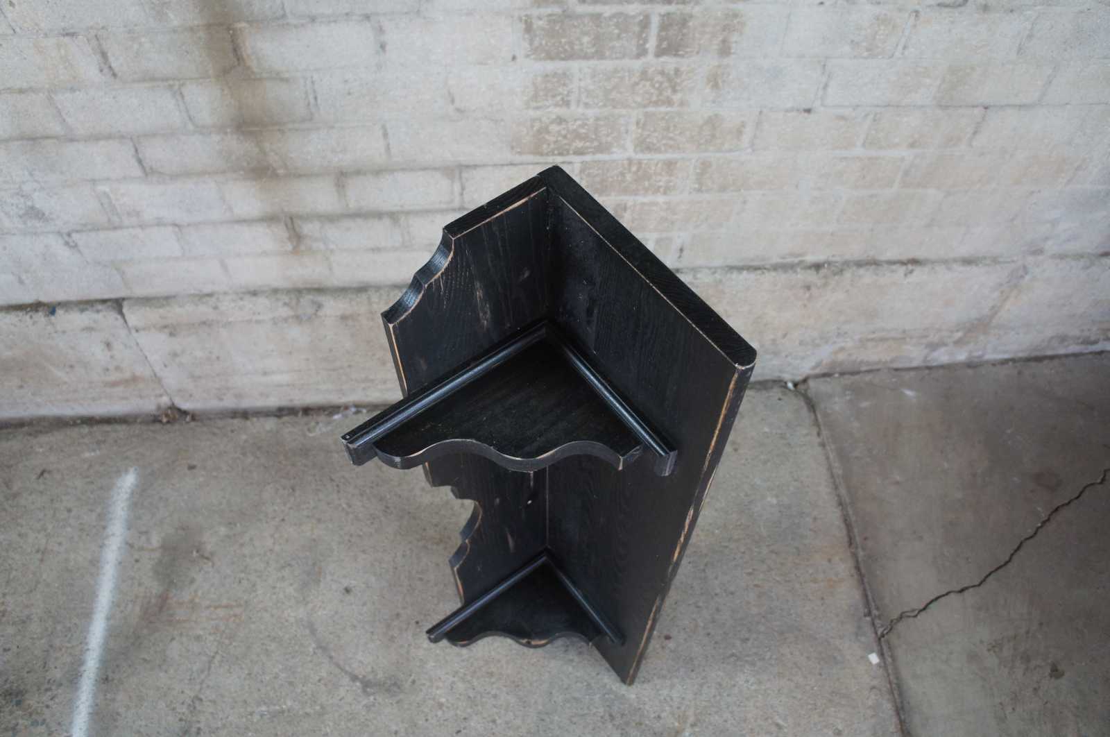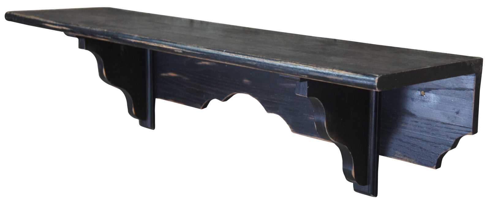 Late 20th century black washed oak wall shelf. French country or farmhous style. Great for storage or display. Hooks can be added to make it a hall tree.