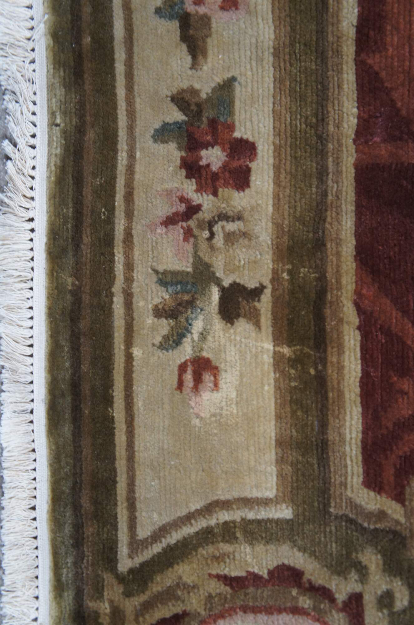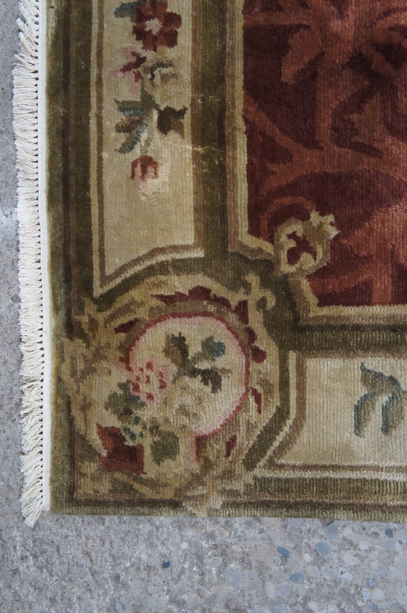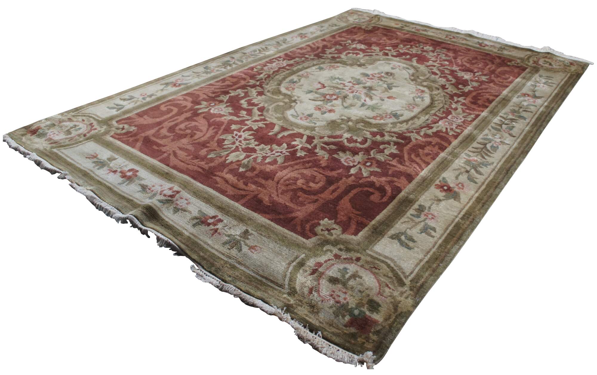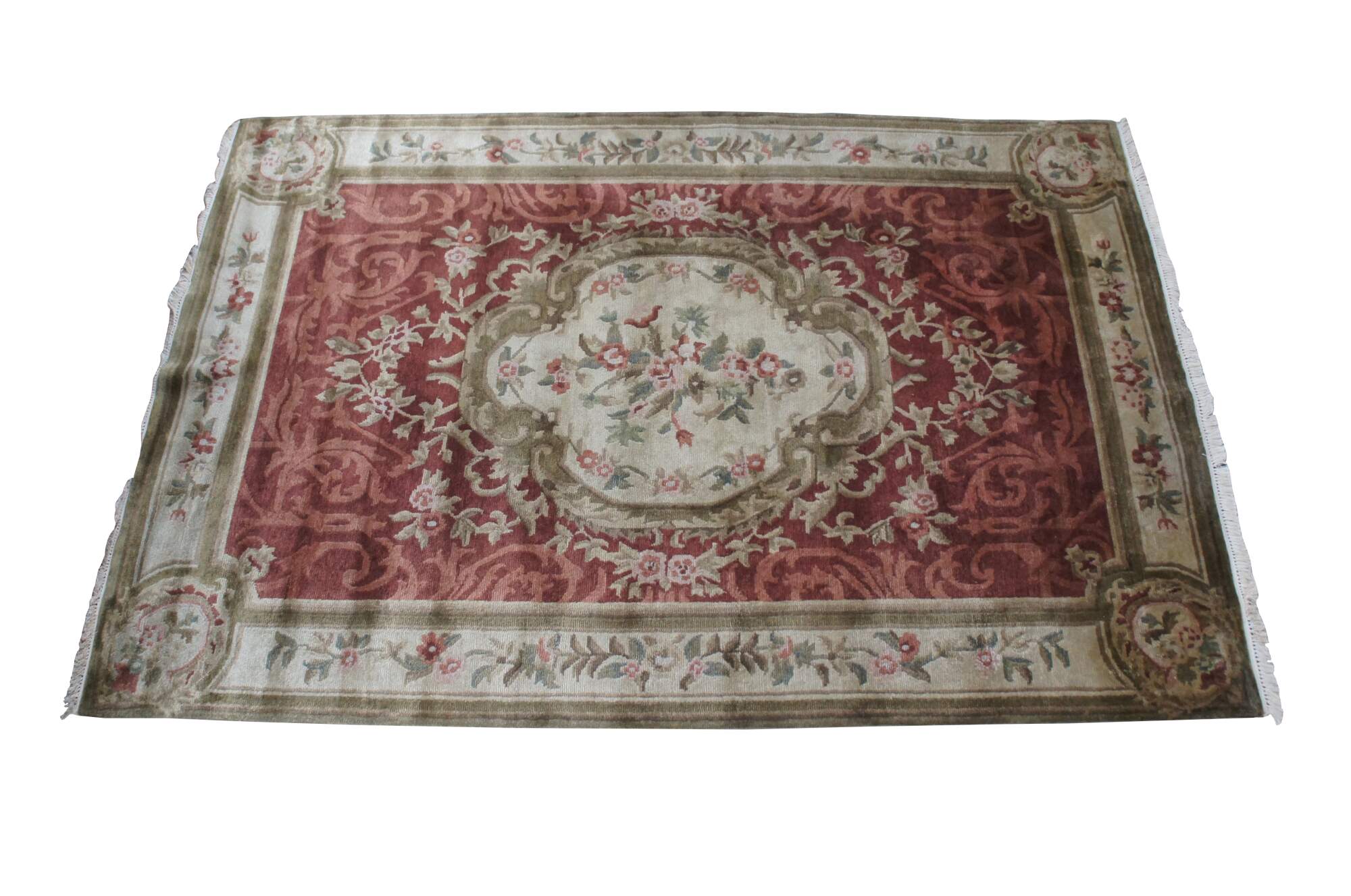 Aubusson is a town in Creuse River France. Aubusson rugs made in tapestry technique are among the most elegant and luxurious floor coverings. This beautiful 6' x 9' handmade area rug is in baroque styling with a floral motif on a field of red with green / tan beige accents. Made from Wool.
