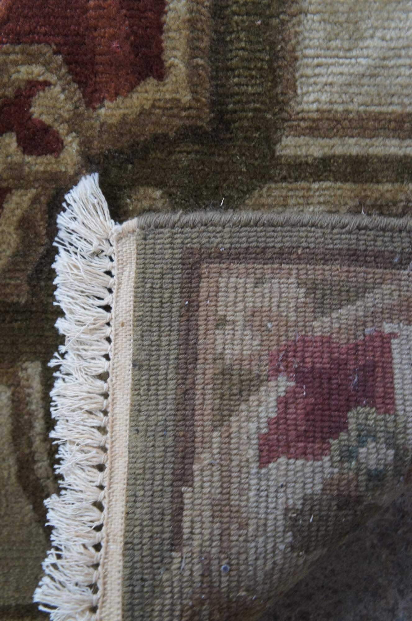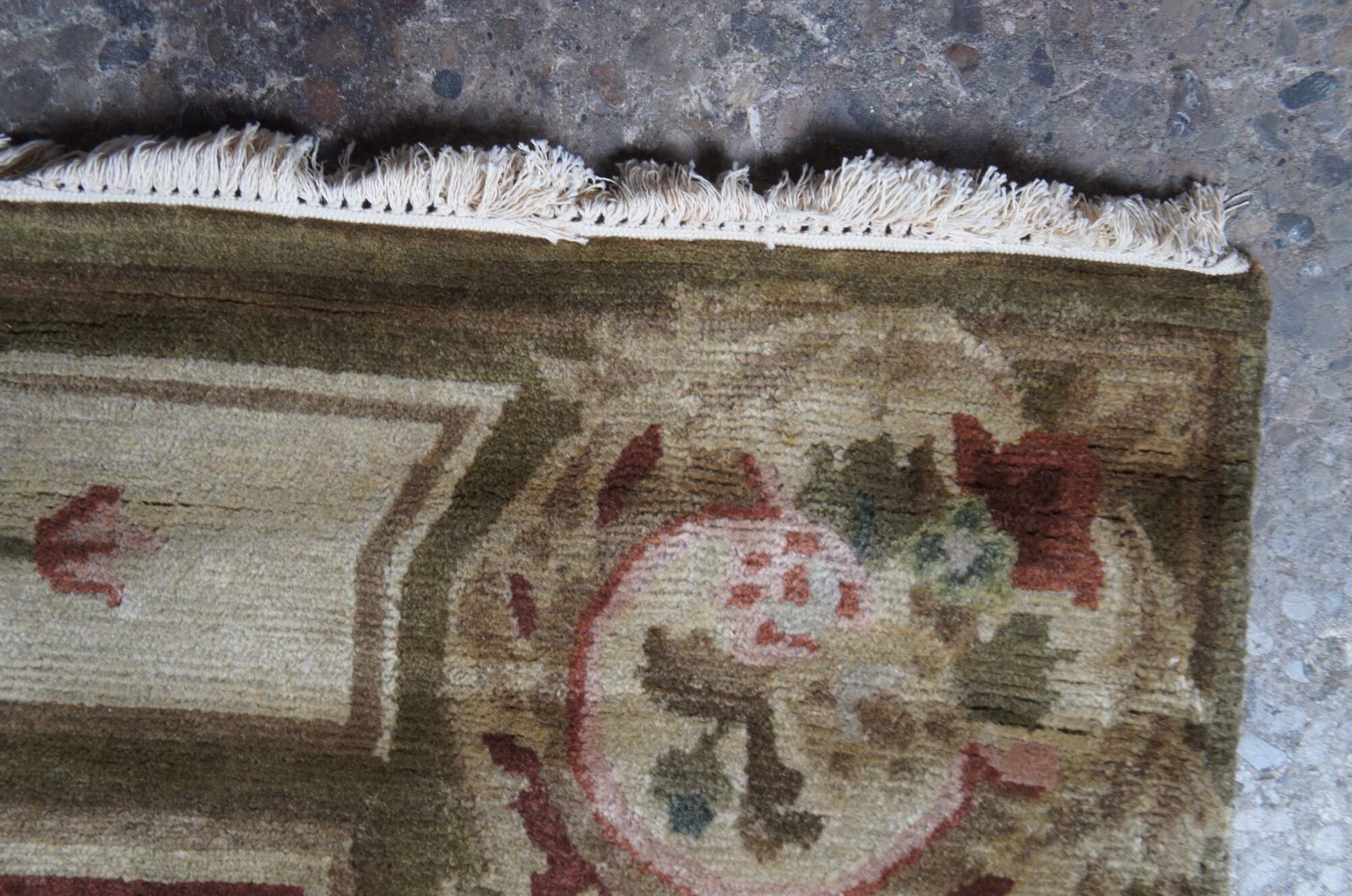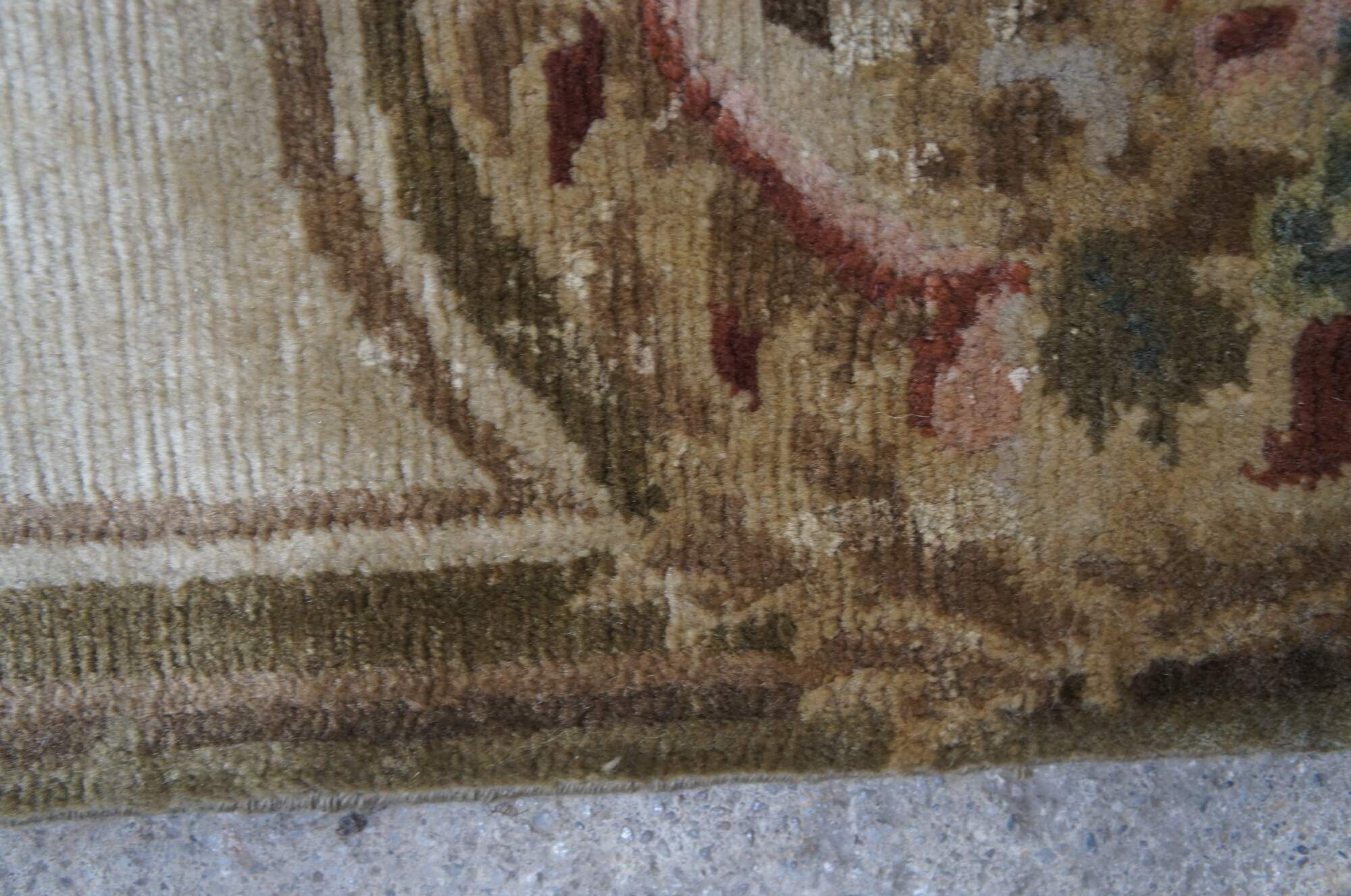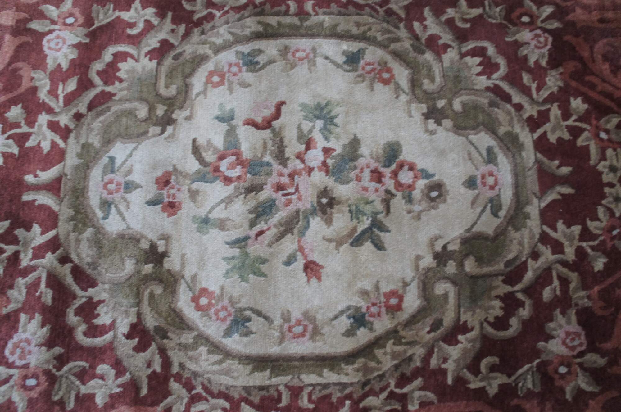 Aubusson is a town in Creuse River France. Aubusson rugs made in tapestry technique are among the most elegant and luxurious floor coverings. This beautiful 6' x 9' handmade area rug is in baroque styling with a floral motif on a field of red with green / tan beige accents. Made from Wool.